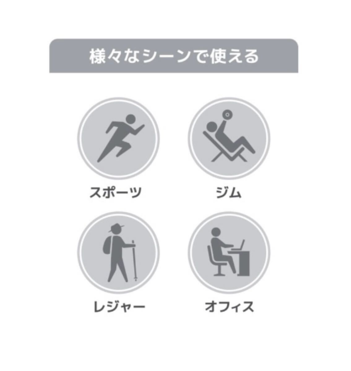 ジムやレジャー、オフィスなど様々なシーンで使えます。