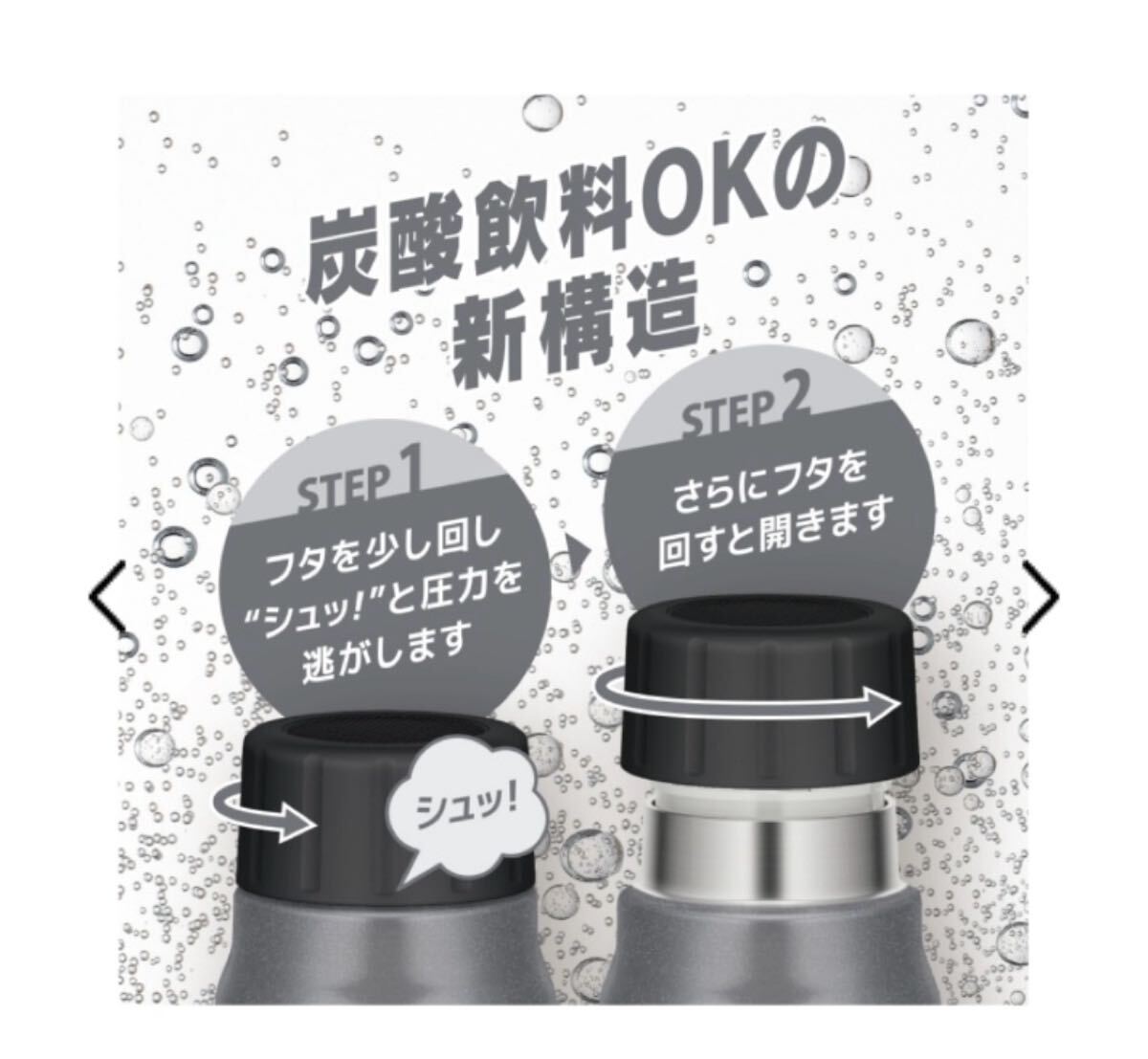 炭酸飲料OKの新構造で、炭酸飲料を冷たいまま持ち運びできます。フタを少し回すと"シュッ!"と圧力が抜け、