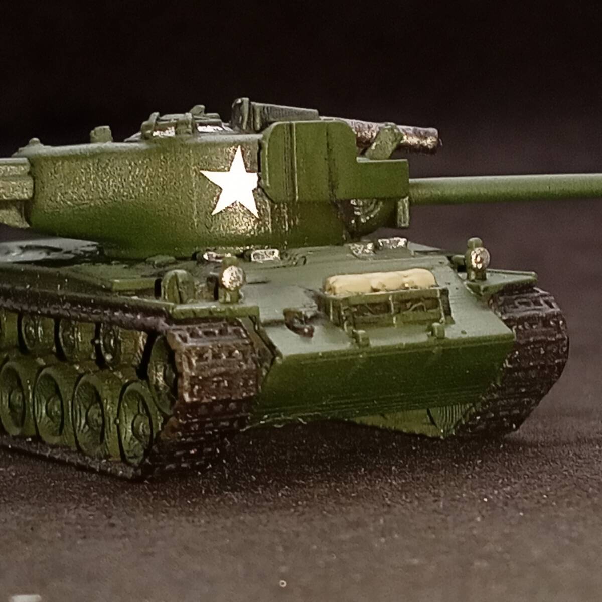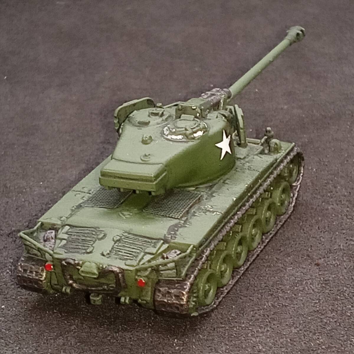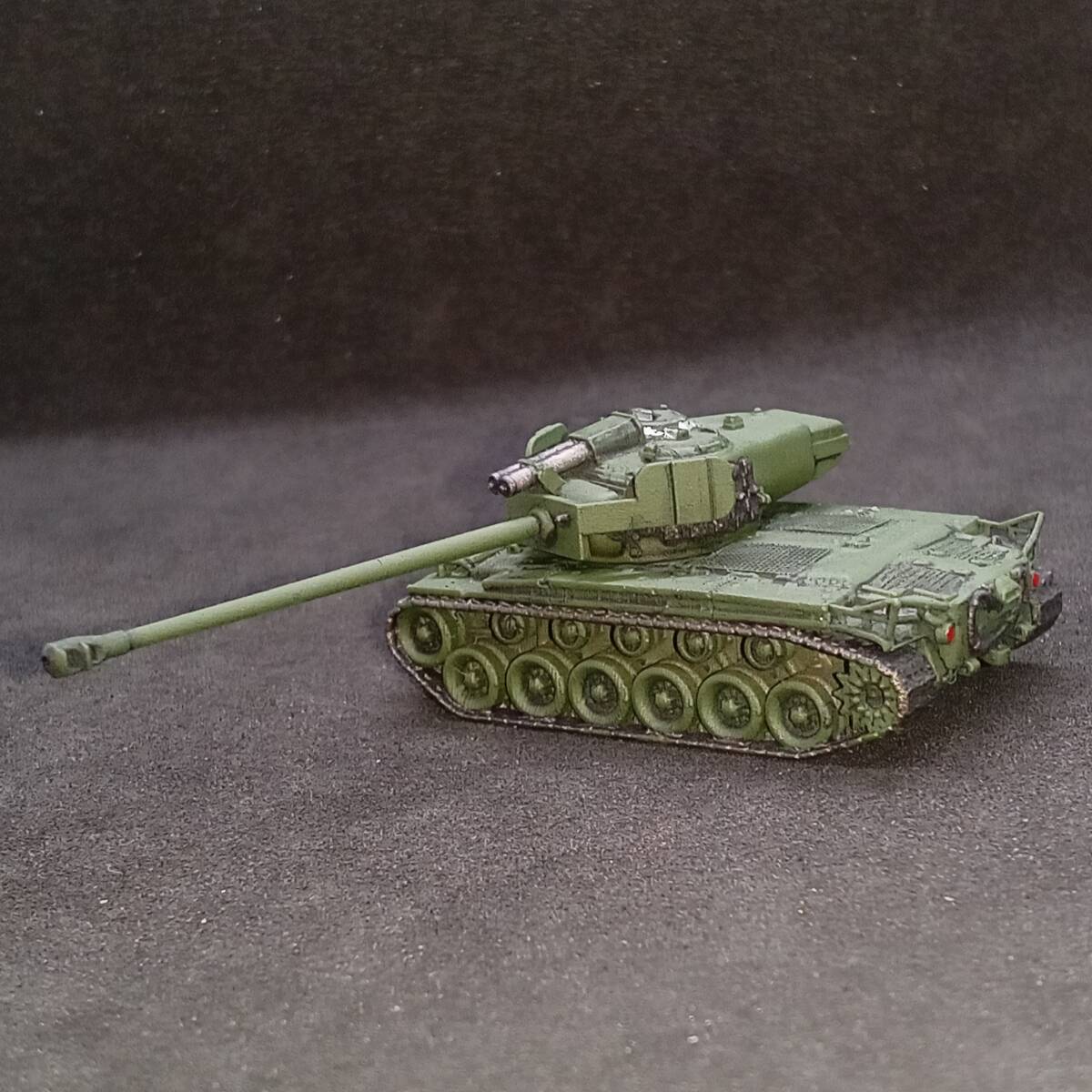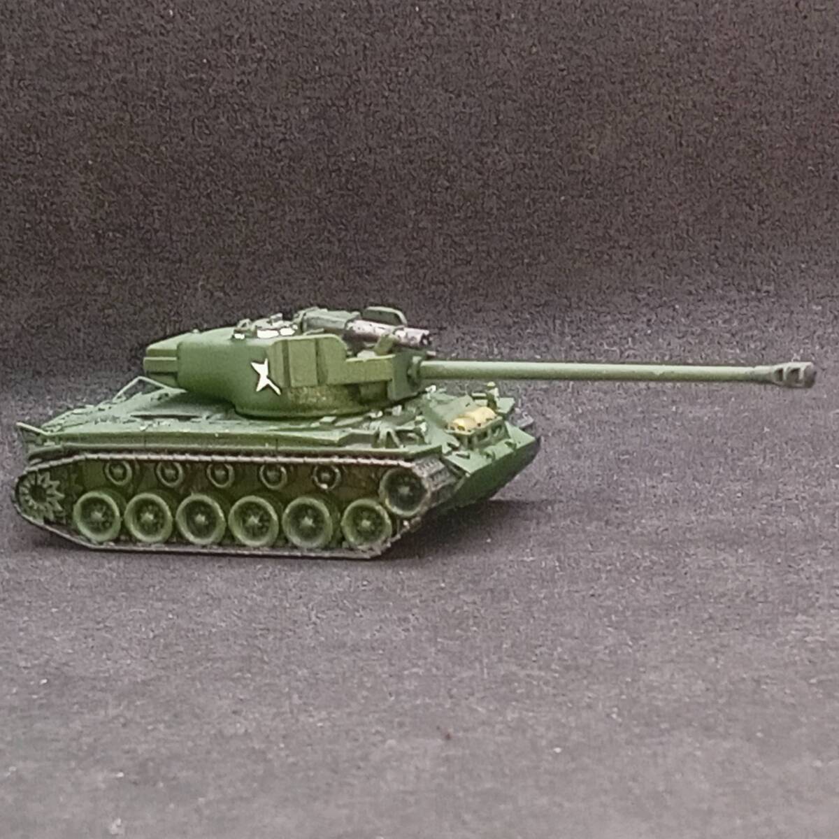 1.商品説明 1/144 スーパー・パーシング重戦車,”王虎を撃破せよ!超長砲身!”,出品2,グリーン塗装,アメリカ,WW2,SSMODEL製,自作ver. 塗装済み完成品。出品2は★マーク。グリーン塗装。 【かんたん解説】 アメリカ軍の重戦車。第二次世界大戦。戦争末期。 M26パーシング重戦車は 大戦末期の1945年から実戦投入された。 M4シャーマンが 歩兵支援の戦車だったのに対し、 M26は 戦車戦用に設計された戦車で アメリカ最強の戦車となった。 パンター、ティーガーといった 強力ドイツ戦車を撃破できたが、 アメリカ軍の懸念は 新たに登場していた ケーニヒスティーガー(王虎)重戦車だった。 火力と装甲は極めて強力で、 第二次世界大戦では 最強の戦車と評価される。 アメリカの切り札、 M26でも敗けてしまう。 アメリカ軍は懸念を拭えない。 アメリカには苦い経験がある。 ティーガー恐怖症。 ティーガー重戦車と 初対戦したアメリカ軍は ものの見事に蹂躙(じゅうりん)された。 M4シャーマンの砲弾は ティーガーの重装甲に弾き返され、 熟練のドイツ兵が操る ティーガーの8.8cm砲は M4シャーマンを簡単に炎上させた。 「M4はマッチのように燃えあがる!」 「俺たちは座り込んだアヒル同然だ!」 アメリカ軍には無力感が広がり、 ティーガーに似た戦車が現れただけで 恐慌状態に陥り、敗走する部隊もあった。 アメリカ軍は M26を配備することで ティーガー恐怖症の特効薬とした。 だが、 ケーニヒスティーガーの登場で 恐怖症の再発が起こりうる。 ケーニヒスティーガー相手では M26パーシングでも分が悪い。 ケーニヒスティーガーを撃破すべく、 M26も強化型の開発が行われた。 これが本車、 スーパー・パーシングだ。 主砲は同じ口径の90mmだが、 長砲身70口径のものとなった。 (※M26は50口径) 大型車体にさえ、 不釣り合いなほどの長砲身。 これまでのパーシングで ケーニヒスティーガーを撃破するには 1000m以内に近づいても難しかったが、 スーパー・パーシングは 2000mの距離から これを撃破しうるものであった。 ケーニヒスティーガーの主砲、 長砲身8.8cm砲に匹敵する。 だが、 外見からも分かる通り、 大型の長砲身90mm砲を搭載するために 防盾から砲塔上部にかけて 平衡装置が装着されている。 巨大すぎて主砲の関連装置すべてを 砲塔内に納めきれなかったのだ。 砲弾は 大型主砲の常として、 装薬分離式となり、 再装填には時間がかかった。 試作車輛は ヨーロッパに送られ 第3機甲師団 第635戦車駆逐大隊に配備。 現地では 撃破したパンターの装甲をはぎ取り、 増加装甲として スーパー・パーシングに装着した。 車体にも ボイラー資材の鋼板を 増加装甲に装着。 相当に無理のかかったことが、 一目瞭然で分かる外観。 魔改造を受けた 末期的パーシングというべきか。 このスーパー・パーシングは 1945年4月に ドイツの都市デッサウにて ケーニヒスティーガーと会敵した! 長砲身90mm砲は命中した。 だが、 ケーニヒスティーガーの 前面装甲は貫けなかった。 王虎は接近しようと、 瓦礫の山を乗りあげた。 瞬間、 王虎は砲撃。 長砲身8.8cm砲の敵弾は スーパーパーシングの頭上をかすめた。 王虎は 瓦礫の山をなおも乗り上げ、 弱点である 装甲の薄い 車体底部を見せた。 すかさず、 スーパーパーシングは狙い撃ち、 王虎を撃破した。 スーパー・パーシングは 正面撃破できなかったものの、 勝ちを制したのは確かだ。 スーパー・パーシングは T26E4という試作戦車へと さらに改良され、 1000輌の受注を受けたが、 大戦終了とともに大量キャンセル。 結局25輌の少数生産で 制式化とはならなかった。 とは言え、 魔改造パーシングは 戦車ロマンを醸し、 戦車マニアの目を愉しませる。 2.注意事項 2-1. 評価の悪い御方、神経質な御方はご遠慮下さい。 入札されても、出品者の判断でキャンセル(落札者都合)する場合がございます。 2-2. 落札後2日以内の連絡、4日以内のお支払い願います。 ご連絡・お支払が確認できない場合、落札者都合のキャンセルとさせていただきます。 2-3. ノークレーム・ノーリターンでお願いいたします。 実物とパソコン・スマホの商品画像で印象が異なる場合もございます。 完成品の場合は個人によるハンドペイントのため、レジンキットの場合も材質上、個体差があります。 梱包は厳密を期しますが、輸送中の事故による破損はご自分で修理願います。 3.発送方法 ゆうパケット(おてがる版)か宅急便コンパクトで。ゆうパックおてがる版も対応いたします。 お支払後3日以内に発送いたします。2023/10/04時点での配送料。 3-1. ゆうパケットおてがる版 全国一律230円! 匿名発送。追跡サービス付き。 ポストに直接届きます。配達時間気にせずに! 模型本体のみ発送となります。パケット箱が小型なので模型の外装プラケースは取り外します。 同梱・取り置き対応できません。 3-2. 宅急便コンパクト ゆうパックより安く。 匿名発送。追跡サービス付き。 配達時間指定OK!補償付き。 同梱対応可能です(3個程度