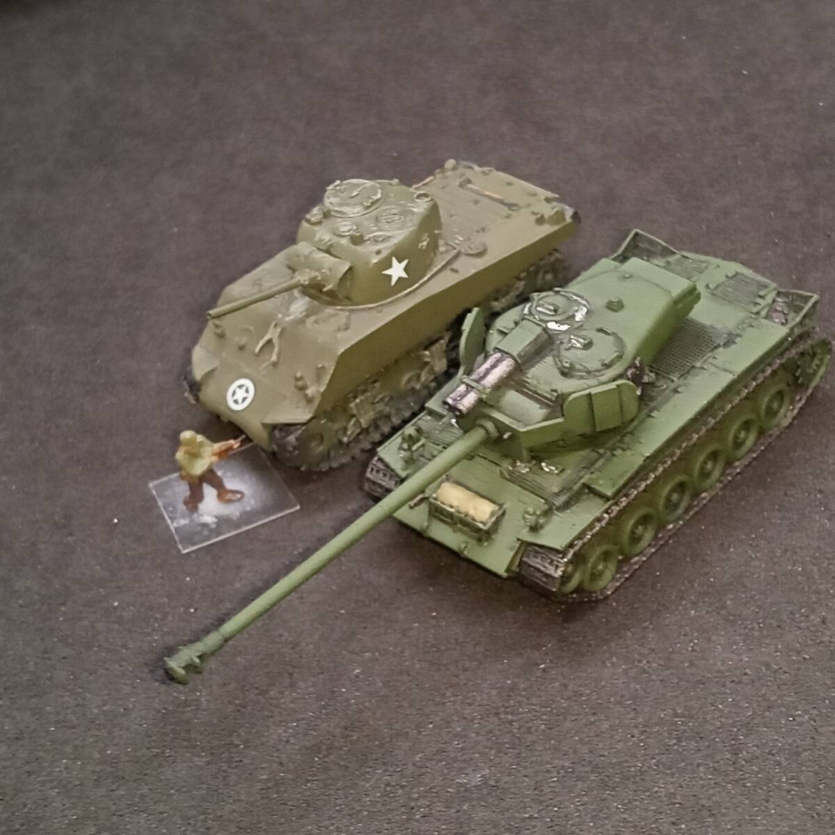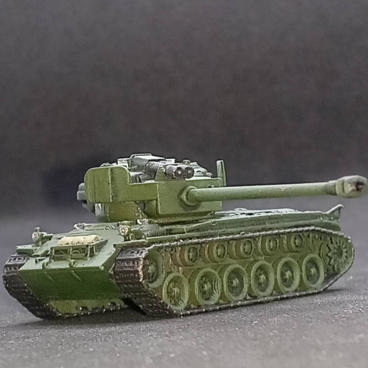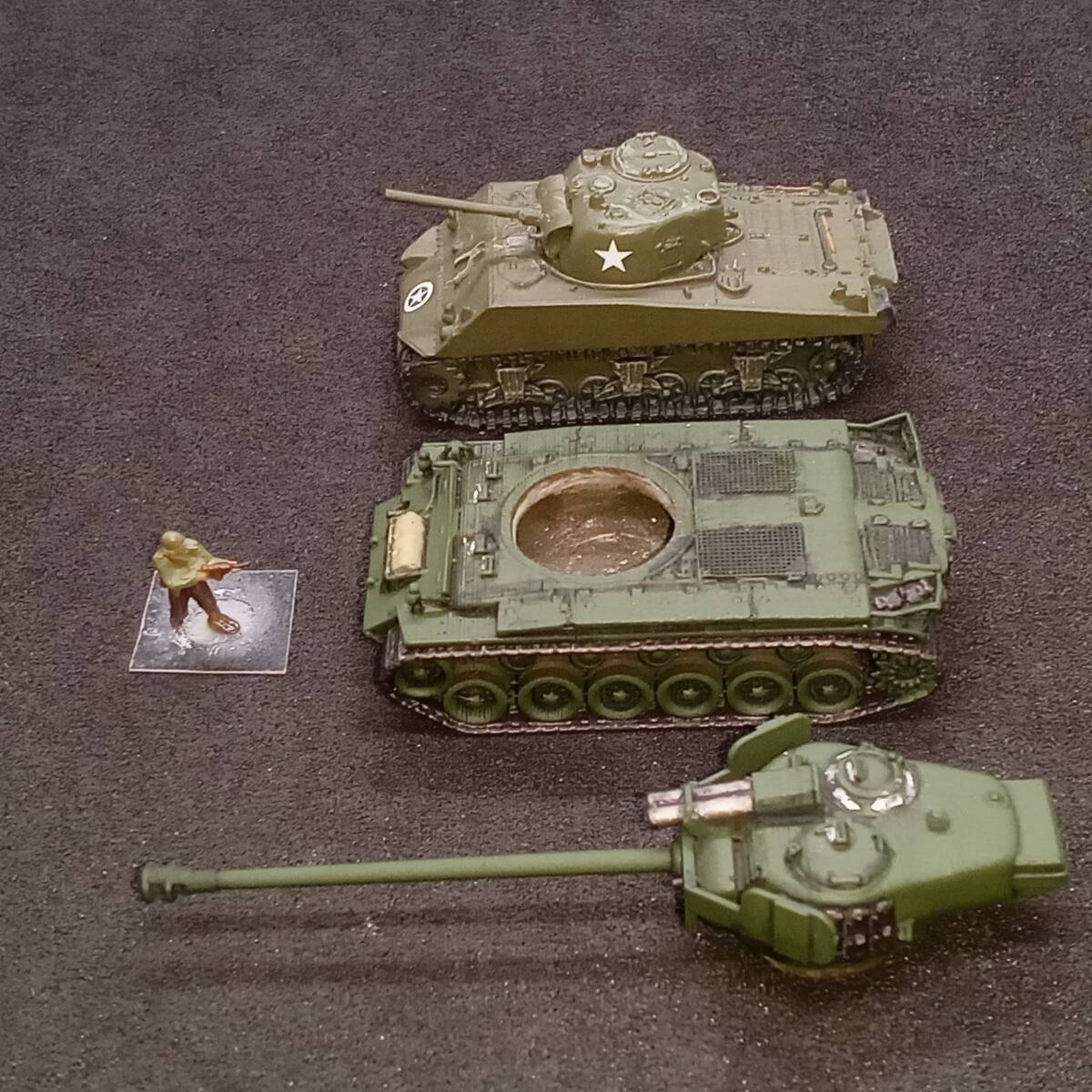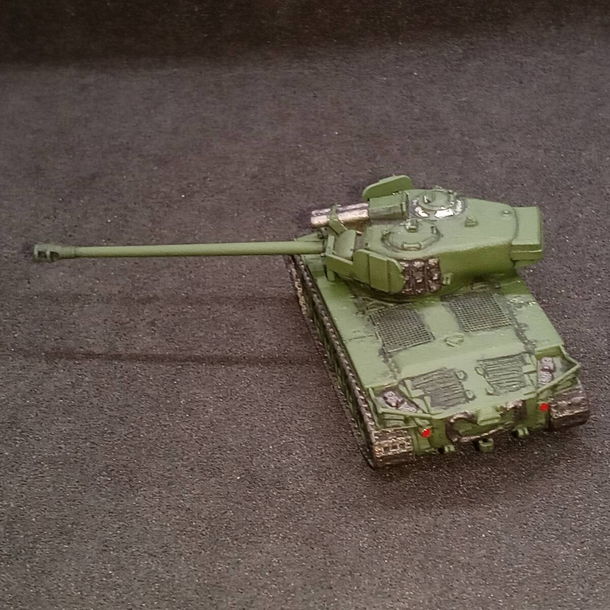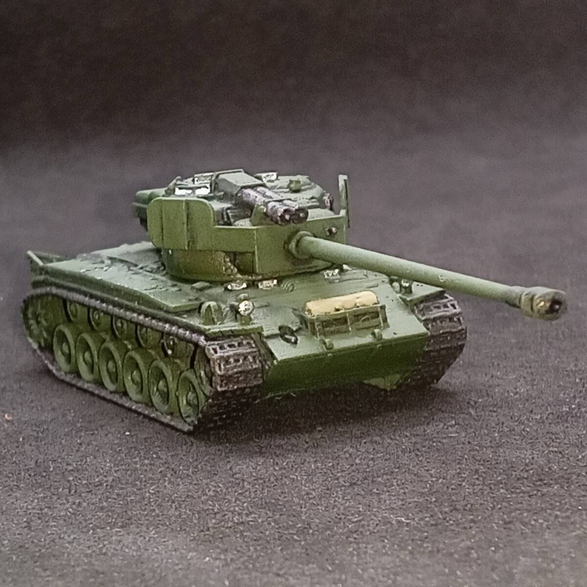 1.商品説明 1/144 スーパー・パーシング重戦車,”王虎を撃破せよ!超長砲身!”,出品2,グリーン塗装,アメリカ,WW2,SSMODEL製,自作ver. 塗装済み完成品。出品2は★マーク。グリーン塗装。 【かんたん解説】 アメリカ軍の重戦車。第二次世界大戦。戦争末期。 M26パーシング重戦車は 大戦末期の1945年から実戦投入された。 M4シャーマンが 歩兵支援の戦車だったのに対し、 M26は 戦車戦用に設計された戦車で アメリカ最強の戦車となった。 パンター、ティーガーといった 強力ドイツ戦車を撃破できたが、 アメリカ軍の懸念は 新たに登場していた ケーニヒスティーガー(王虎)重戦車だった。 火力と装甲は極めて強力で、 第二次世界大戦では 最強の戦車と評価される。 アメリカの切り札、 M26でも敗けてしまう。 アメリカ軍は懸念を拭えない。 アメリカには苦い経験がある。 ティーガー恐怖症。 ティーガー重戦車と 初対戦したアメリカ軍は ものの見事に蹂躙(じゅうりん)された。 M4シャーマンの砲弾は ティーガーの重装甲に弾き返され、 熟練のドイツ兵が操る ティーガーの8.8cm砲は M4シャーマンを簡単に炎上させた。 「M4はマッチのように燃えあがる!」 「俺たちは座り込んだアヒル同然だ!」 アメリカ軍には無力感が広がり、 ティーガーに似た戦車が現れただけで 恐慌状態に陥り、敗走する部隊もあった。 アメリカ軍は M26を配備することで ティーガー恐怖症の特効薬とした。 だが、 ケーニヒスティーガーの登場で 恐怖症の再発が起こりうる。 ケーニヒスティーガー相手では M26パーシングでも分が悪い。 ケーニヒスティーガーを撃破すべく、 M26も強化型の開発が行われた。 これが本車、 スーパー・パーシングだ。 主砲は同じ口径の90mmだが、 長砲身70口径のものとなった。 (※M26は50口径) 大型車体にさえ、 不釣り合いなほどの長砲身。 これまでのパーシングで ケーニヒスティーガーを撃破するには 1000m以内に近づいても難しかったが、 スーパー・パーシングは 2000mの距離から これを撃破しうるものであった。 ケーニヒスティーガーの主砲、 長砲身8.8cm砲に匹敵する。 だが、 外見からも分かる通り、 大型の長砲身90mm砲を搭載するために 防盾から砲塔上部にかけて 平衡装置が装着されている。 巨大すぎて主砲の関連装置すべてを 砲塔内に納めきれなかったのだ。 砲弾は 大型主砲の常として、 装薬分離式となり、 再装填には時間がかかった。 試作車輛は ヨーロッパに送られ 第3機甲師団 第635戦車駆逐大隊に配備。 現地では 撃破したパンターの装甲をはぎ取り、 増加装甲として スーパー・パーシングに装着した。 車体にも ボイラー資材の鋼板を 増加装甲に装着。 相当に無理のかかったことが、 一目瞭然で分かる外観。 魔改造を受けた 末期的パーシングというべきか。 このスーパー・パーシングは 1945年4月に ドイツの都市デッサウにて ケーニヒスティーガーと会敵した! 長砲身90mm砲は命中した。 だが、 ケーニヒスティーガーの 前面装甲は貫けなかった。 王虎は接近しようと、 瓦礫の山を乗りあげた。 瞬間、 王虎は砲撃。 長砲身8.8cm砲の敵弾は スーパーパーシングの頭上をかすめた。 王虎は 瓦礫の山をなおも乗り上げ、 弱点である 装甲の薄い 車体底部を見せた。 すかさず、 スーパーパーシングは狙い撃ち、 王虎を撃破した。 スーパー・パーシングは 正面撃破できなかったものの、 勝ちを制したのは確かだ。 スーパー・パーシングは T26E4という試作戦車へと さらに改良され、 1000輌の受注を受けたが、 大戦終了とともに大量キャンセル。 結局25輌の少数生産で 制式化とはならなかった。 とは言え、 魔改造パーシングは 戦車ロマンを醸し、 戦車マニアの目を愉しませる。 2.注意事項 2-1. 評価の悪い御方、神経質な御方はご遠慮下さい。 入札されても、出品者の判断でキャンセル(落札者都合)する場合がございます。 2-2. 落札後2日以内の連絡、4日以内のお支払い願います。 ご連絡・お支払が確認できない場合、落札者都合のキャンセルとさせていただきます。 2-3. ノークレーム・ノーリターンでお願いいたします。 実物とパソコン・スマホの商品画像で印象が異なる場合もございます。 完成品の場合は個人によるハンドペイントのため、レジンキットの場合も材質上、個体差があります。 梱包は厳密を期しますが、輸送中の事故による破損はご自分で修理願います。 3.発送方法 ゆうパケット(おてがる版)か宅急便コンパクトで。ゆうパックおてがる版も対応いたします。 お支払後3日以内に発送いたします。2023/10/04時点での配送料。 3-1. ゆうパケットおてがる版 全国一律230円! 匿名発送。追跡サービス付き。 ポストに直接届きます。配達時間気にせずに! 模型本体のみ発送となります。パケット箱が小型なので模型の外装プラケースは取り外します。 同梱・取り置き対応できません。 3-2. 宅急便コンパクト ゆうパックより安く。 匿名発送。追跡サービス付き。 配達時間指定OK!補償付き。 同梱対応可能です(3個程度
