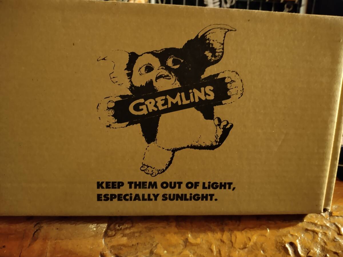 こちら、カラ箱です、Tシャツと、ギズモのフィギュアが入ってたものです、赤ペンキ付いてる面あります、神経質な方はご遠慮下さい、