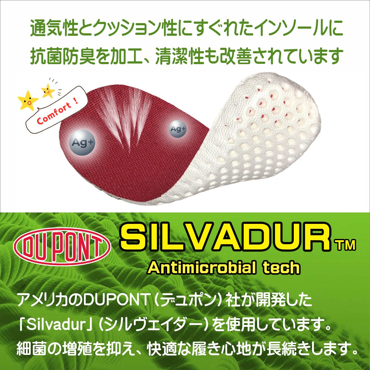 カップインソールには通気孔の加工をしており、クッション性が良く足裏の通気性抜群。アメリカデュポン社の薬剤を使用して抗菌防臭加工も施されており、取り外して丸洗いが出来るので、靴を清潔を保つことが出来ます。