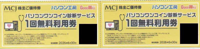 MCJ 株主優待券 パソコンワンコイン診断サービス1回無料利用券 2枚 有効期限:2026年6月30日 普通郵便・ミニレター対応可
