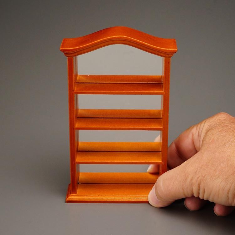 ドイツロイター社製のミニチュア家具です。ロイターのミニチュア食器をディスプレイするのに最適ですね!もちろん、本棚など他の用途に使ってもOKですよ!サイズ:W90xD26xH150mm。棚の奥行き約19mm。スケールは1/12です。※小物は付属しません。内側背面は鏡張りになります。外側の背面は木製です。小物は別売りになります。棚の高さ内寸:下から1段目29?、2段目30?、3段目30?、4段目30?~40?(一番高いところ)