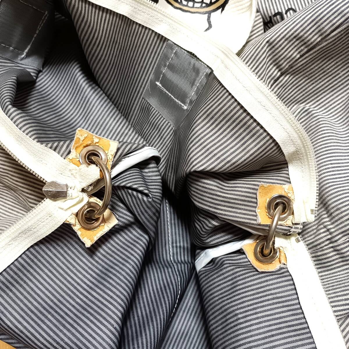 写真9枚目、バッグの両側にあるリングが通っている穴の裏側の生地が剥げています。