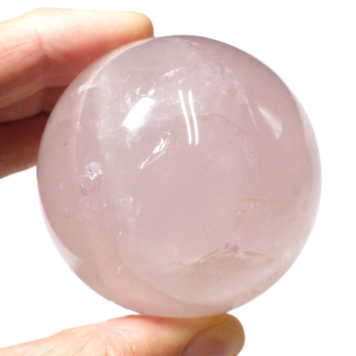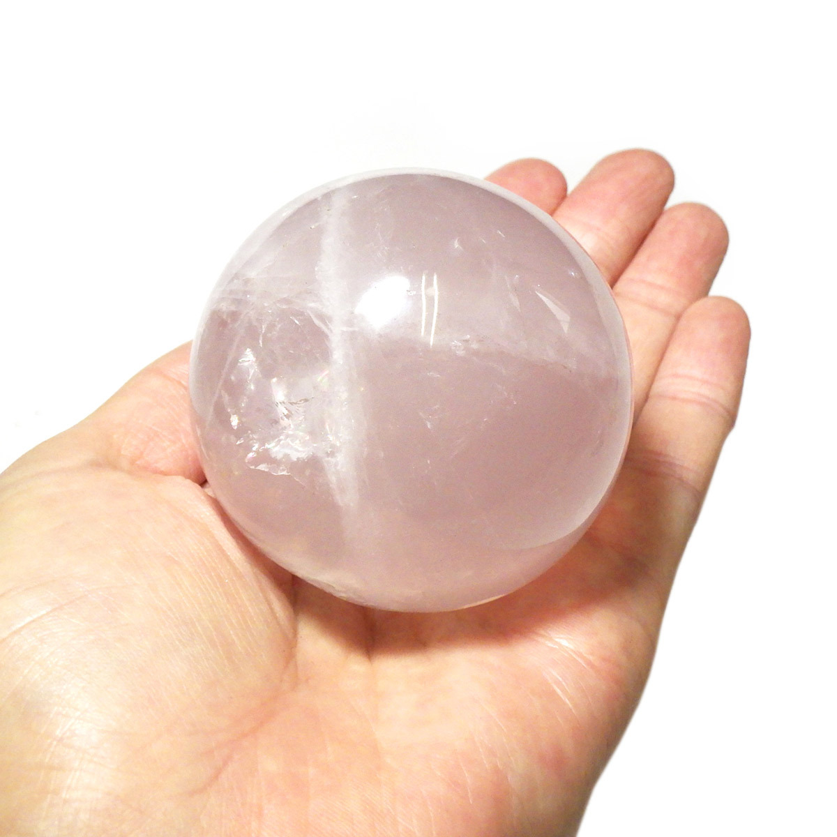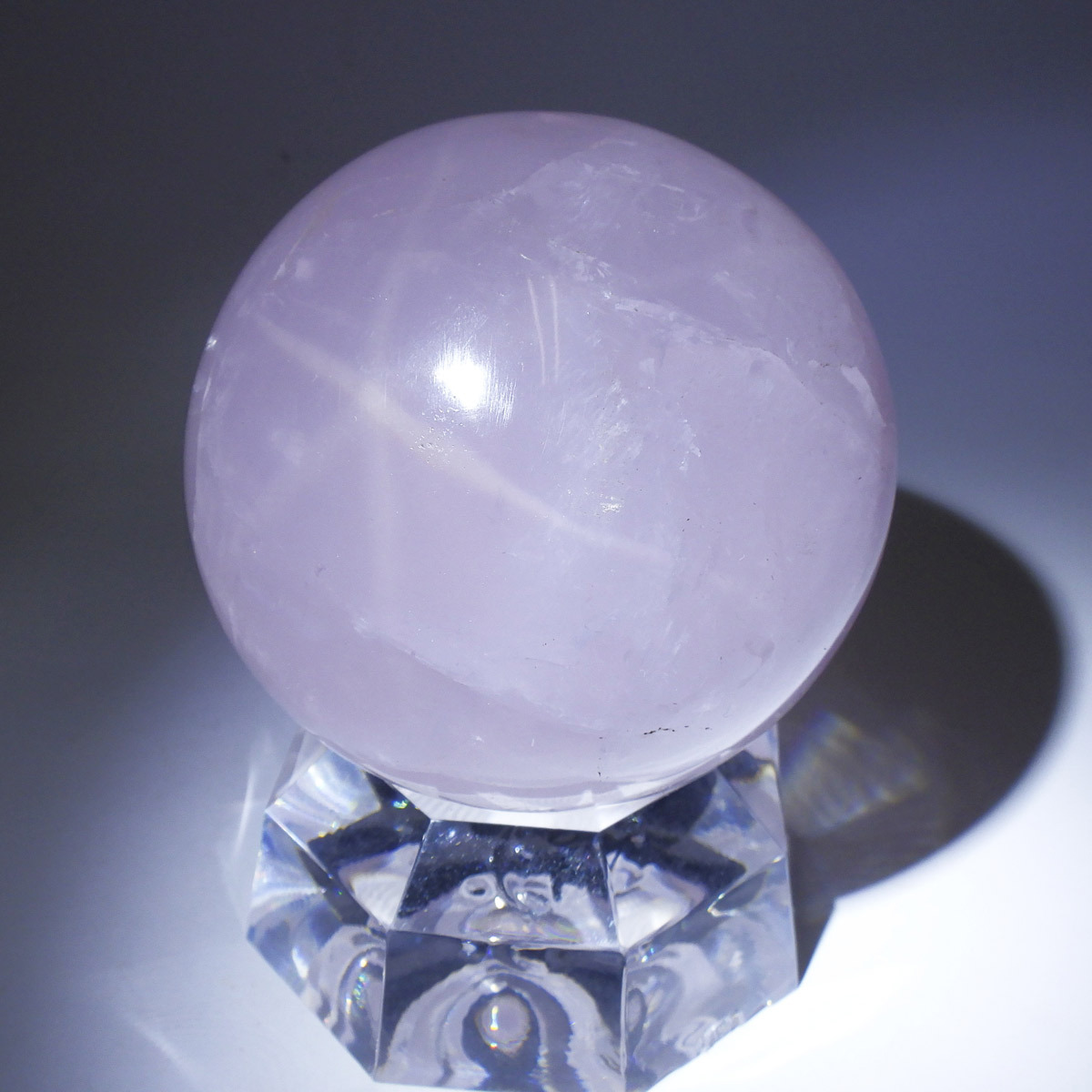 ブラジル産ローズクォーツ球です。手のひらに収まるちょうど良いサイズ感で、デスクやお部屋に置いて癒しのインテリアアイテムとしても人気があります。高品質なブラジル産らしい美しいピンクカラーが魅力で、光にかざすとほんのりとした透明感も楽しめます。特にこのローズクォーツは、内側から発光するようなやさしい色合いが特徴的で、見ているだけで穏やかな気持ちにさせてくれます。また、ライトなどで光を当てると若干ですがスターが見られます。