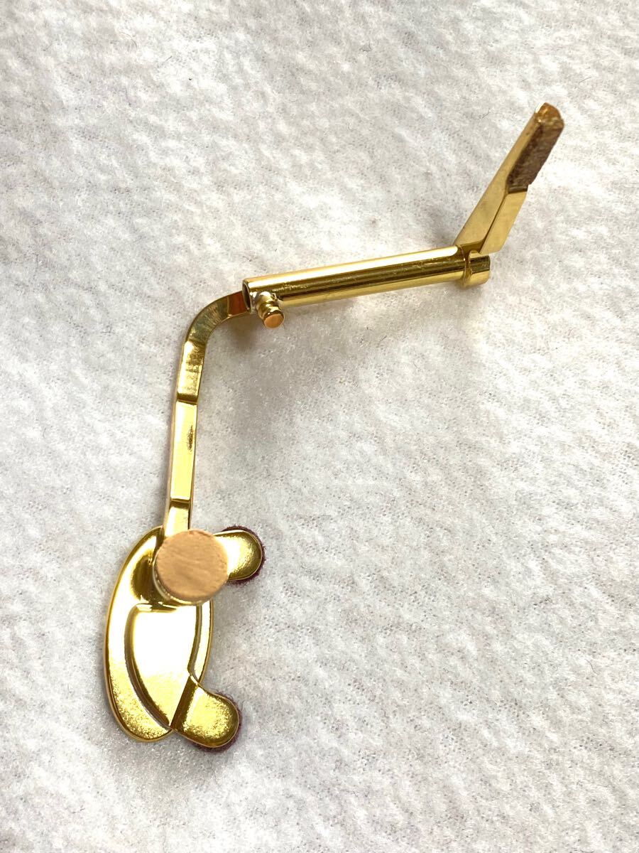 ヤマハのアルトサックスYAS-82Z用のG♯レバー、指貝(キーパール)付きです。新品のヤマハ純正部品を組み立てて、コルク2種類とフェルト2枚を貼ってお届けします。管体に貼るフェルトもシールの有無で2種類お付けします。