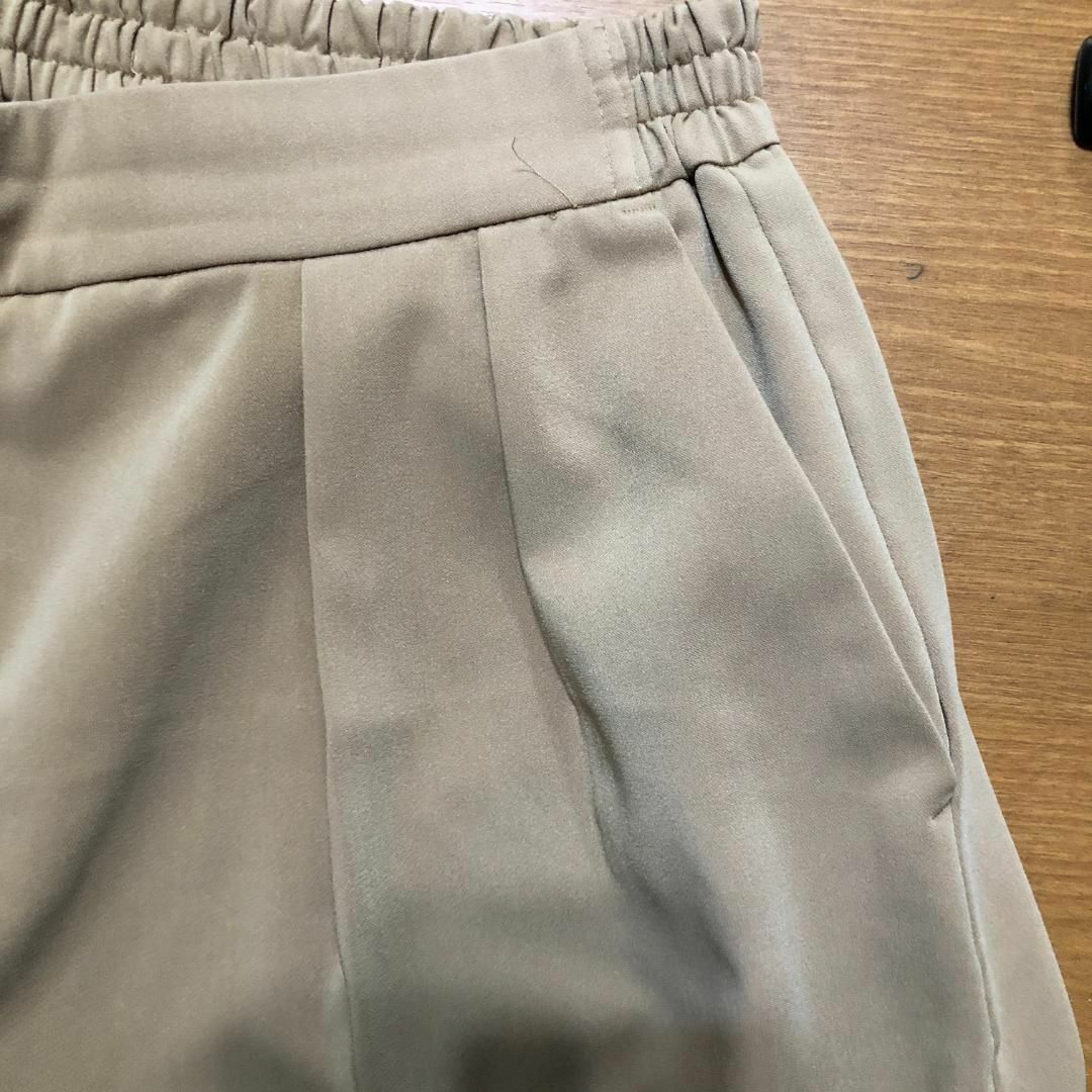 ベージュのレディースワイドパンツです。ウエストはゴム仕様で、すっきりとしながらも楽に着用いただけます。軽やかな素材感で、これからの季節にぴったりの一枚です。ゆったりとしたシルエットで体型カバー効果も期待でき、カジュアルからきれいめまで幅広いスタイルに活躍します。