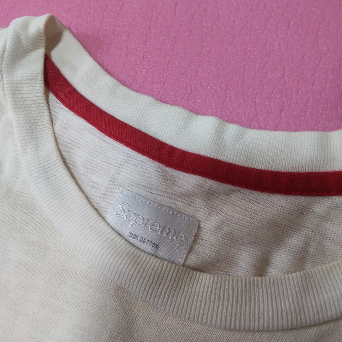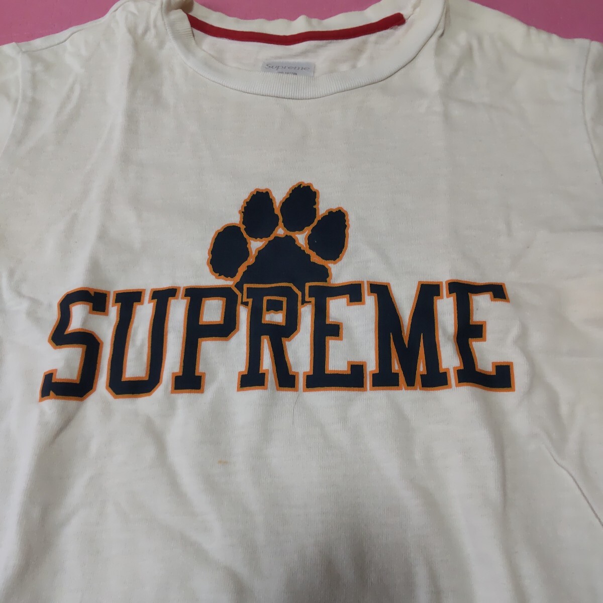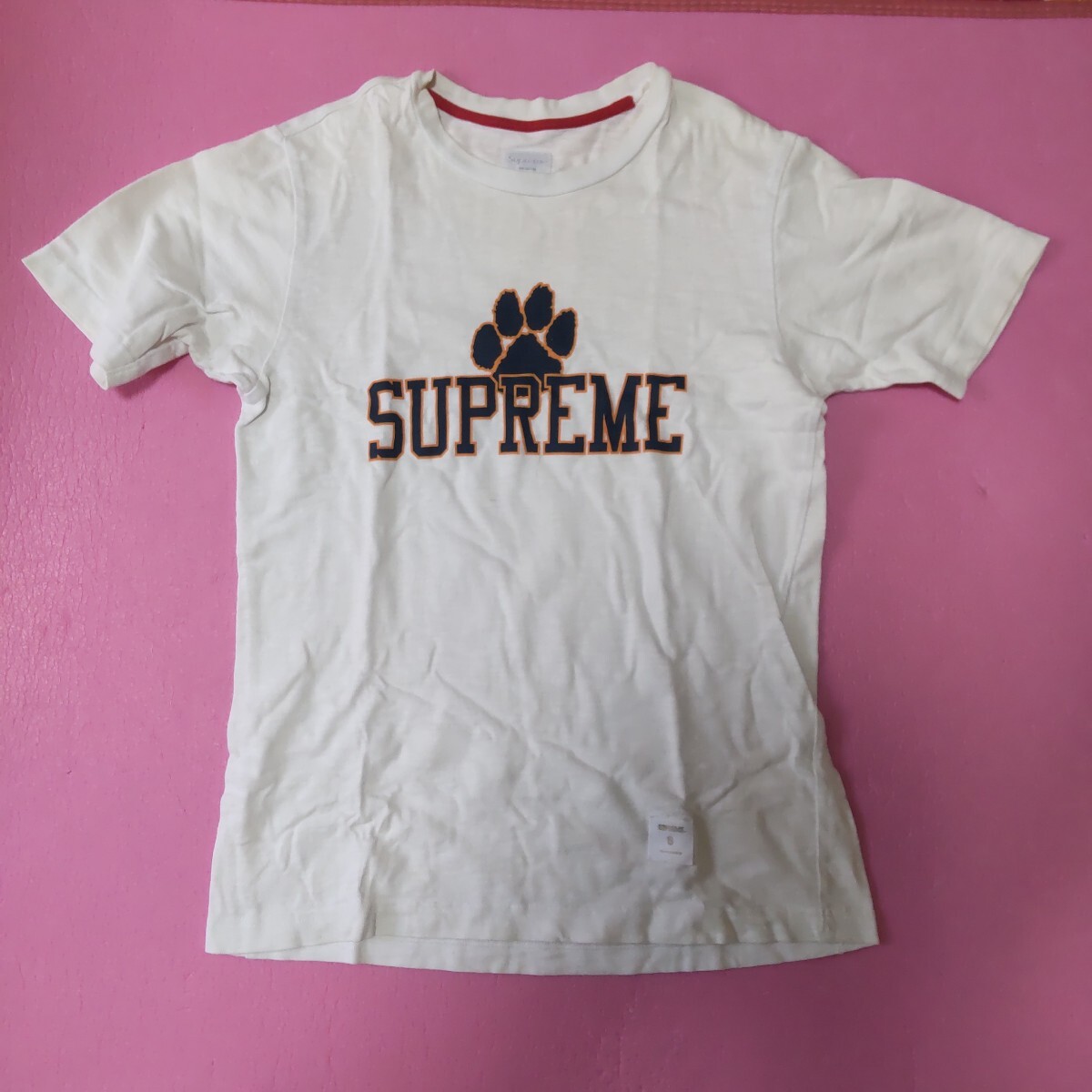 写真の、シュプリームのTシャツです。中古品、傷、汚れ、黄ばみ有ります。平置きサイズ身丈68,身幅47,肩幅42,袖22素人採寸。ノークレームノーリターン。