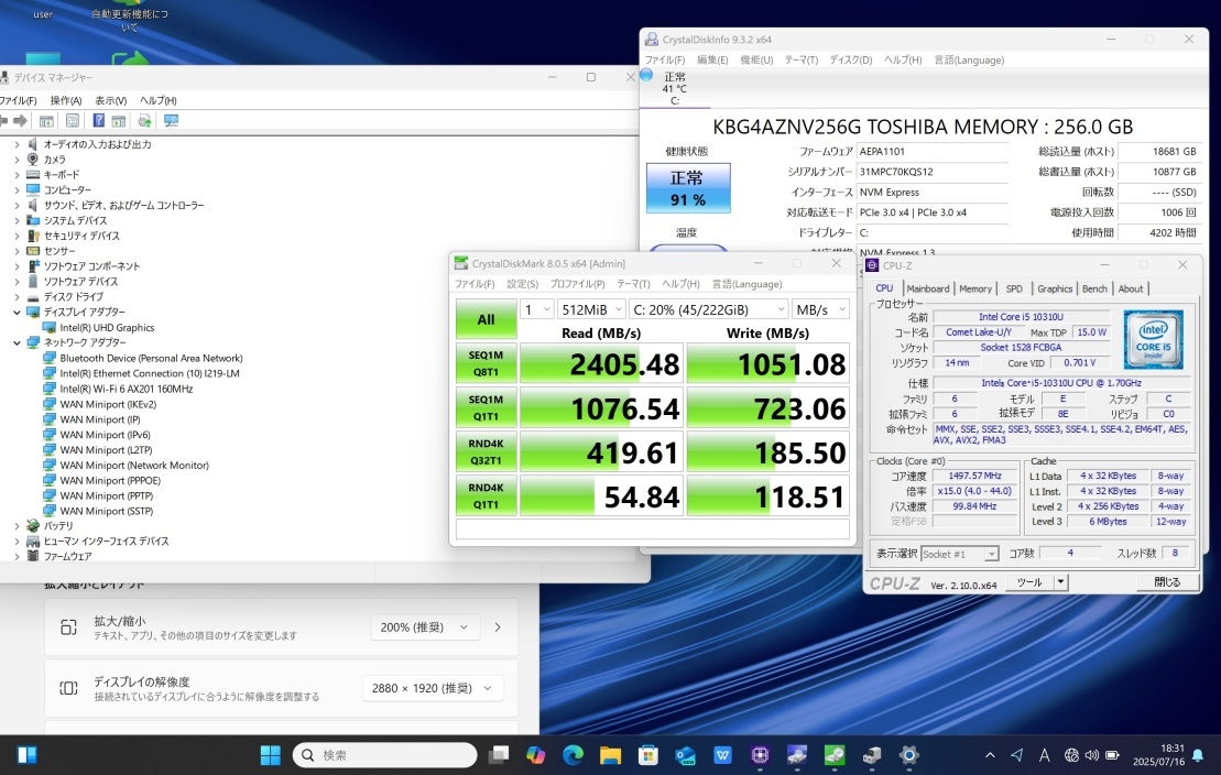 | CPU: 超高速 Intel 超高性能 第10世代Core i5-10310u 1.7Ghz、 4コア8スレッド (ターボ・ブースト利用時の最大周波数 4.4GHz) |