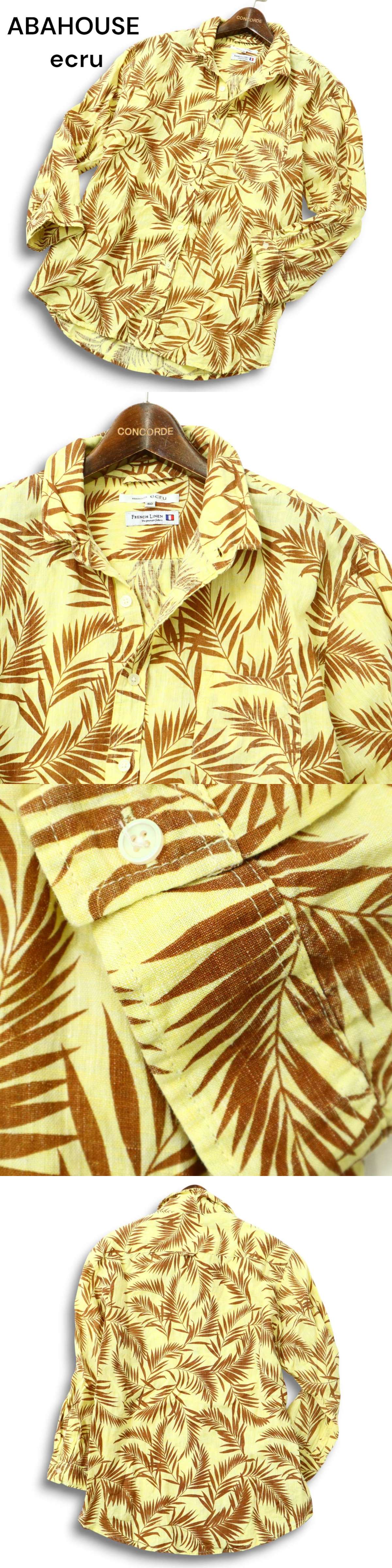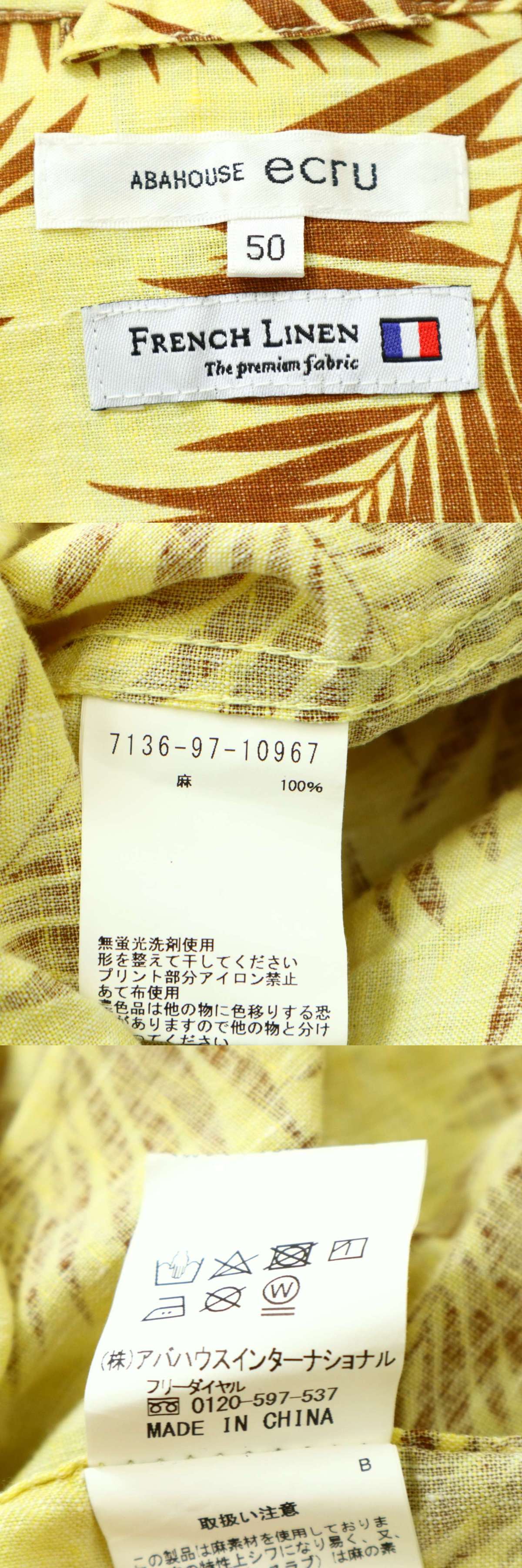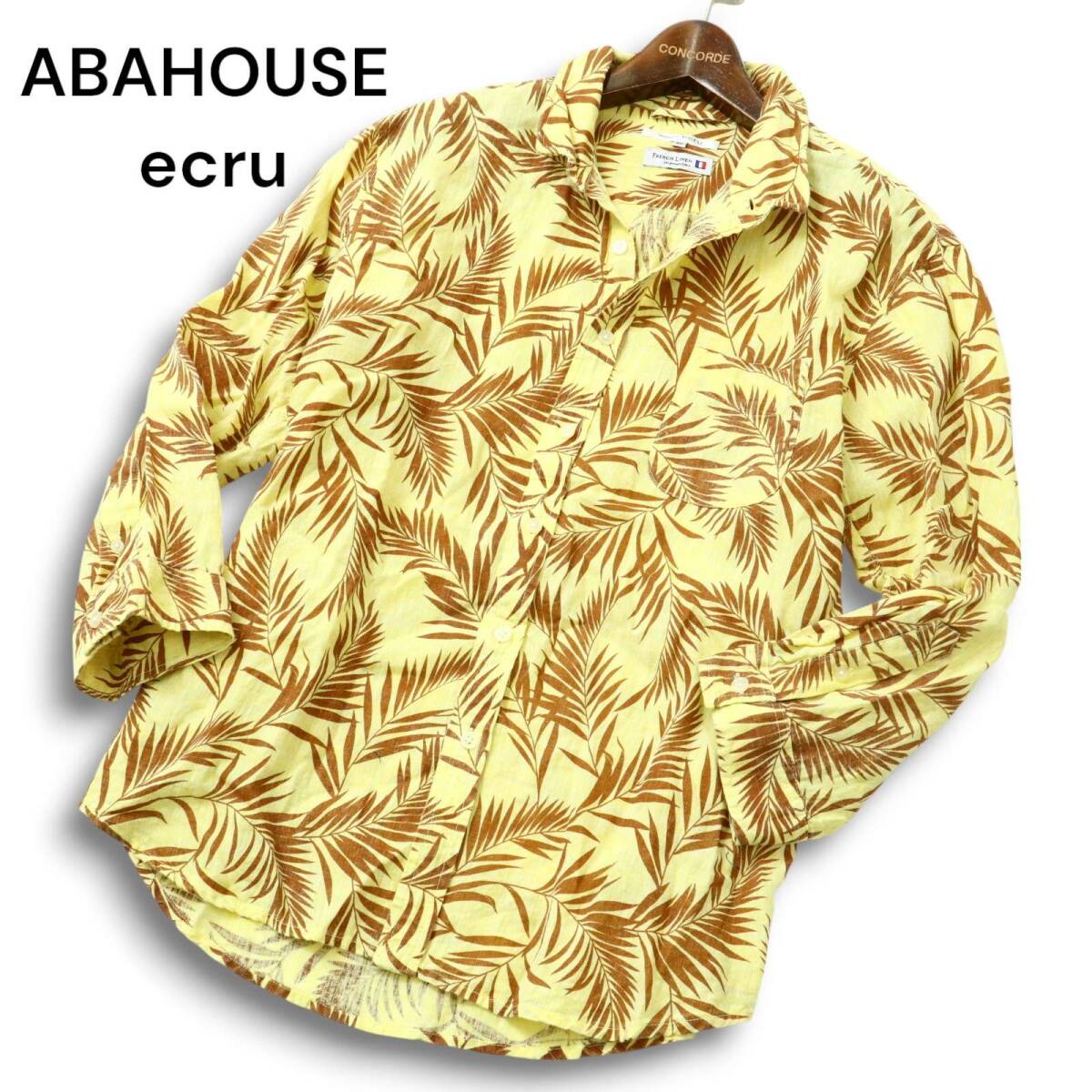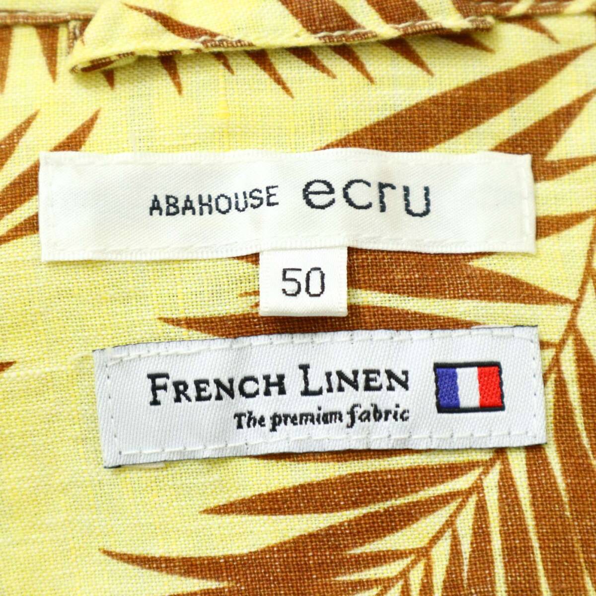 ABAHOUSE ecru アバハウス エクリュ 麻 フレンチ リネン100%★ 襟ワイヤー リーフ総柄 7分袖 シャツ Sz.50 メンズ