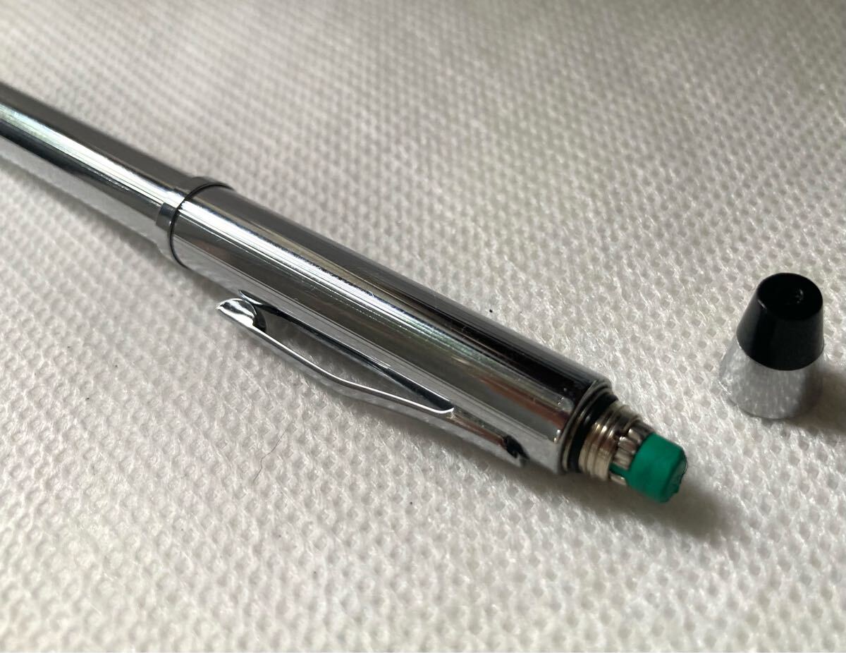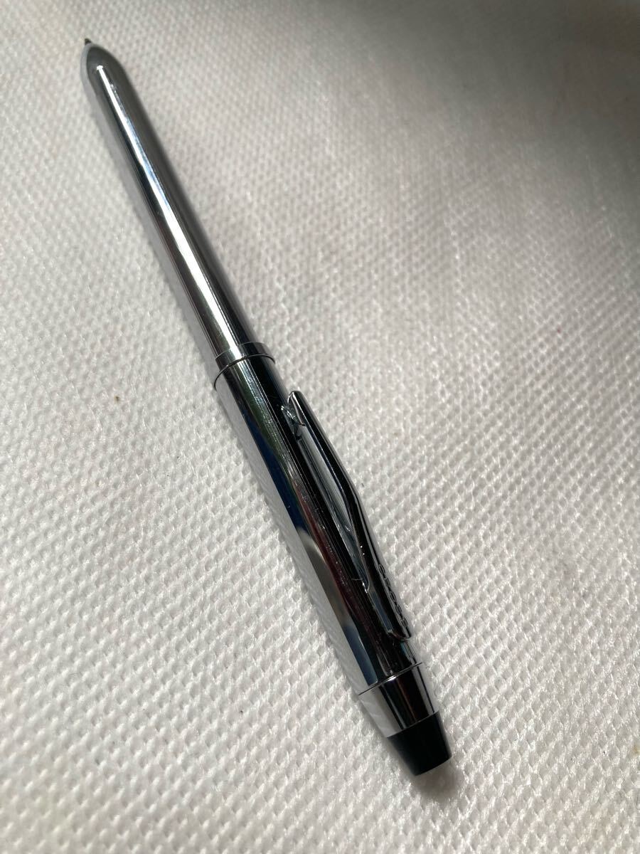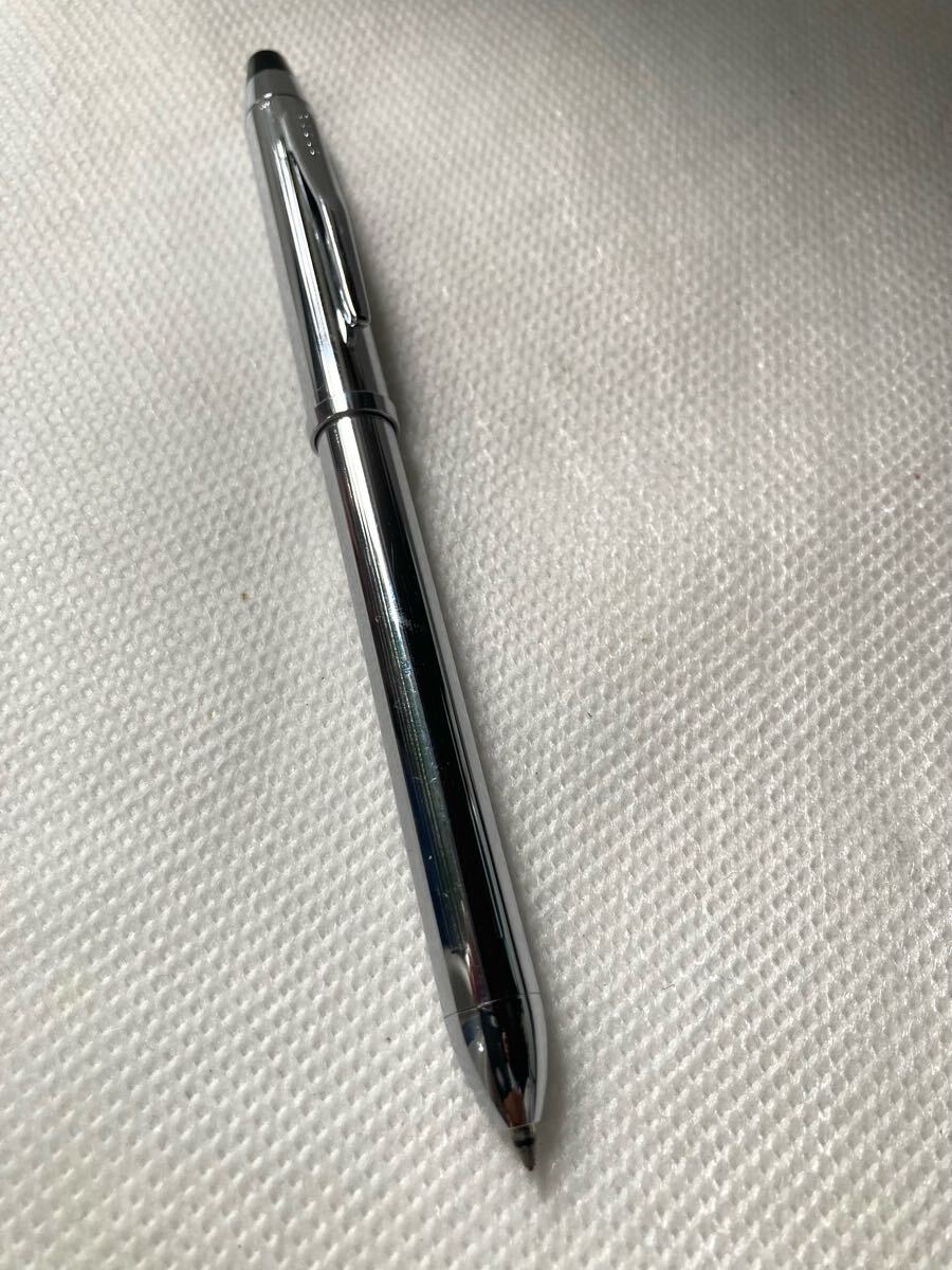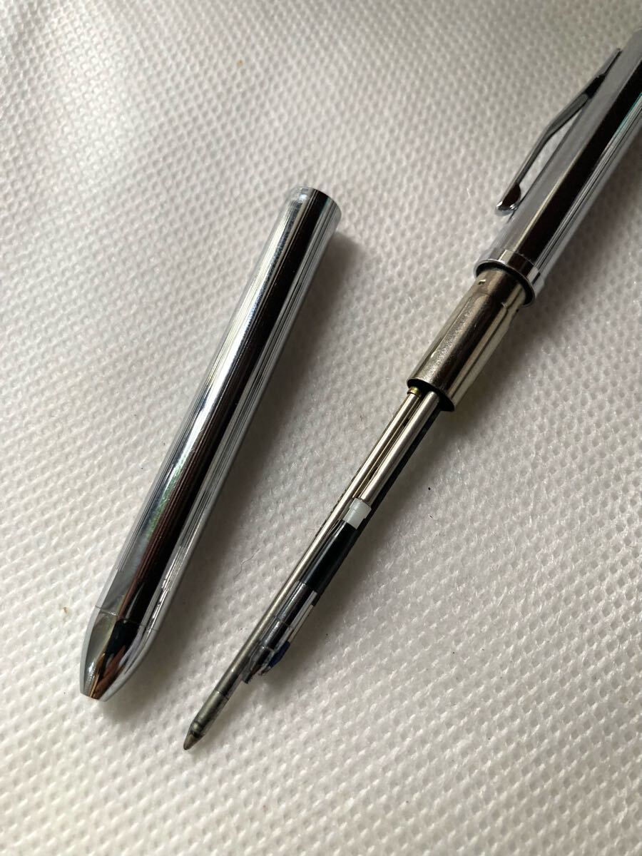◆ 多機能ペンは、本体はクローム仕上げで、サイズは、長さ13.6cm、長さ9mmほど。 ボールペンは、黒、青インクの2色、シャープペン0.5mm芯。ツイスト式の複合ペン。