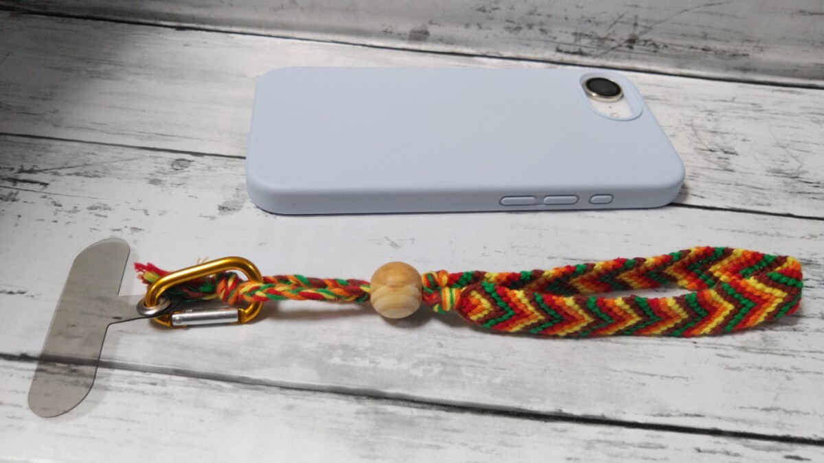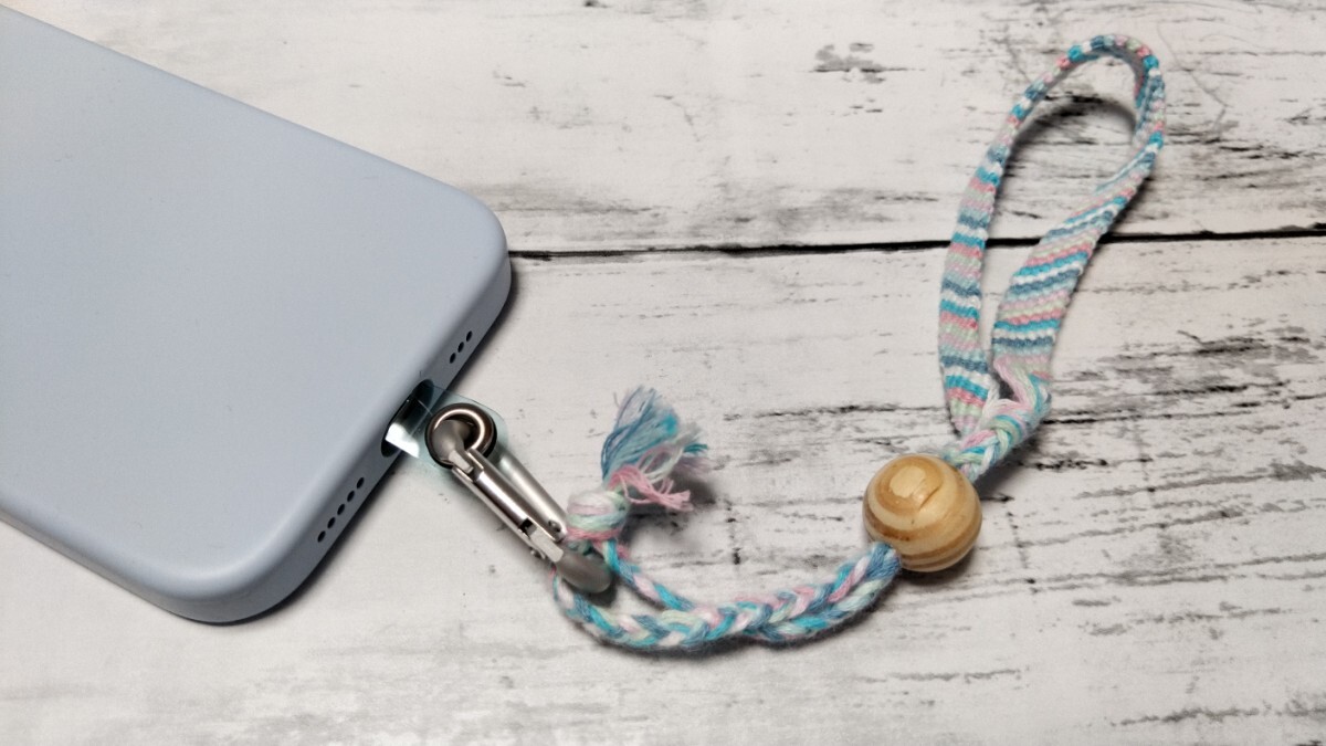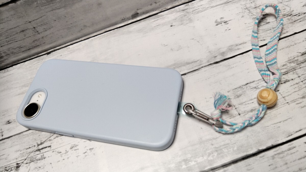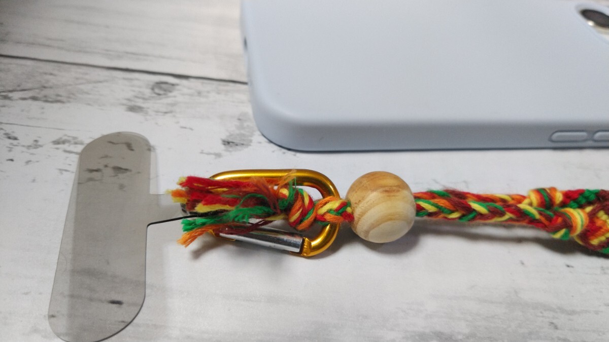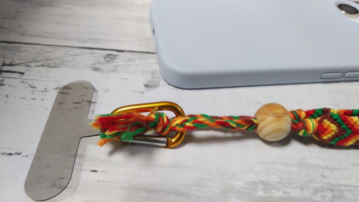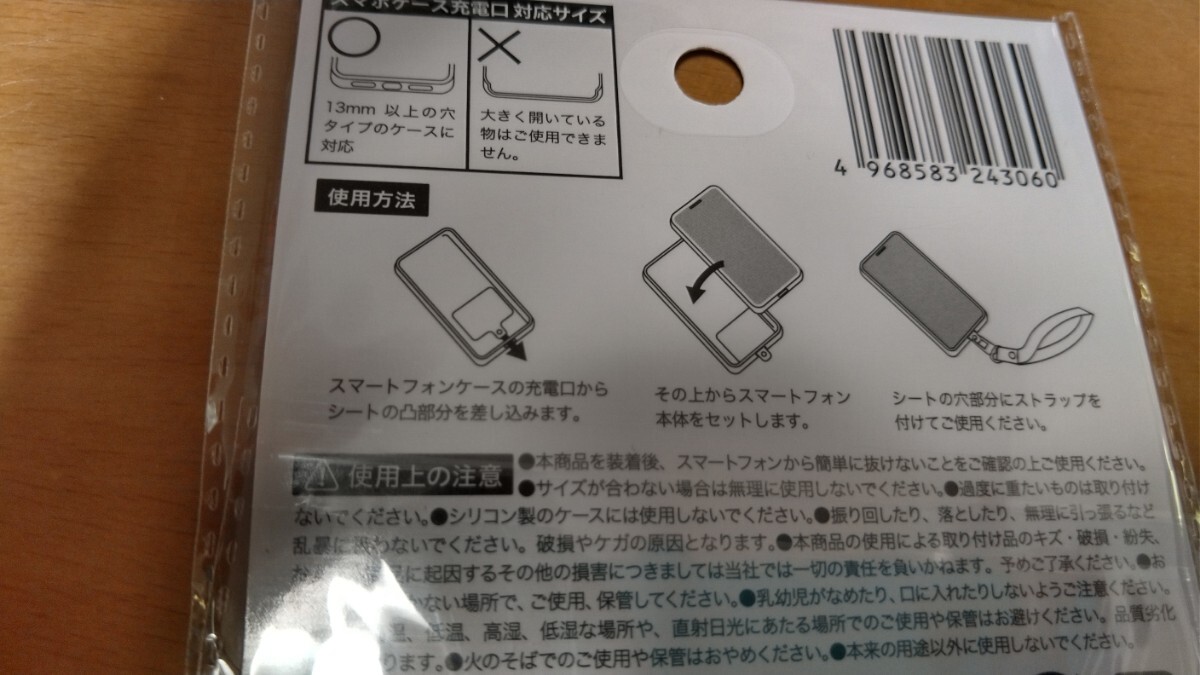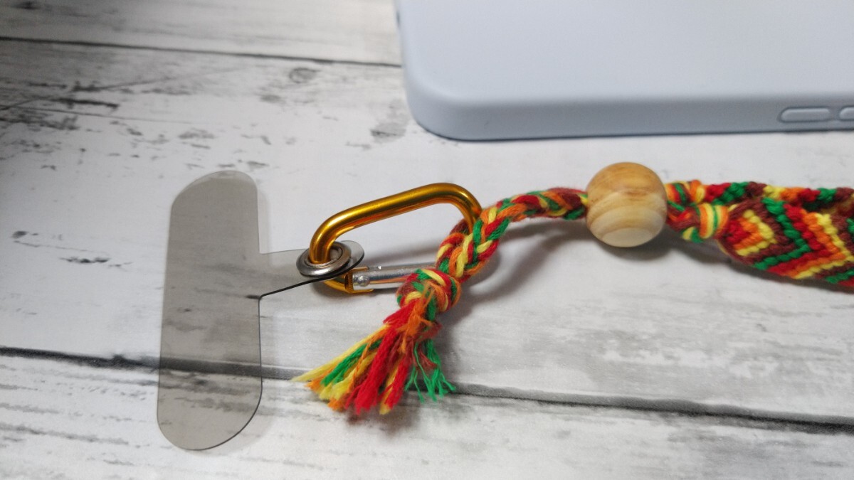 ストラップシートをスマホカバーの充電差し込み口に内側から差し込んで、スマホをカバーに取り付けてからストラップのカラビナを取り付けて使用します。(画像7,8,9参照)