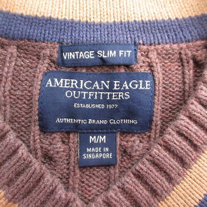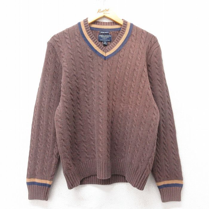 【商品名】 M★古着 アメリカンイーグル 長袖 ケーブル セーター メンズ コットン Vネック 茶