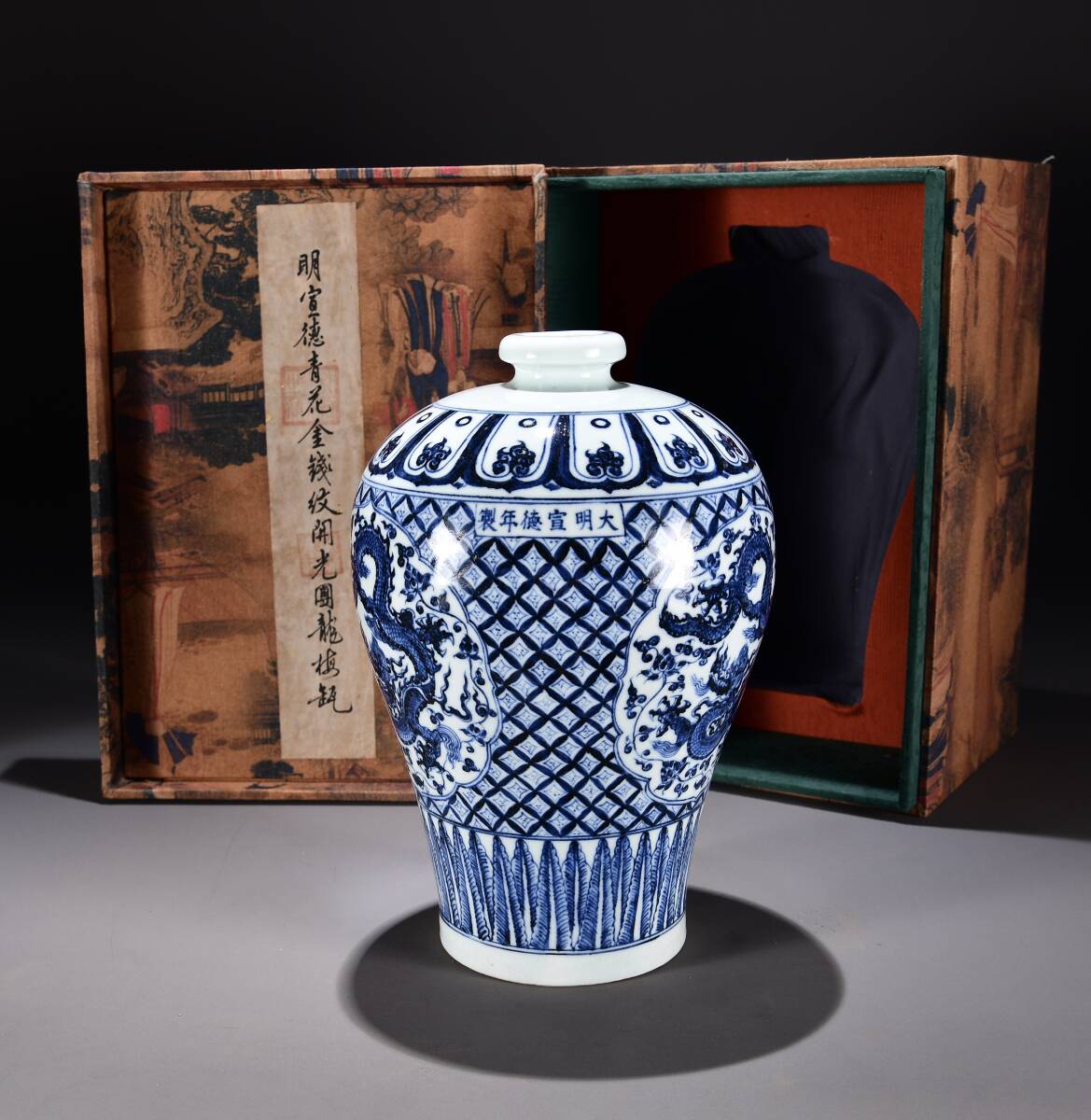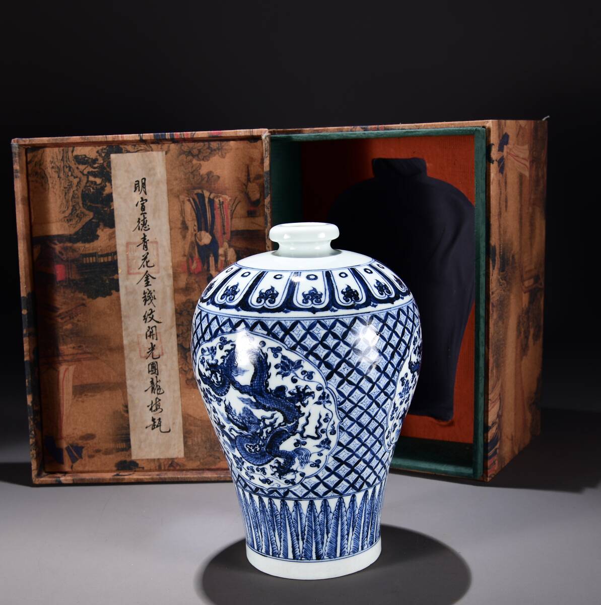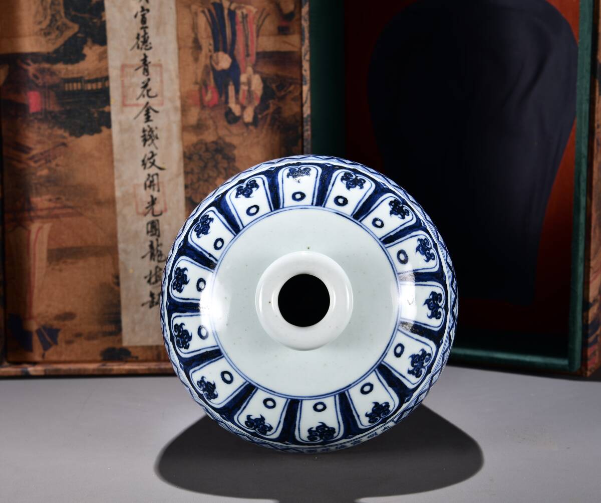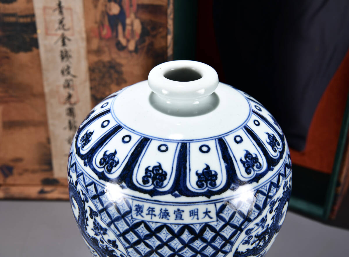 *珍品旧蔵* 明 宣徳年製 青花 金銭紋 開光団龍梅瓶 極細工 唐物 中国古玩 骨董品 古美味 H47