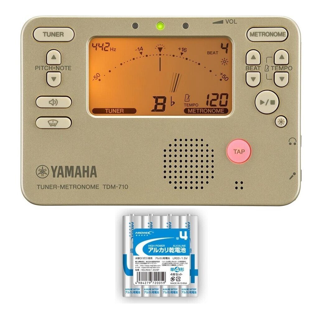 | ヤマハチューナーメトロノームTDM-710は、演奏の魅力を最大限に引き出すために、音程感とテンポ感の向上をサポートするアイテム。2段階バックライト付きの大型液晶にチューナーとメトロノームを同時に表示可能。正しいピッチを確認しながらメトロノームを使った練習ができます。練習をサポートする「サウンドバック」「トラック」「フォーカス」各種モード付き。 ・チューナーとメトロノームが同時に使えるデュアル機能搭載 ・バックライト付きの大きな液晶で音名とリズムを表示 ・サウンドバック・モード:聴く力と合わせる力を養うことができます ・トラック・モード:チューナーに頼らず安定したピッチを目指す練習ができます ・フォーカス・モード:より鮮明にピッチの傾向をつかむことができます ・単4形乾電池2本で長期電池寿命 ・日本製 主な特長 演奏の魅力を最大限に引き出すために、音程感とテンポ感の向上をサポートするアイテム。2段階バックライト付きの大型液晶にチューナーとメトロノームを同時に表示可能。正しいピッチを確認しながらメトロノームを使った練習が出来ます。 チューナー:基本的な使い方のほか、3オクターブの基準音を発振するサウンド・モードで音を聴きながらピッチ確認も可能です。純正な長三度、短三度のピッチを示すマーク付き。 メトロノーム:拍子やリズムを分かりやすくする0~9拍子、5種類のリズム・バリエーション搭載。テンポを測定・表示してくれるタップ機能で、素早く好みのテンポに設定が可能です。 練習をサポートする機能: サウンドバック・モード:奏者の演奏した音を検知し、正しいピッチをチューナーから返す機能。返ってきた音と聞き比べることで、「聴く力」「合わせる力」を養うことができます。 トラック・モード:ピッチの揺れ幅を演奏後に表示する機能。演奏中に画面を見なくてもよいため、チュ-ナーに頼らず安定したピッチを目指す練習が出来ます。 フォーカス・モード:ピッチの表示範囲を通常の±50セントから±25セントに変更する機能。表示目盛りが細かくなるため、より詳細にピッチの傾向をつかむことができます。 画面の見やすさを改良:半透過液晶ディスプレーの採用によりどの方向から見ても見えやすくなりました。LEDチューニングガイドとメーターが近い画面配置へ変更したことにより、パッと見てピッチの判断がしやすくなりました。 2段階バックライト付!:見やすい液晶で音名とリズムを表示 従来機能もパワーアップ:サウンド/サウンドバック機能の音を改良したことにより、音を聴きながらのチューニングがしやすくなりました。 幅:106mm 高さ:72mm 奥行き:18mm 質量:79g(電池除く) 付属品:取扱説明書 |