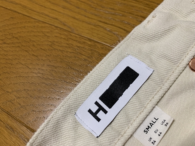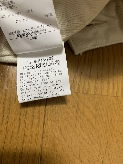 薄いアイボリーカラーにオーバーダイしたビンテージのような生地を使用し、裾やはき口などにダメージ加工を施しています。