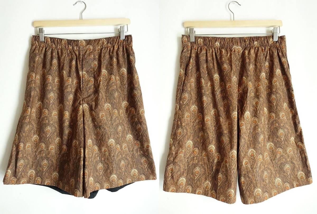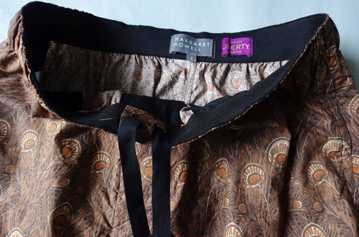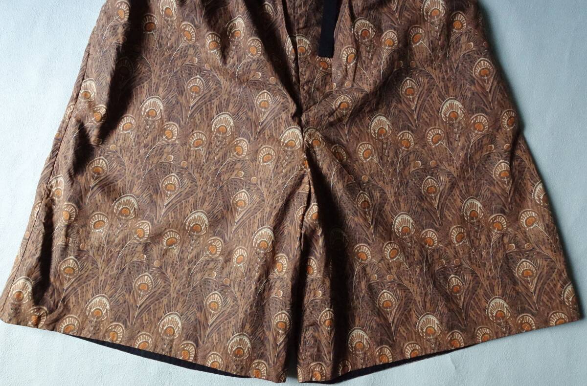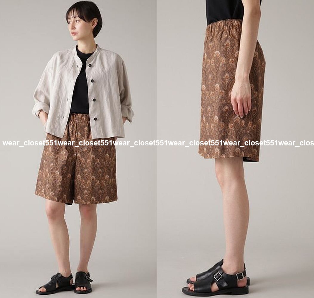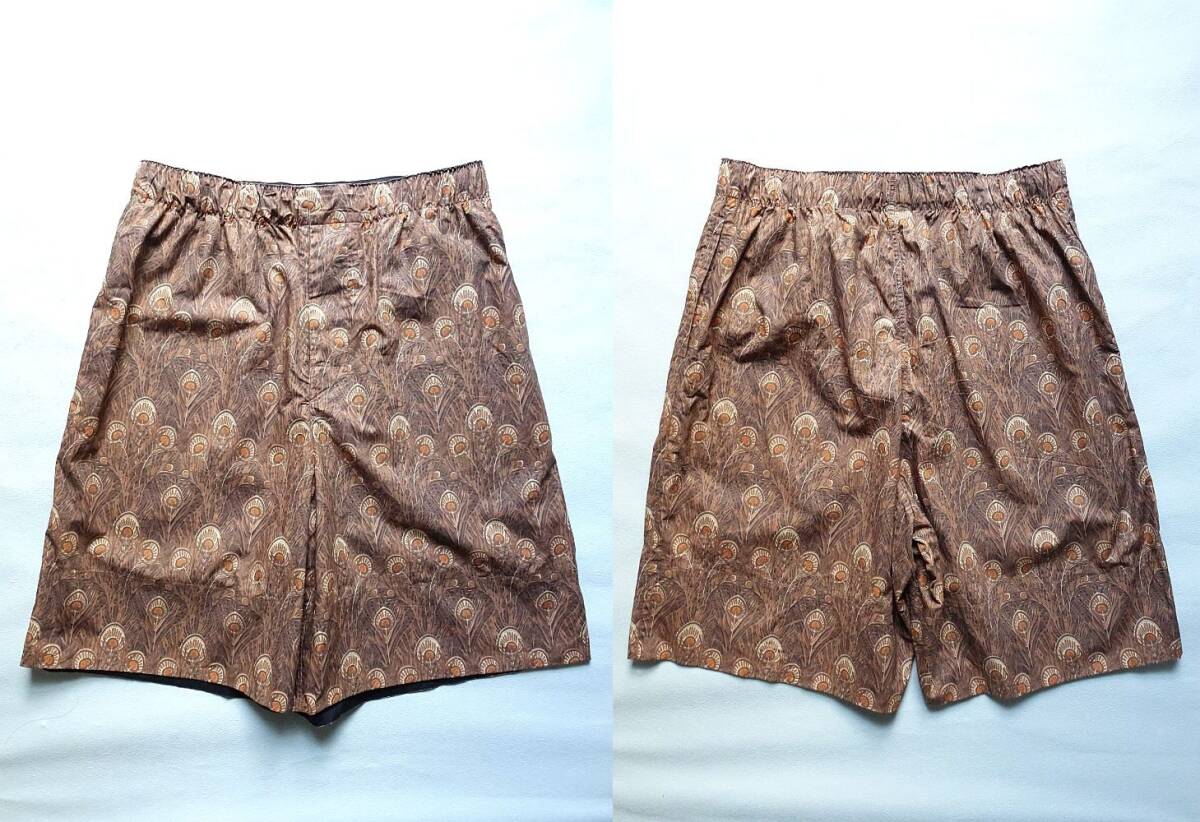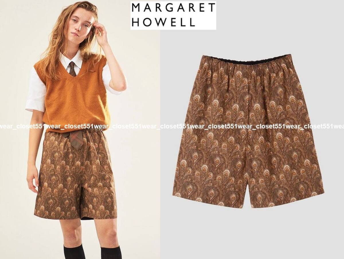 MARGARET HOWELのLIBERTY PRINT FABRIC ハーフパンツ。2024S/Sの定価37400円で、LOOKBOOKやコラム掲載アイテム。Libertyのコットンポプリン生地を使用したカプセルコレクション。孔雀をモチーフにした「クイーン・ヘラ(Queen Hera)」柄をプリントが軽いコットンポプリンのシャツ地に施されています。ショーツは、メンズのボクサーショーツから着想を得て、ウエストにゴム製のバンドを取り入れたラフなアイテム。ゆったりしたサイズで穿き心地良く、シーズンレスで着用可能な使える1枚。