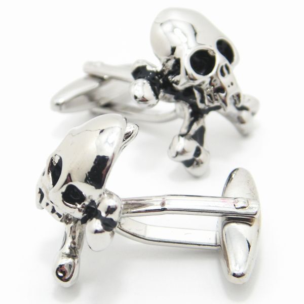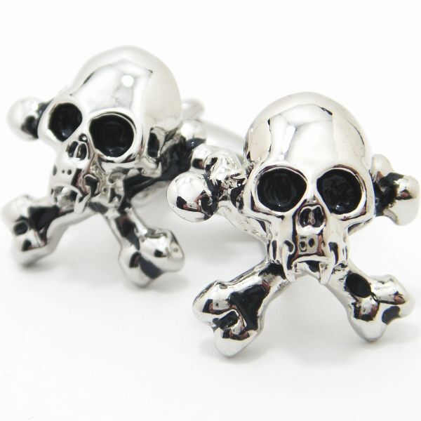 スカル、ドクロ、しゃれこうべ、、、本来は死を意味する、怖いものなんですが、不思議とカッコよく思えるのはなぜでしょう?クロスした骨の上に頭が乗っているデザインといい、程よい重厚感といい、とてもお洒落なドクロ・カフスです。サイズ=横:20x縦:20×厚み:10(mm)素材=ロジウムコーティング