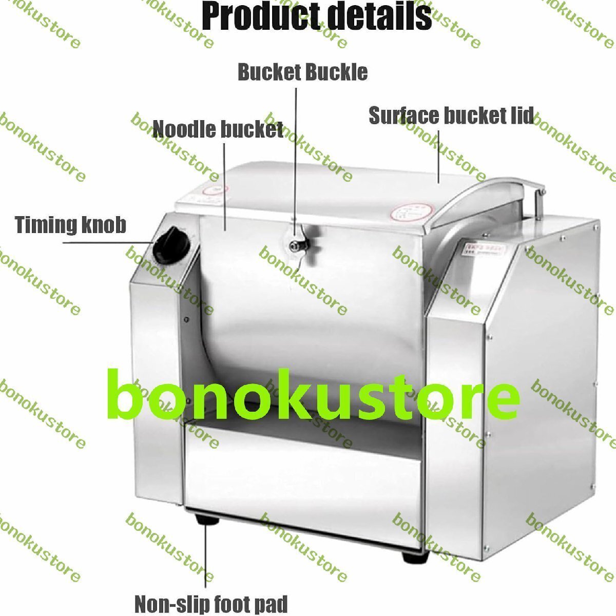 名前: 商業生地ミキサー 材質: ステンレス鋼 小麦粉を一度に加える:2~5kg パスタ容量:18リットル 生産効率:50kg/時間 性能: 1.5kW 所要時間:最大30分 製品寸法: 48 x 30 x 41 cm。 麺バケツの寸法: 30 x 23 x 27 cm 梱包寸法: 50 x 32 x 42 cm 総重量: 25kg