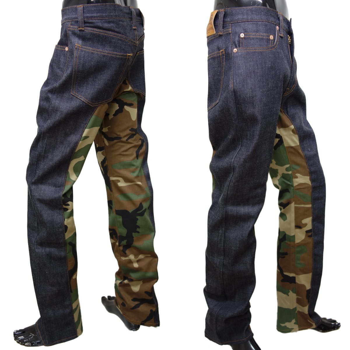 児島ジーンズのモンキーコンボパンツです。太すぎず細すぎないストレートタイプになります。Uの字型にウッドカモで切り替えられた斬新なワークパンツです。穿いたときに違和感がないように切替部分にはより繊細な技術が用いられています。メイドインジャパンの丁寧でしっかりとした仕上がりがセールスポイントのロングパンツです♪縦方向に切替が入っていることで生じる足長効果も嬉しいポイントです!穿いているだけで個性を主張できて、気分も上がるオススメのデニムパンツです♪