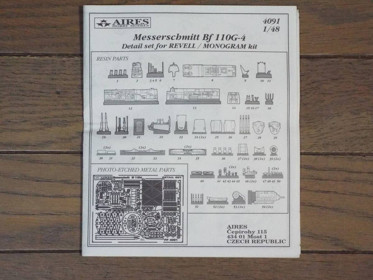 アイリス 1/48 レベル・モノグラム用Bf110G-4ディテールアップセット # 4091です。コクピットインテリアおよび機首機銃、両エンジン、エンジンカウリング、ラジエター、ホイルベイインテリア、各種アンテナ類などをレジンやエッチングパーツ、計器印刷済みフィルムなどでディテールアップします。上級者向けです。キット重量は95g、箱のサイズは縦横高さの合計28cmです。箱がやわらかいので、ダンボール包装でお送りします。送料無料です。送付方法は定形外です。京都府大山崎町から発送します。コロナ禍の折、手渡しはいたしません。