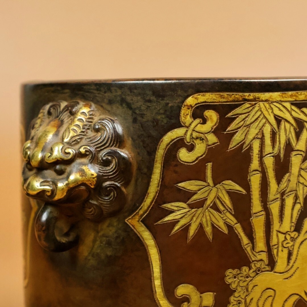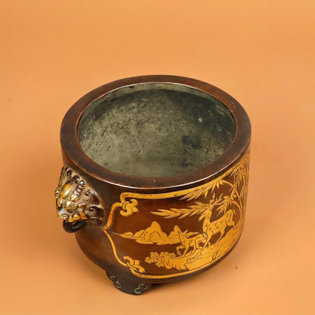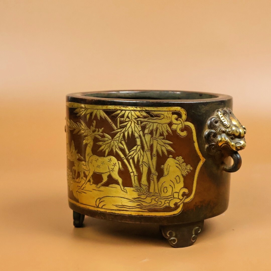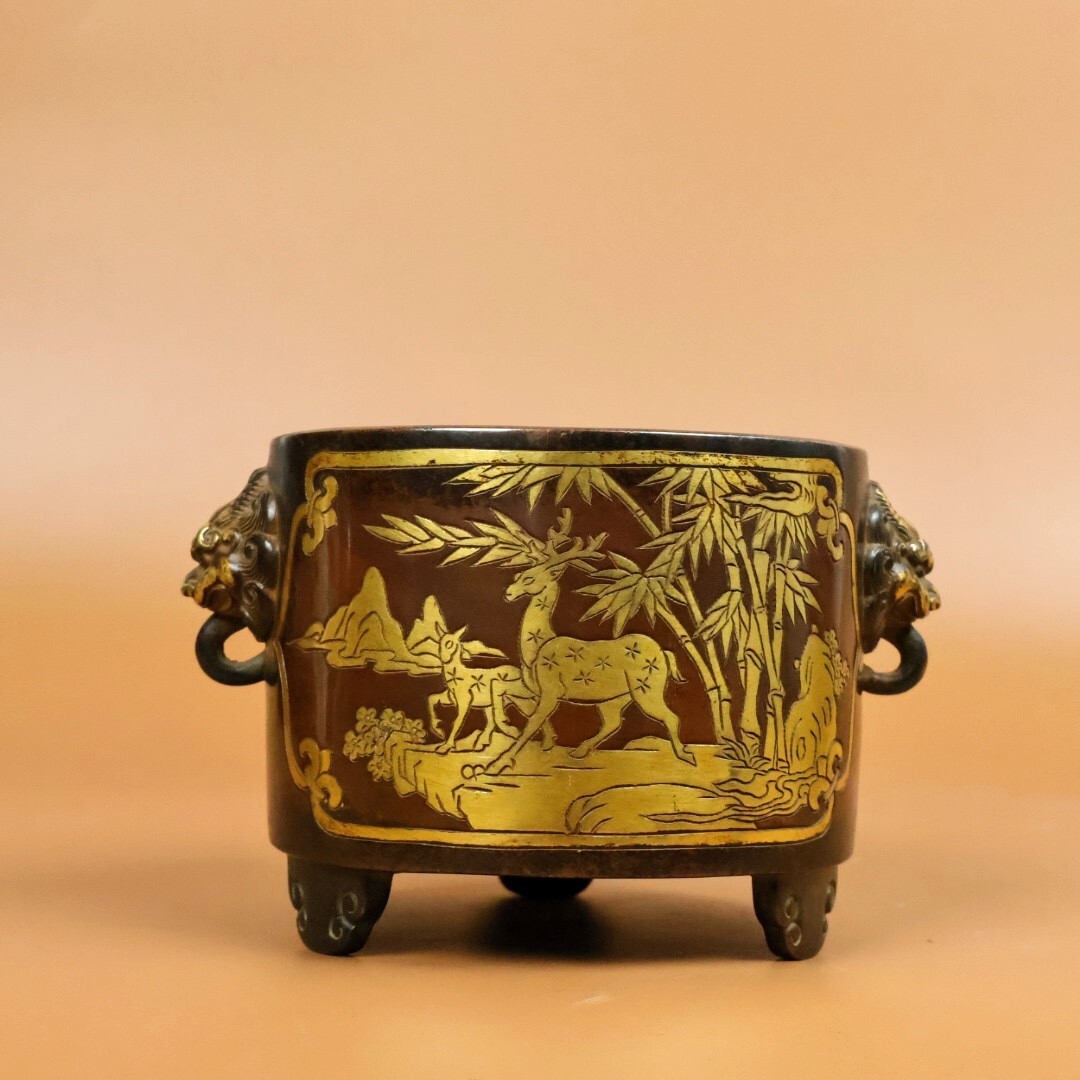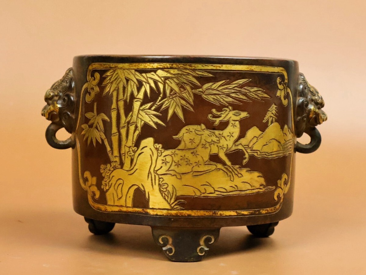 【瓏】古銅鏨刻彫 塗金竹鹿紋 獅耳香炉 大明宣徳年製 銅器 古美術 骨董品 香道具 蔵出