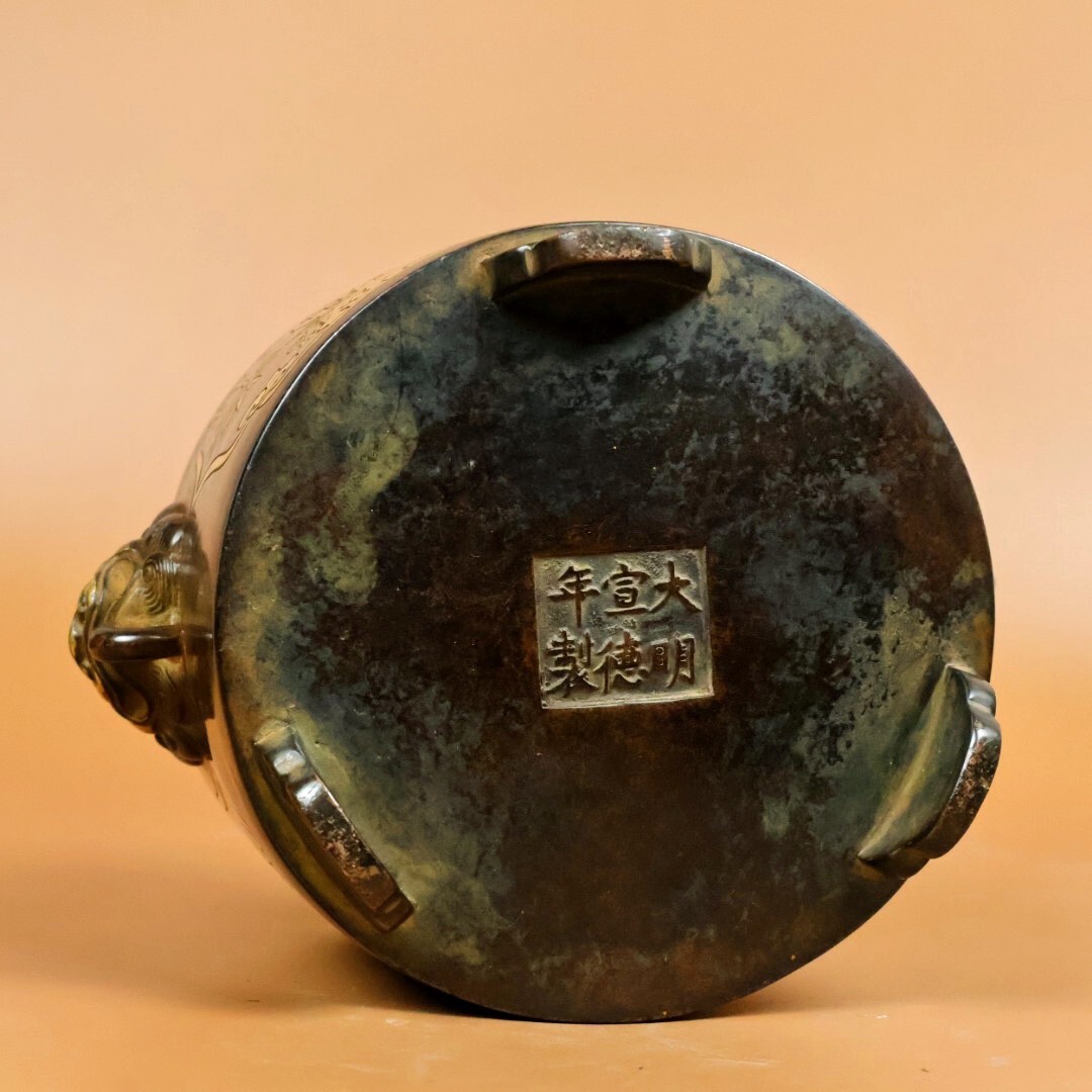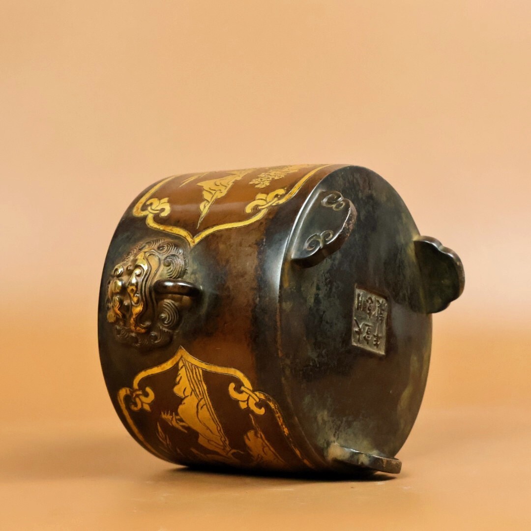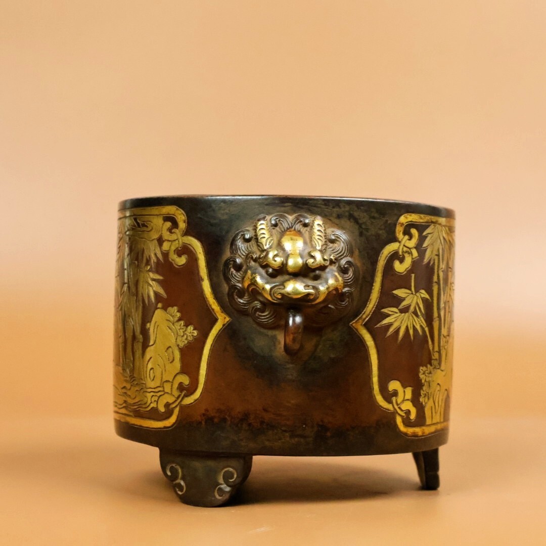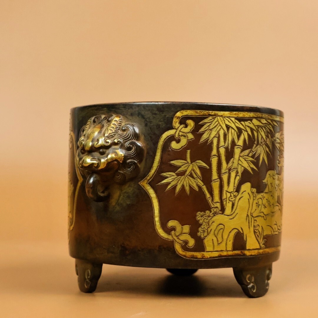 【瓏】古銅鏨刻彫 塗金竹鹿紋 獅耳香炉 大明宣徳年製 銅器 古美術 骨董品 香道具 蔵出
