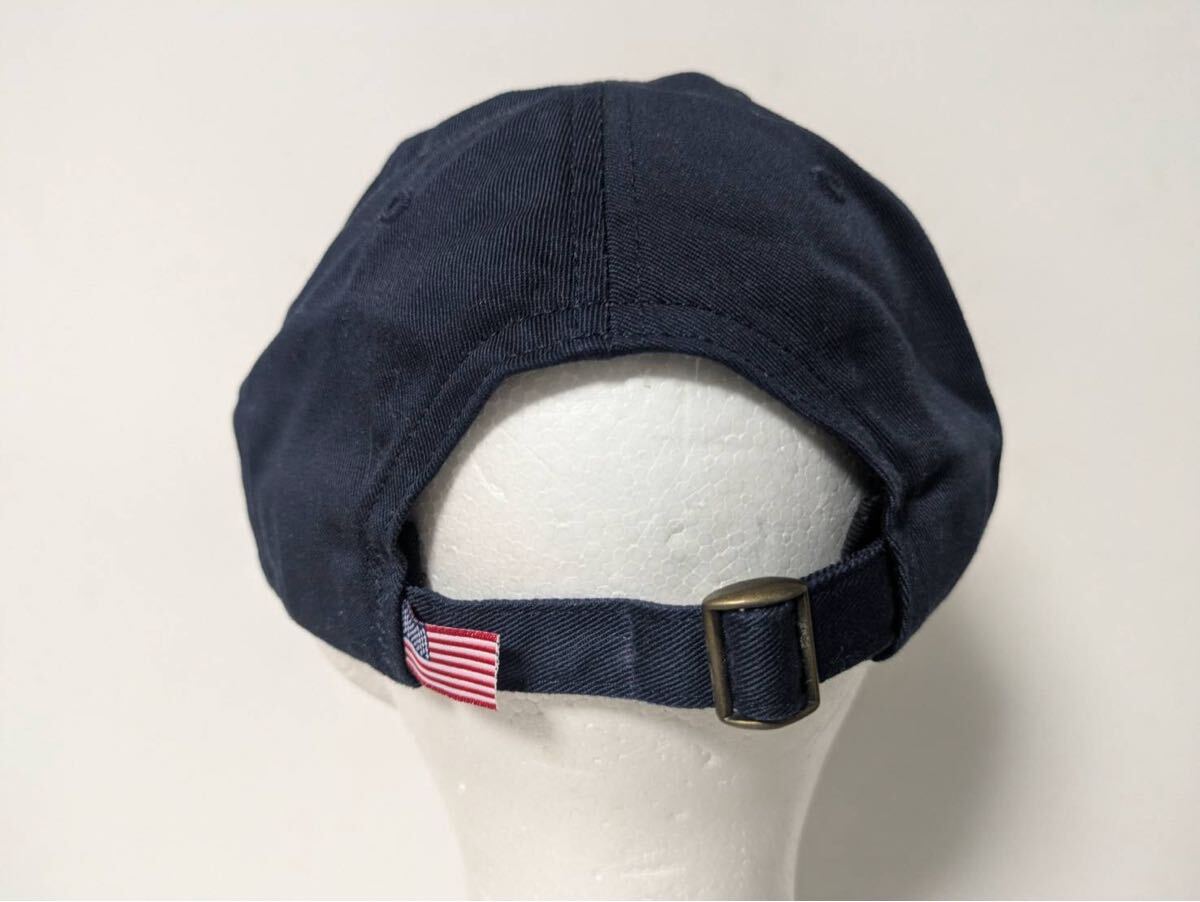 Constructed from 100% cotton twill, the cap offers a sturdy texture that softens beautifully over time. It features a deep navy color, a slightly longer brim for a sharper silhouette, and a small American flag tag at the back for subtle flair. The rear adjustable strap with brass buckle ensures a flexible, unisex fit.