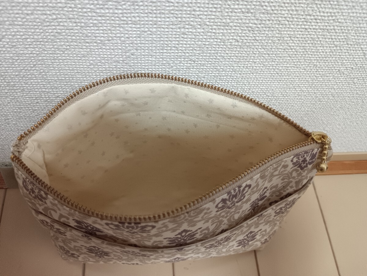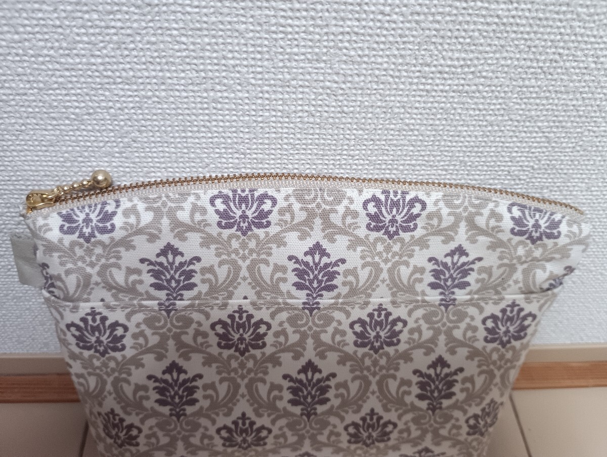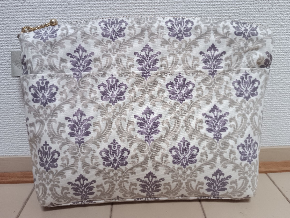ハンドメイド  YUWA 紫&グレージュ色のダマスク柄のポーチです。前にポケット付いてます。中は生成りにシルバーのドット&星柄の生地です。20cmのファスナーを使用しています。通帳入れにもお使い頂けます。