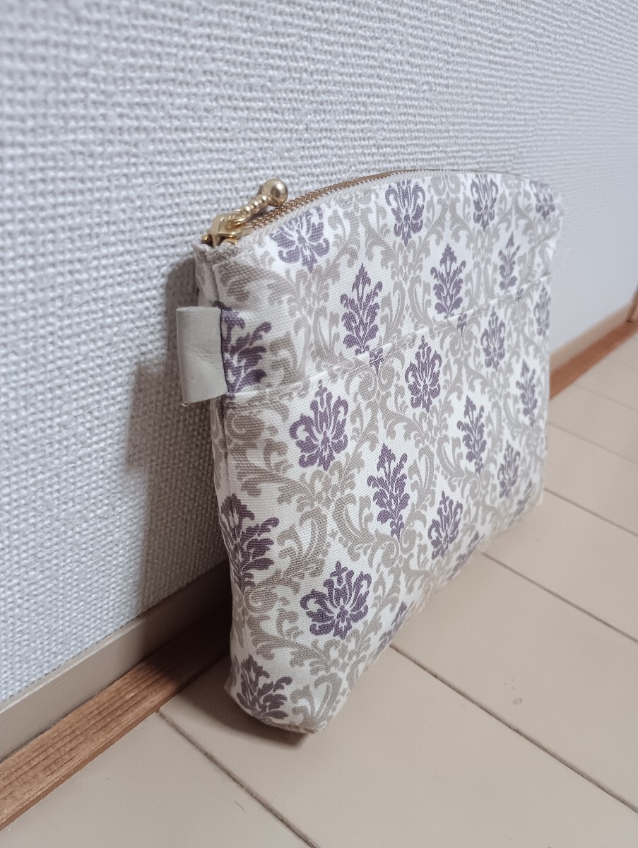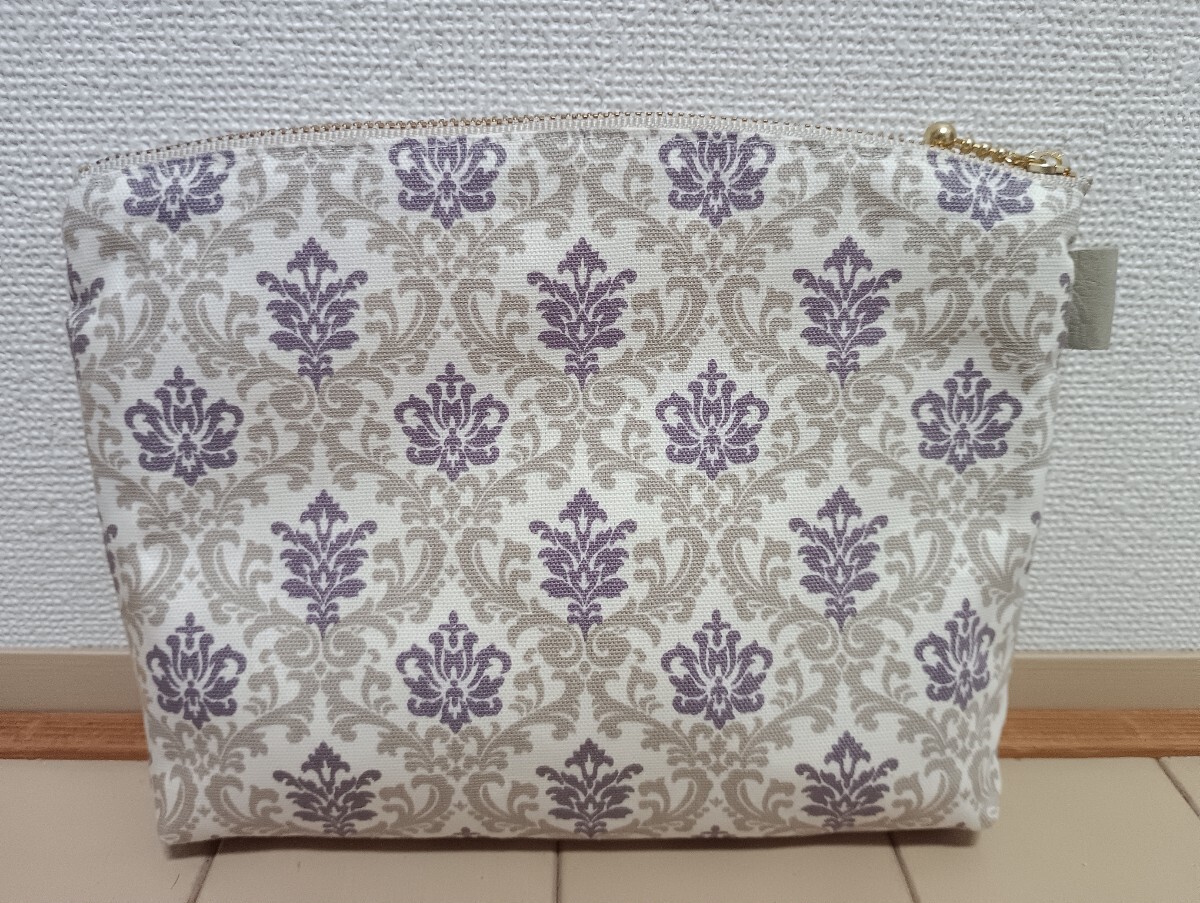 ☆ハンドメイド☆YUWA☆紫&グレージュ色☆ダマスク柄 ポーチ☆通帳ケース☆前ポケット有☆