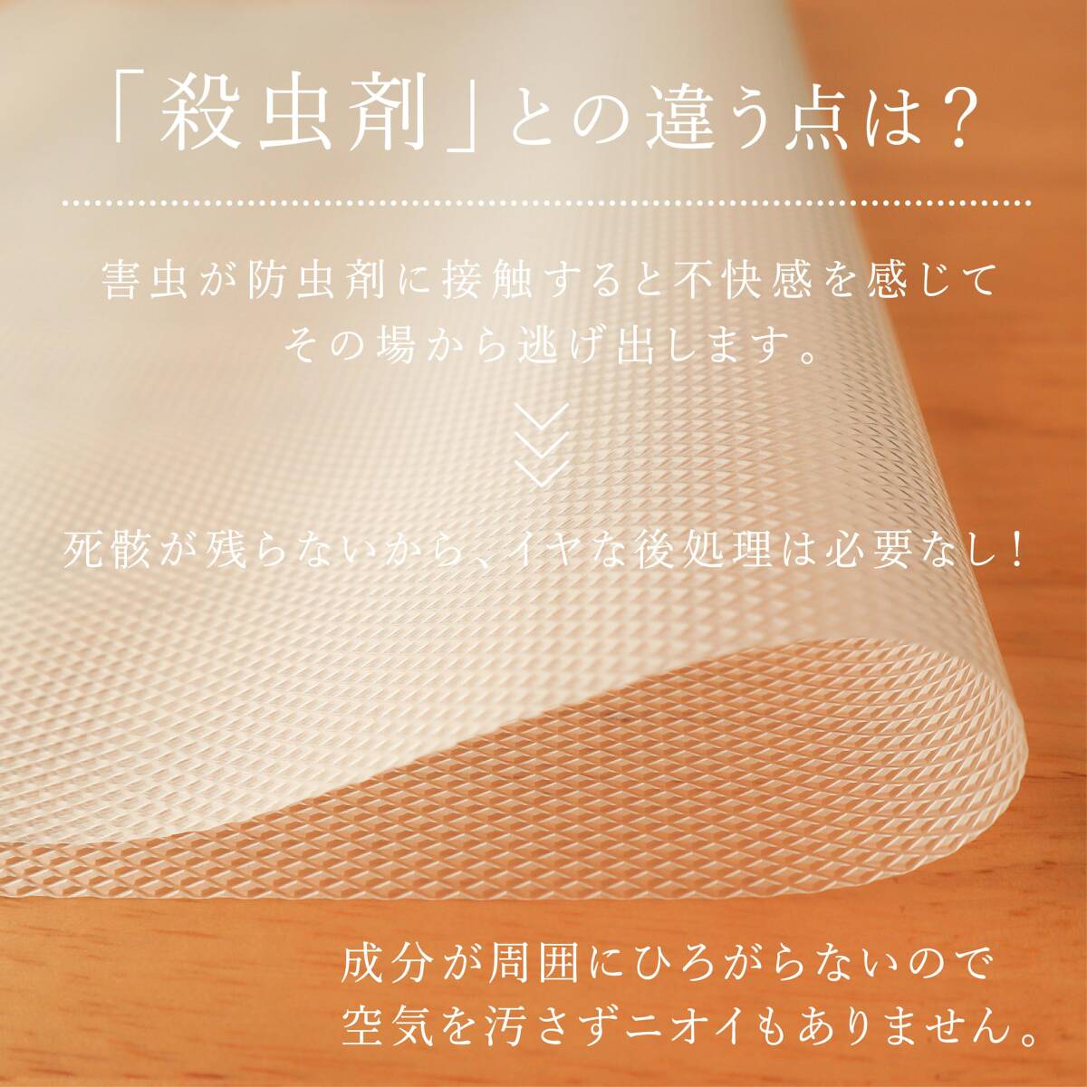 ・敷くだけで害虫を寄せ付けません(br)害虫が防虫剤に接触すると不快感を感じてその場から逃げ出します。殺虫剤とは異なり、死骸が残りませんのでいやな後処理もいりません