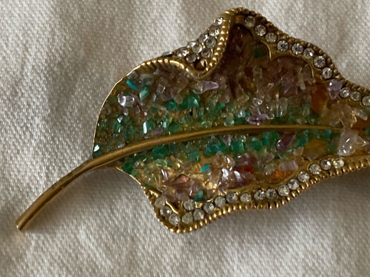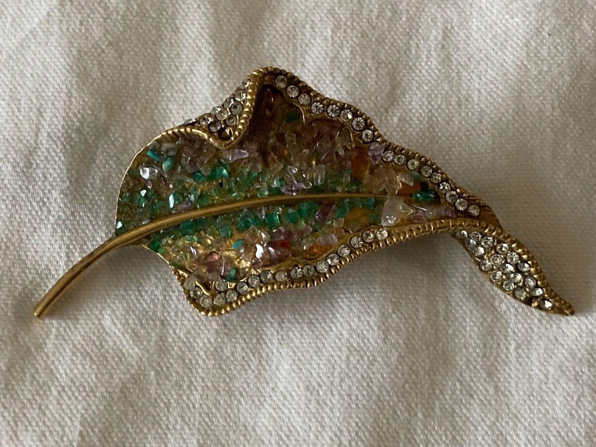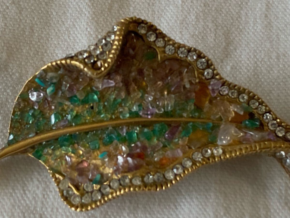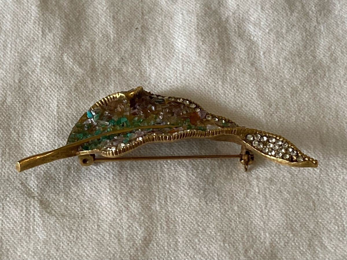 多色の葉っぱ型ブローチ、ラインストーンの装飾が美しい。