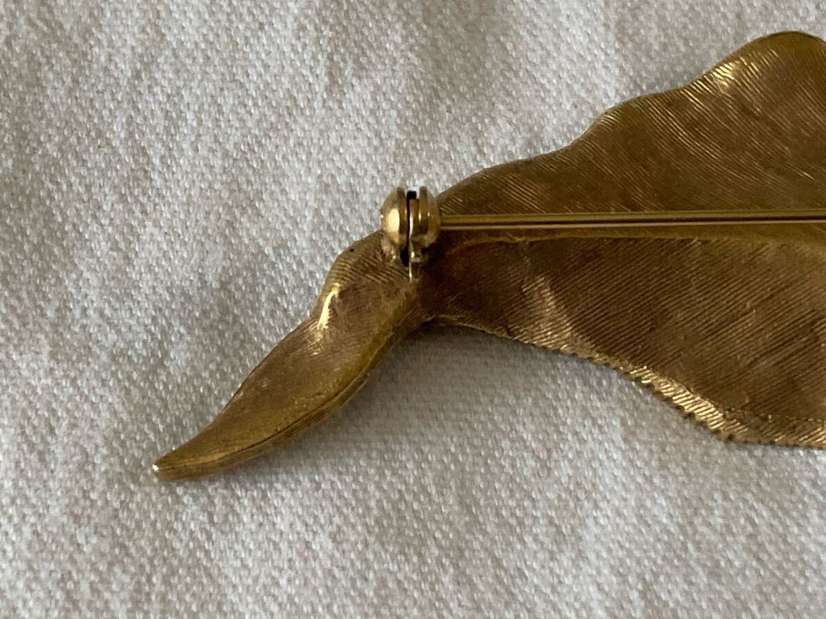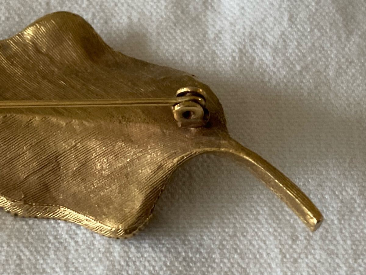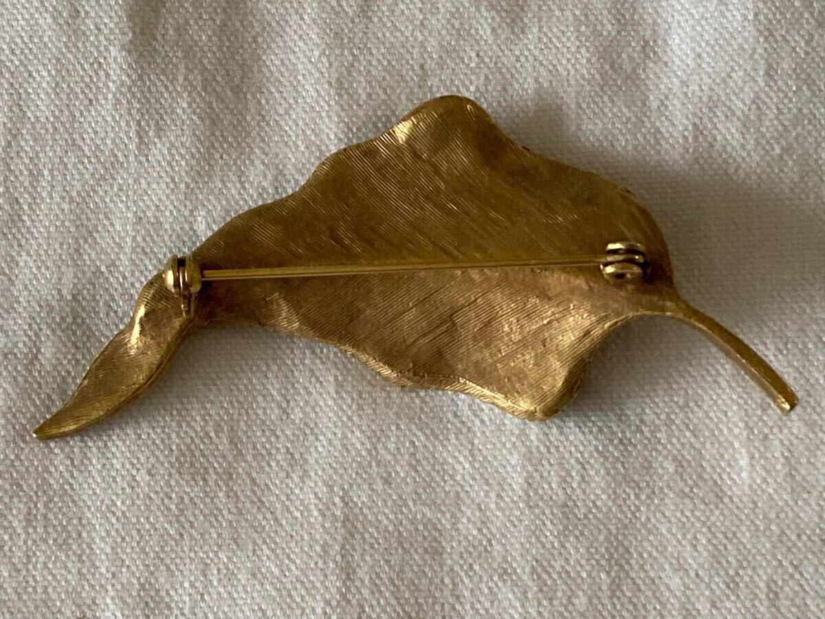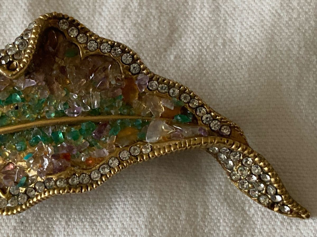 多色の葉っぱ型ブローチ、ラインストーンの装飾が美しい。