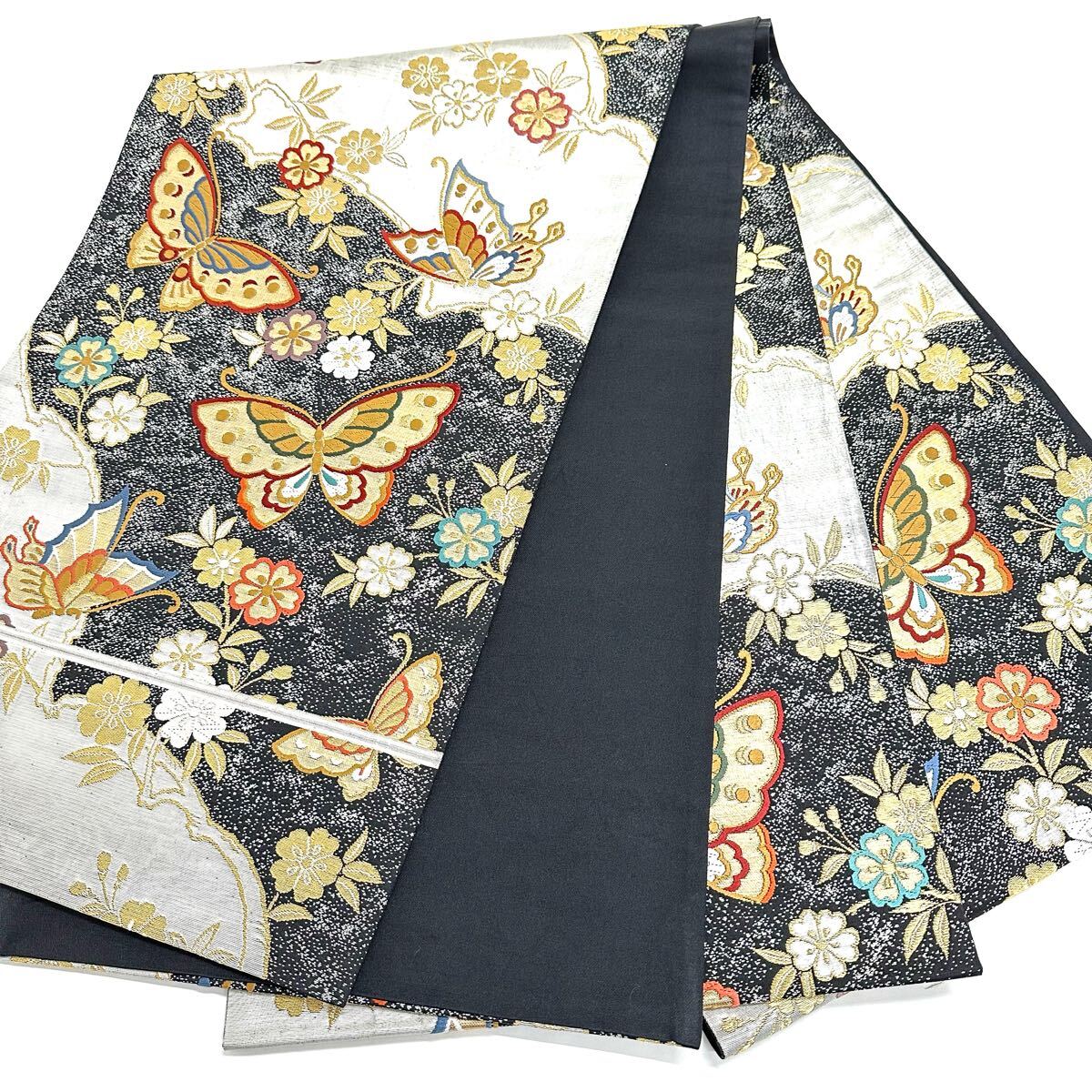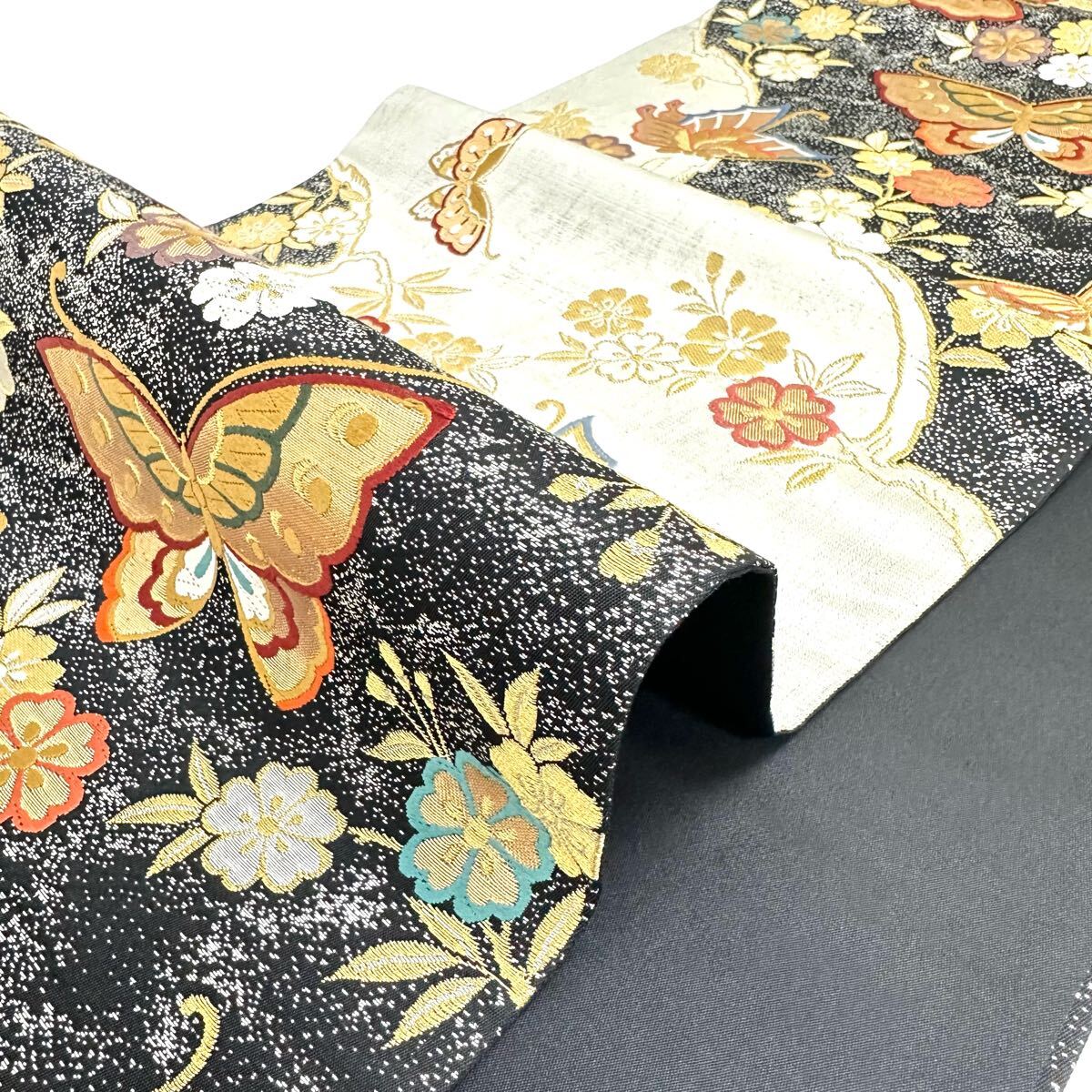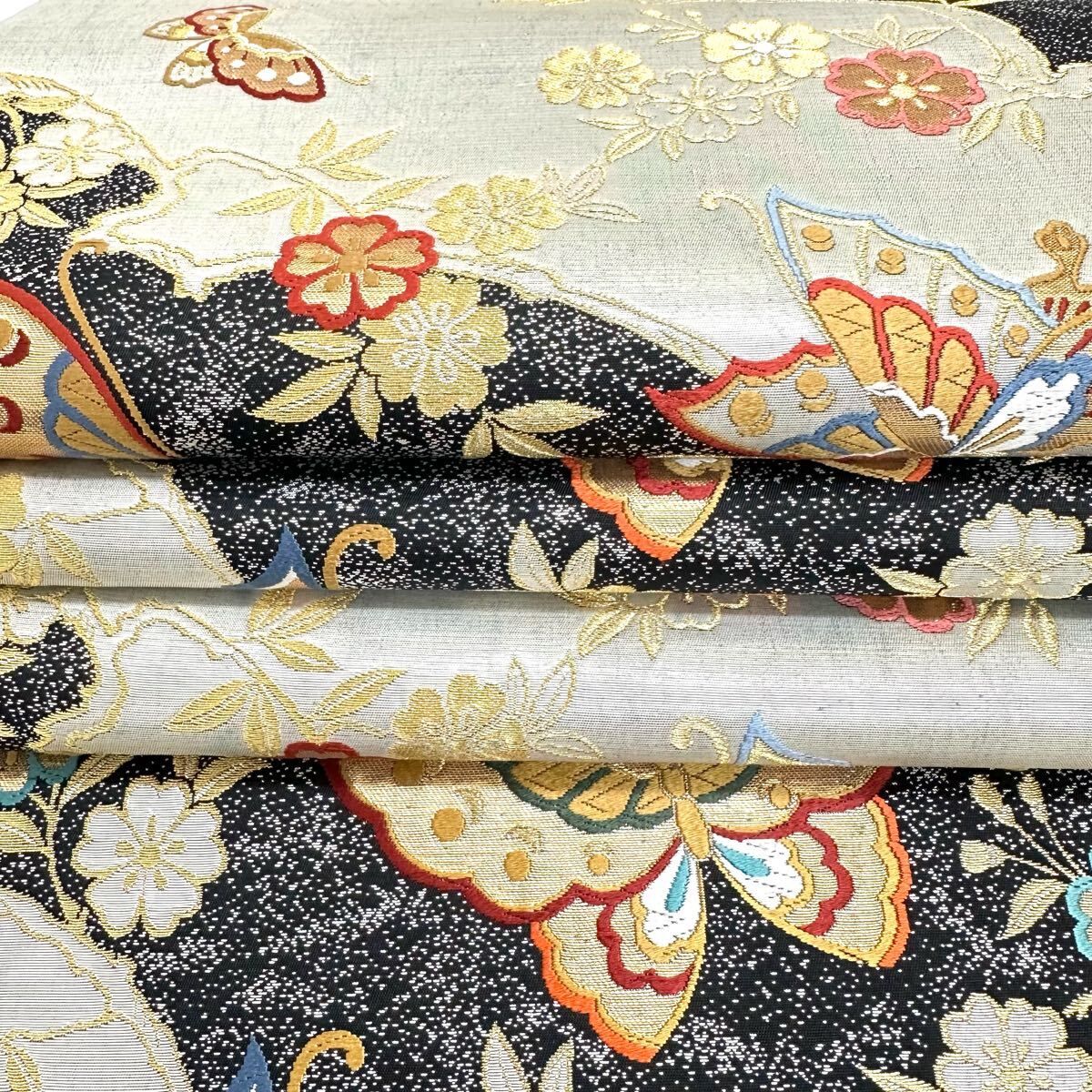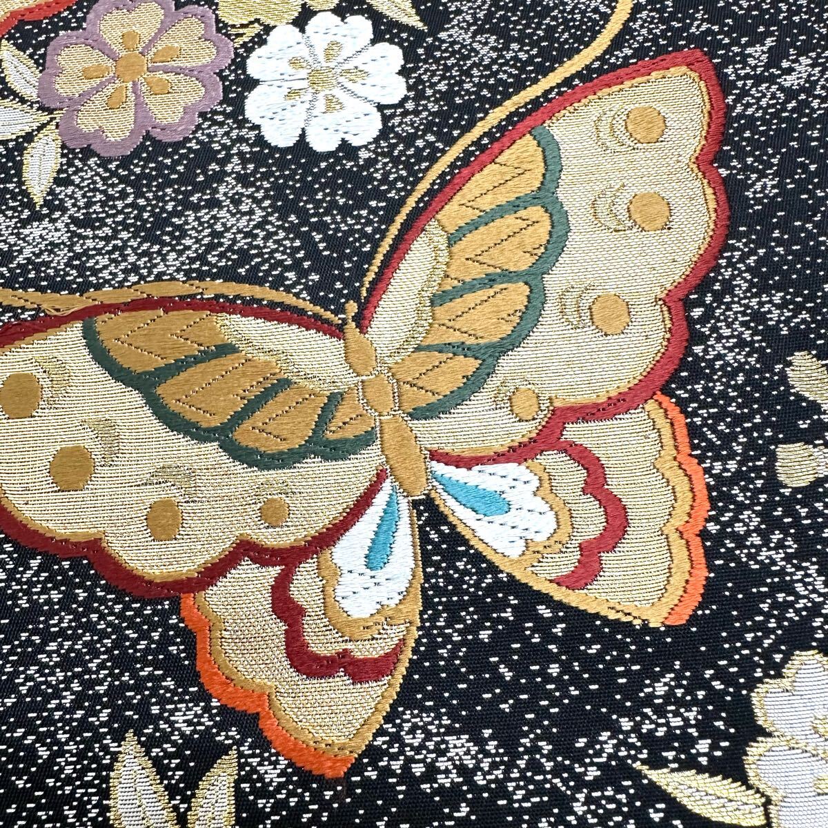 【七福】c657 逸品 高級品 正絹 袋帯 六通 三松 蝶 金糸 銀糸 刺繍 豪華