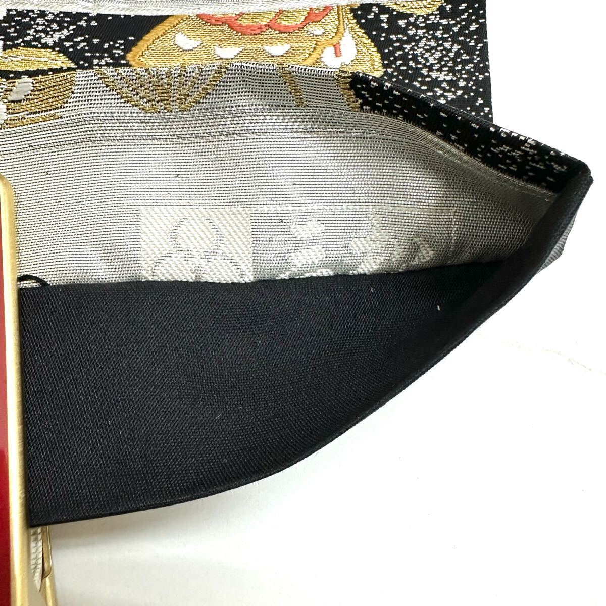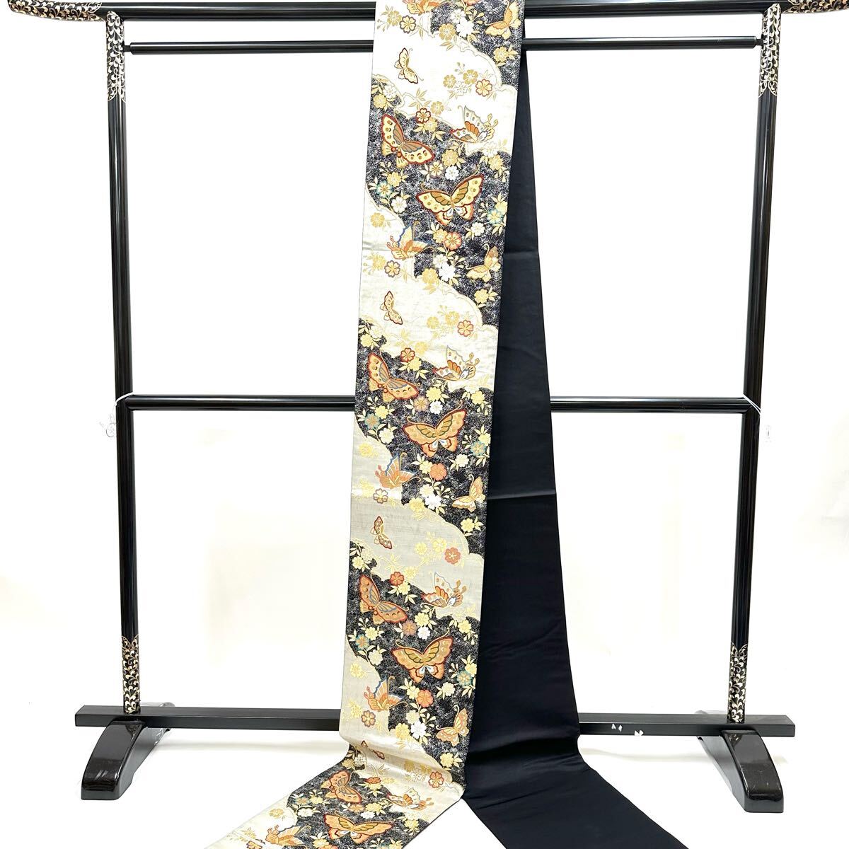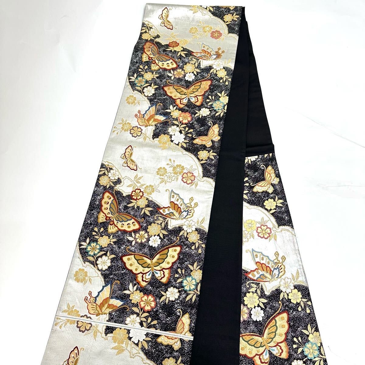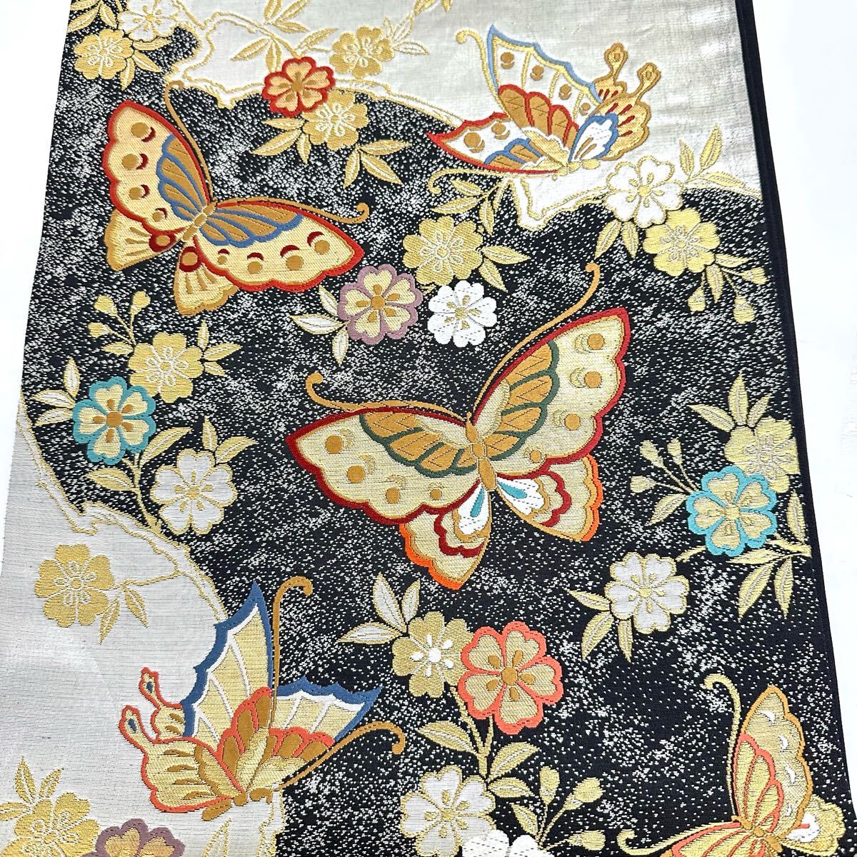 【七福】c657 逸品 高級品 正絹 袋帯 六通 三松 蝶 金糸 銀糸 刺繍 豪華