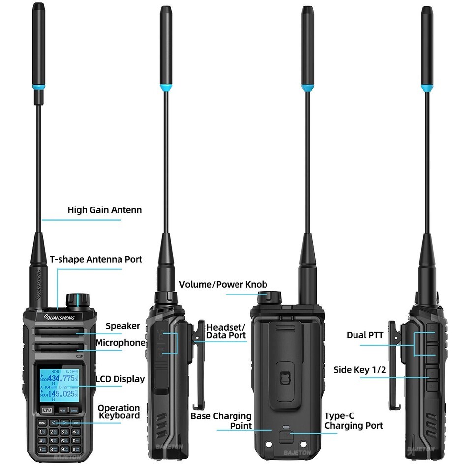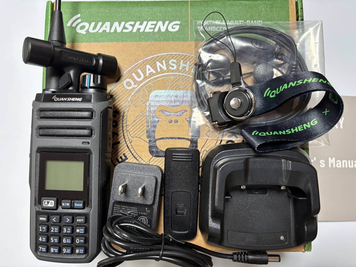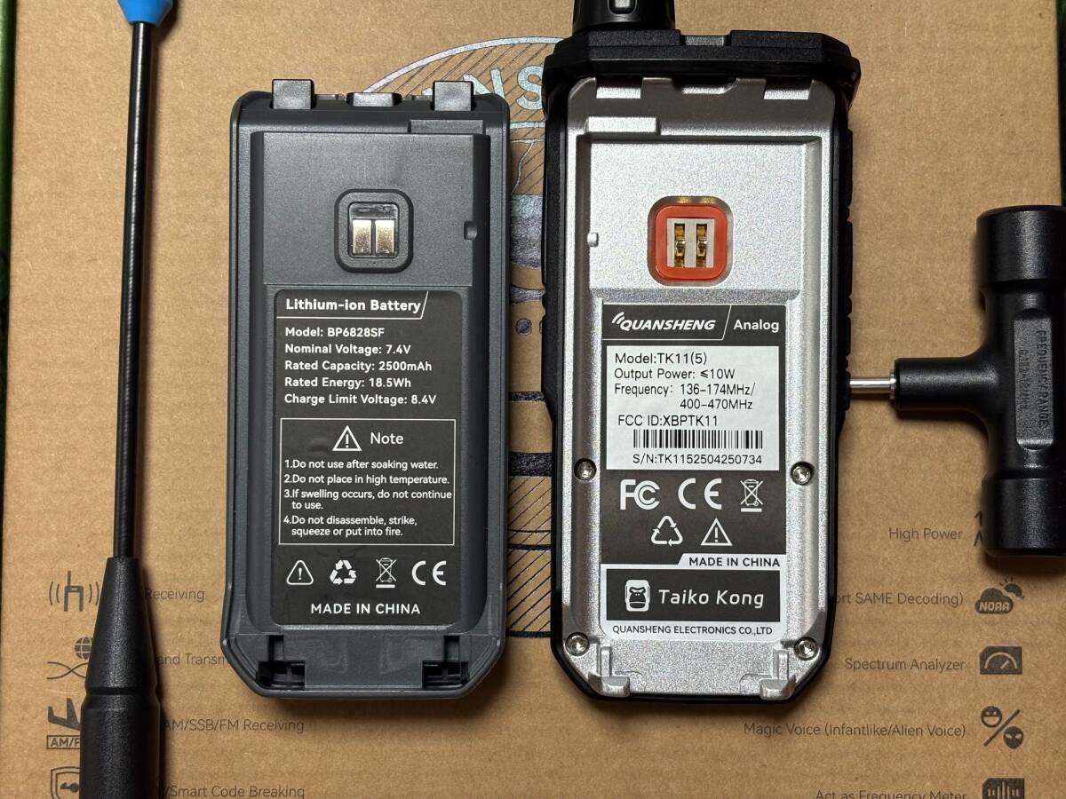 ・パッケージ内容:トランシーバー本体、付属アンテナ(VHF~UHF送信用1、受信専用1)、強化イヤホンマイク、バッテリー、充電ユニット、英文説明書、日本語簡訳