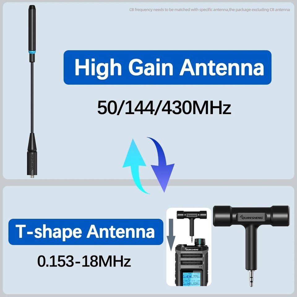画面と操作ボタンはバックライトで夜間も快適、送受信用に6m,2m,430MHz帯のトライバンドアンテナのほか中波~短波用の受信専用超小型アンテナが付属します。送受信と受信専用に2つのアンテナジャックがあり短波帯受信はロングワイヤーなど外部アンテナをお勧めします。CB~10mの送信可能範囲は付属トライバンドアンテナでローカル局が聞こえました。