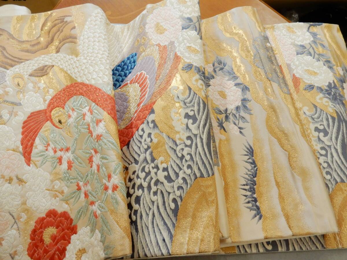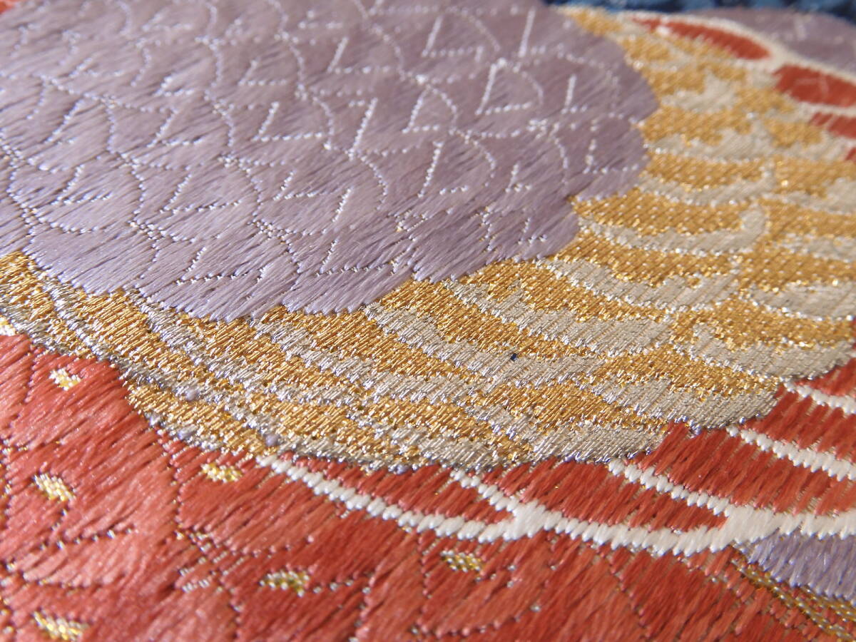 <銀の斧>正絹・九百錦24金箔・しょう美袋帯・孔雀・紅白・金輝く