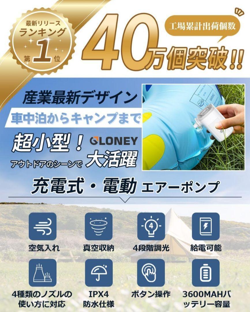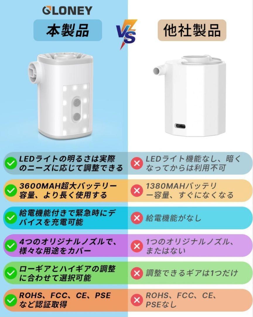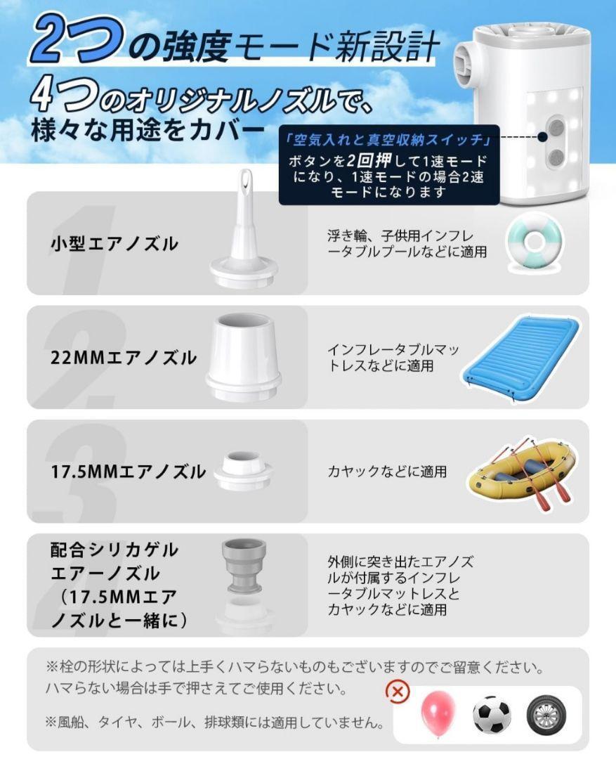 4つのノズルで様々な用途をカバー IPX4防水仕様ので、キャンプのインフレーターマット、エアークッションはもちろん、BBQの火起こしの送風、夏の浮き輪など様々な用途で活躍します。 パッケージ内容 電動エアーポンプ本体、4つのノズル、Type-C充電ケーブル、ストラップ、収納袋、日本語取扱説明書 $$2980