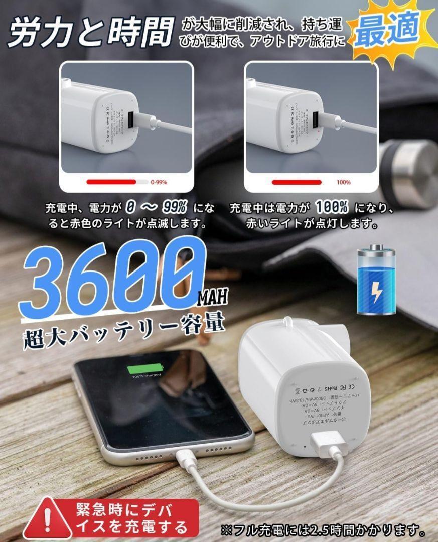 3600mAhの充電式バッテリーが搭載されており、入力電力:5V / 2A、USBですばやく充電でき、出力電力も5V / 2Aです。