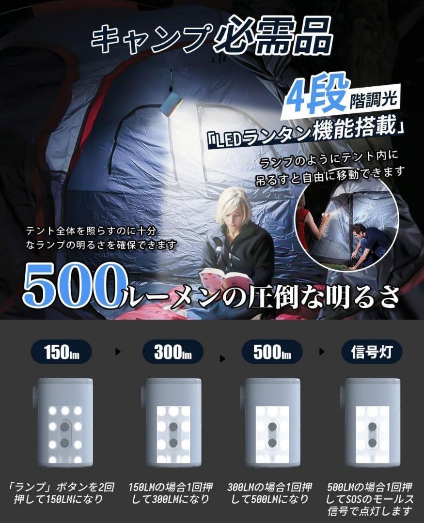 1ギア:150ルーメン、2ギア:300ルーメン、3ギア:500ルーメンがあり、緊急時に使用できるSOSモードもあります。