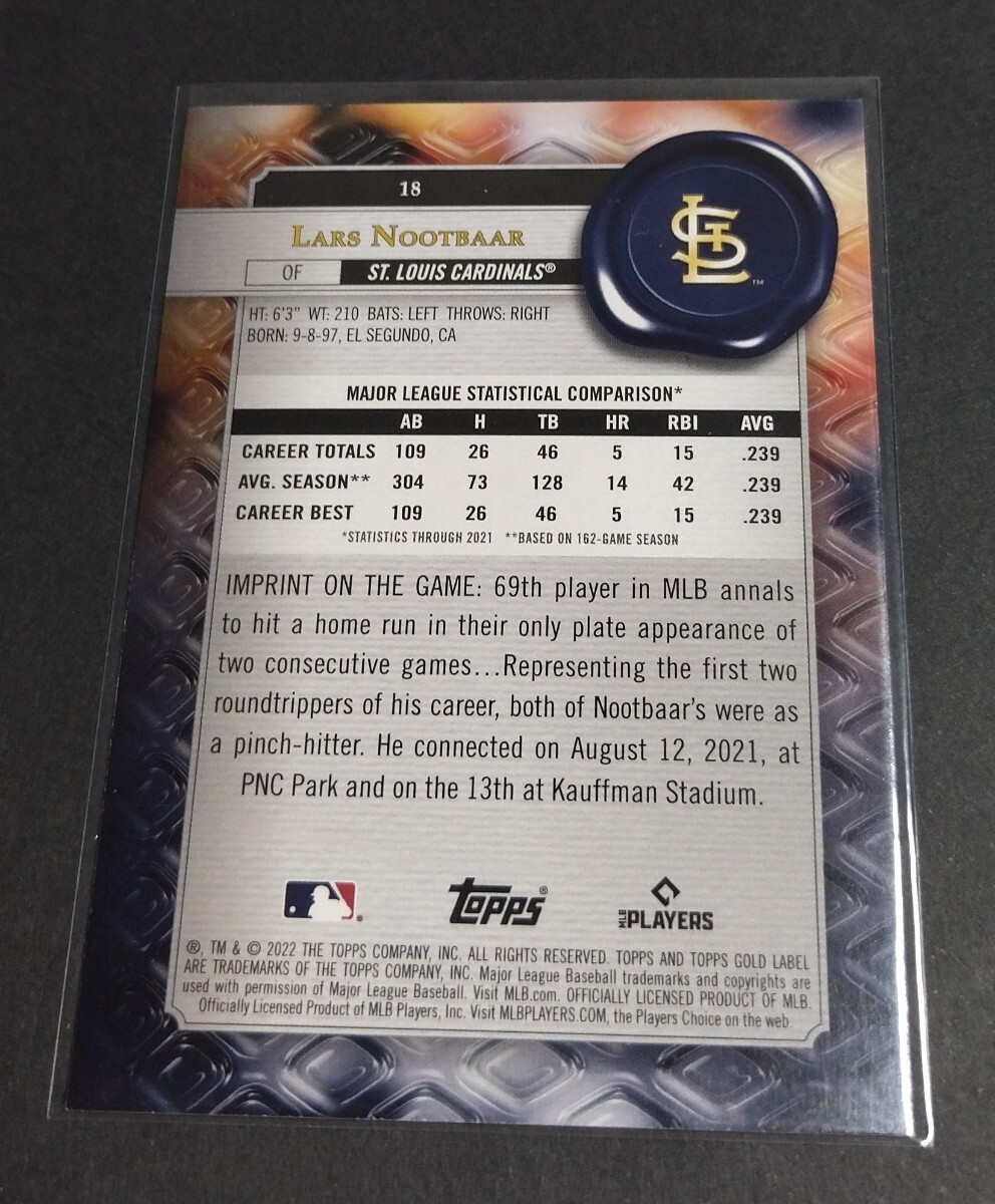 MLB 2022年topps Gold Label ラーズヌートバー(カージナルス) ルーキーカード。CLASS 3 No,18。 Cardinals LARS NOOTBAAR RC