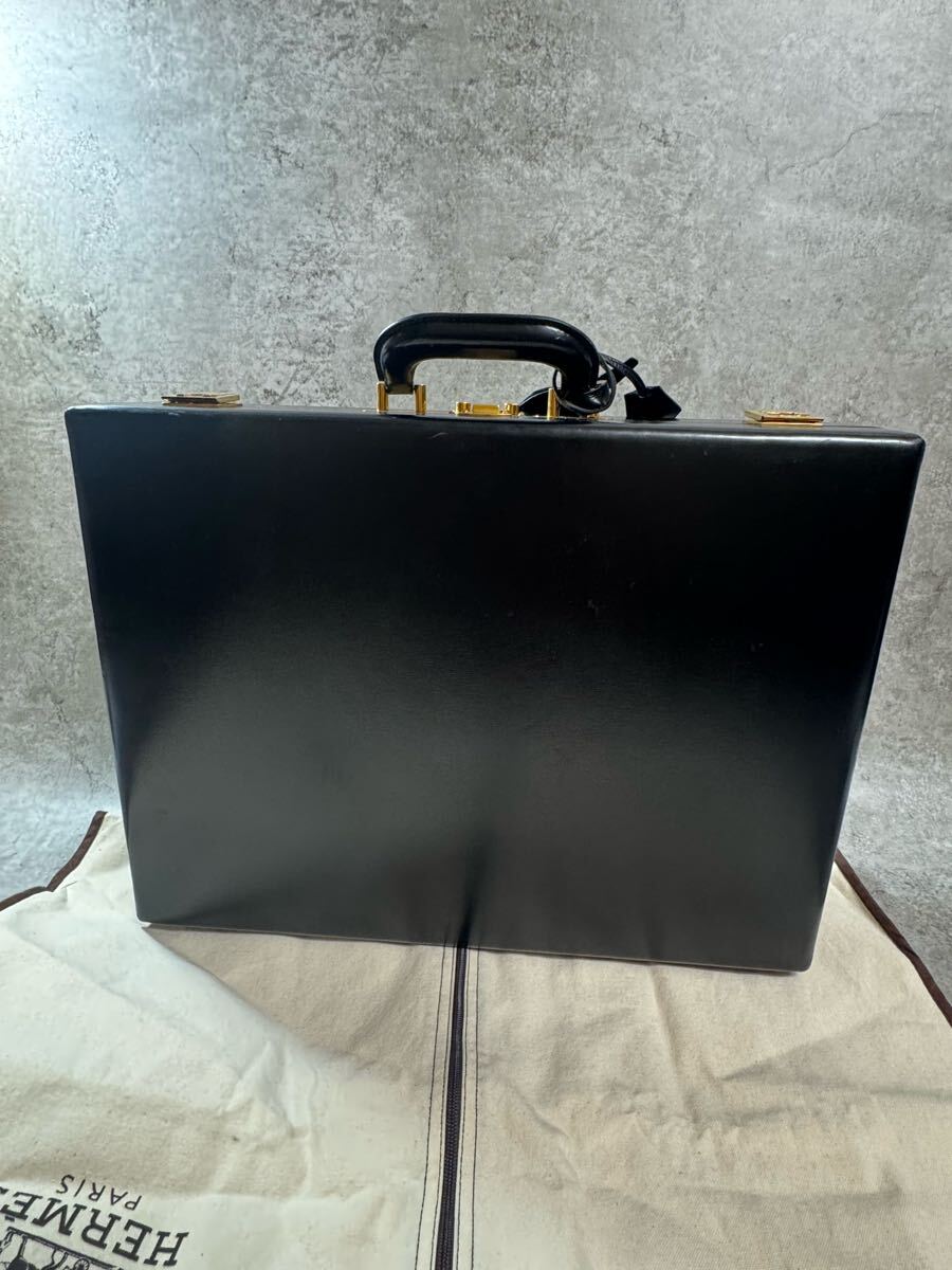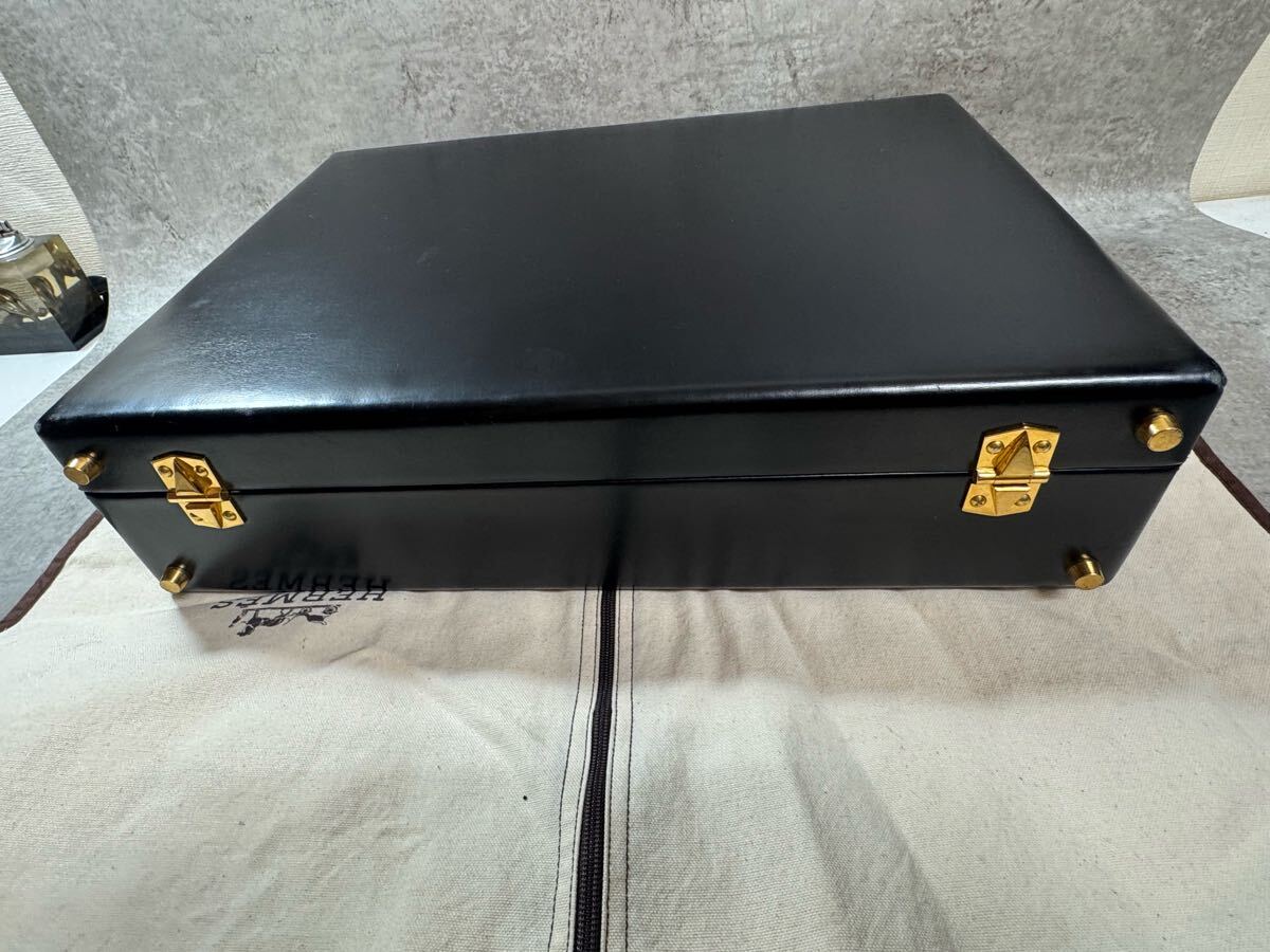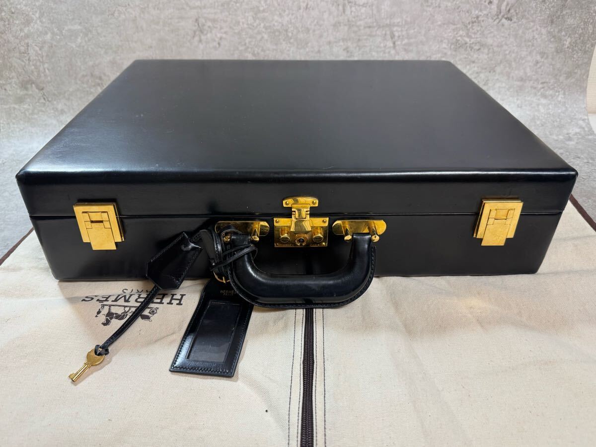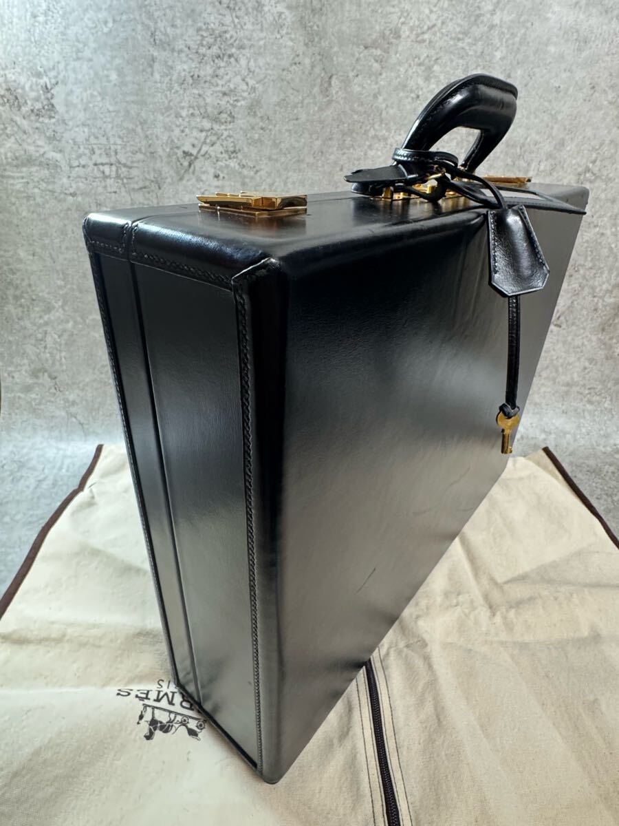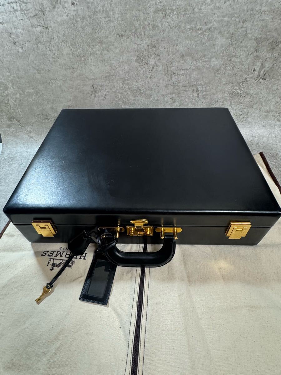美品 HERMES エルメス ボックスカーフ ヴィンテージ トランクボックス アタッシュケース M刻印 ブラック系×ゴールド金具 出品します。