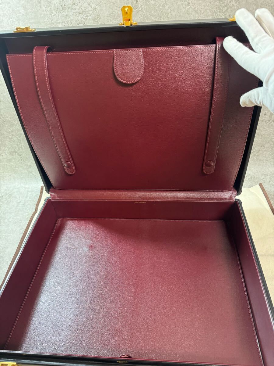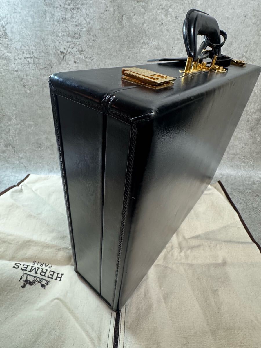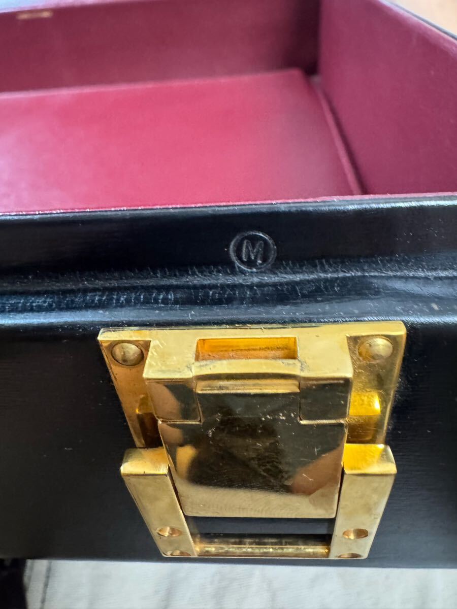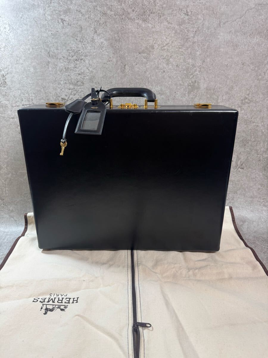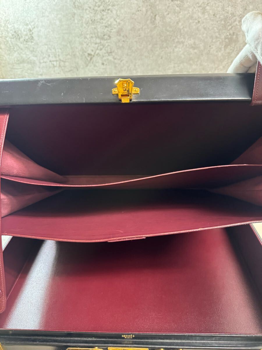美品 HERMES エルメス ボックスカーフ ヴィンテージ トランクボックス アタッシュケース M刻印 ブラック系×ゴールド金具 出品します。
