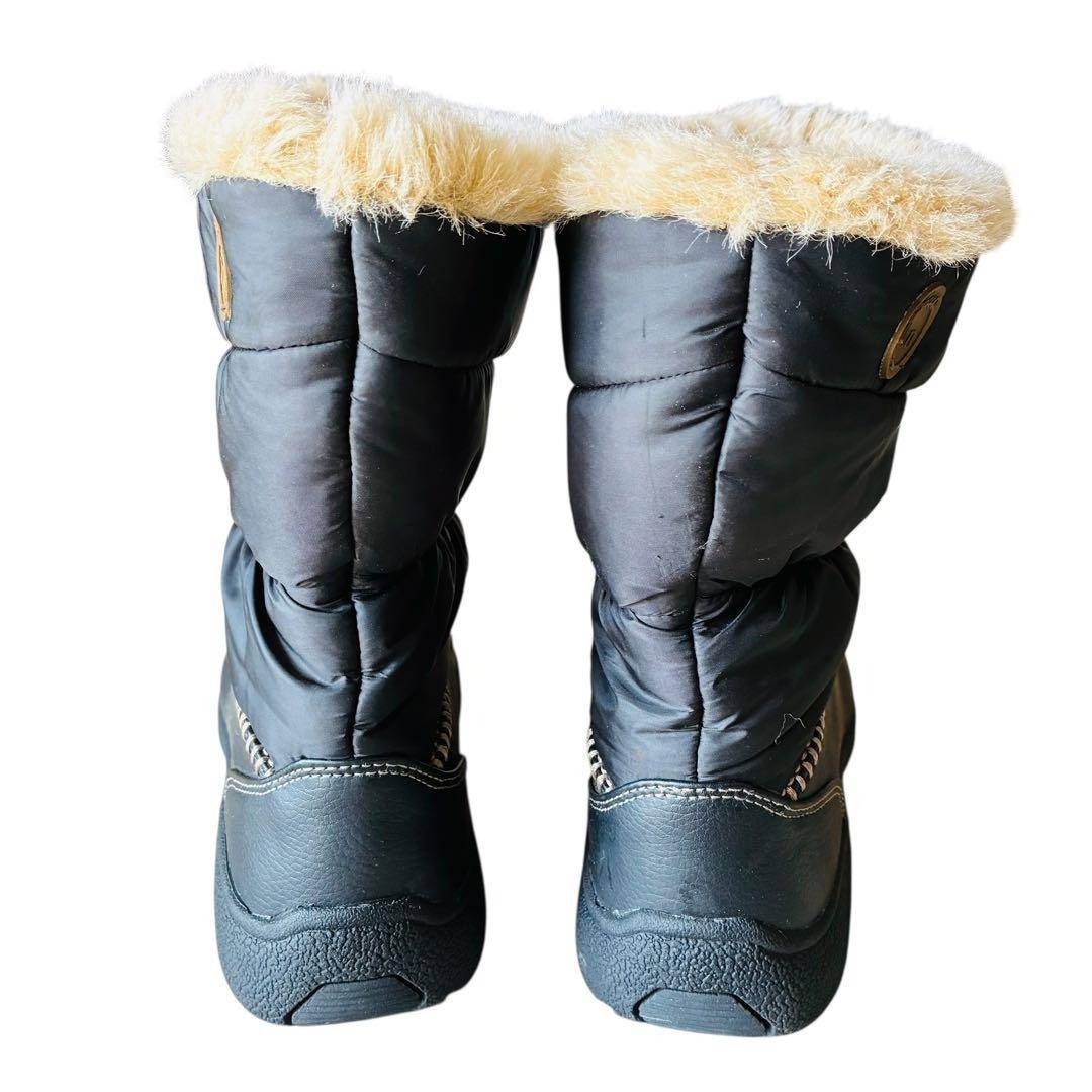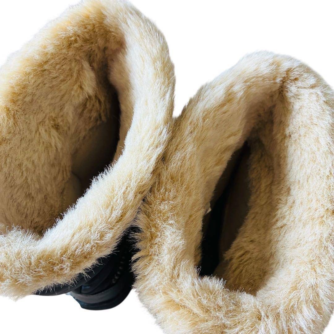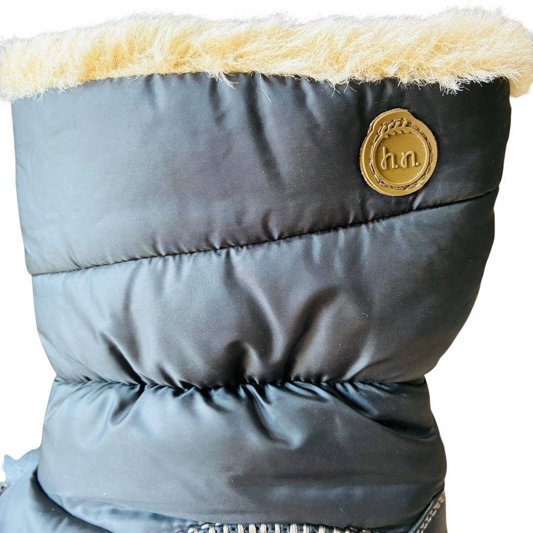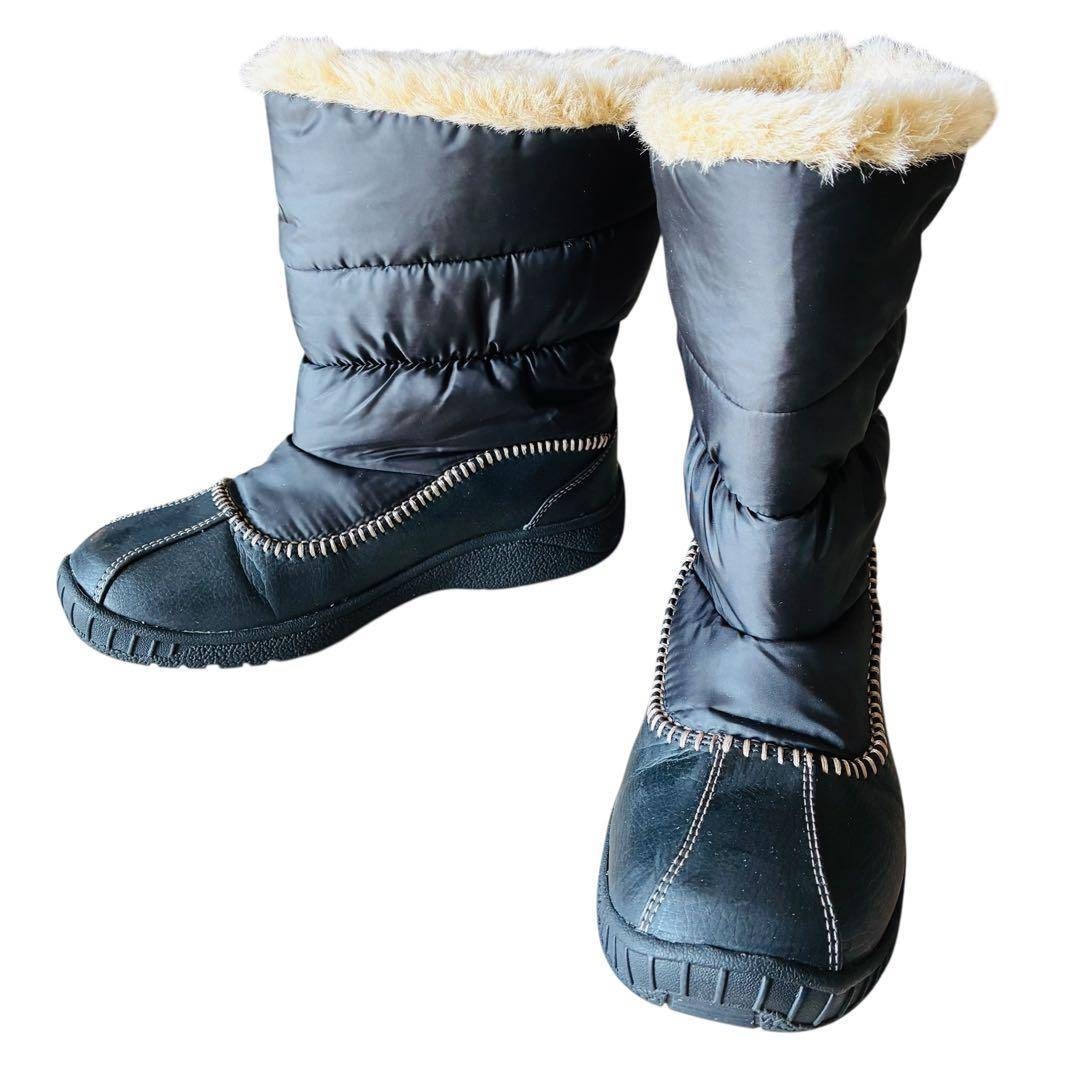 ファー付きの黒いスノーブーツで、合成皮革とナイロンの素材を使用。ラバーソールで滑りにくい設計。