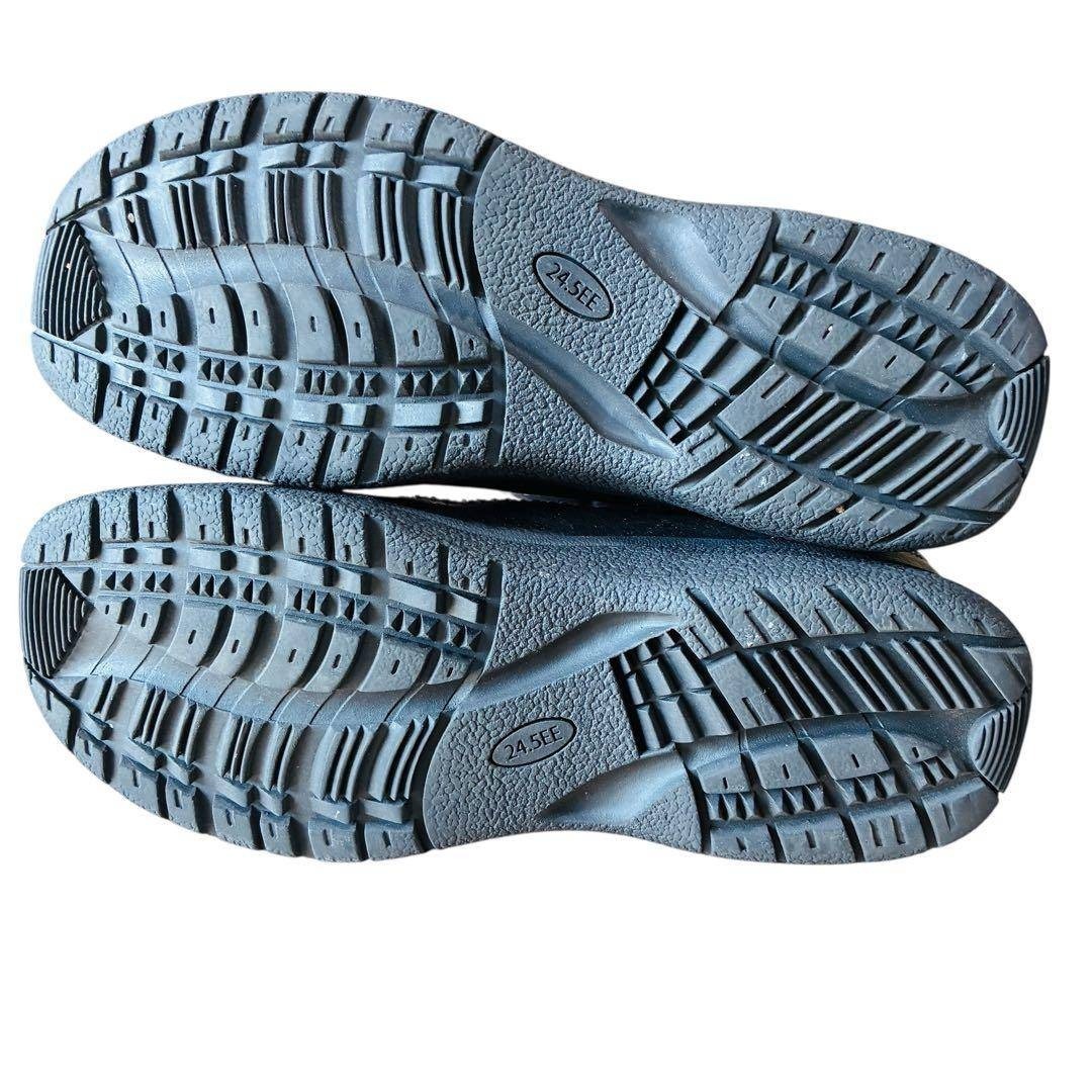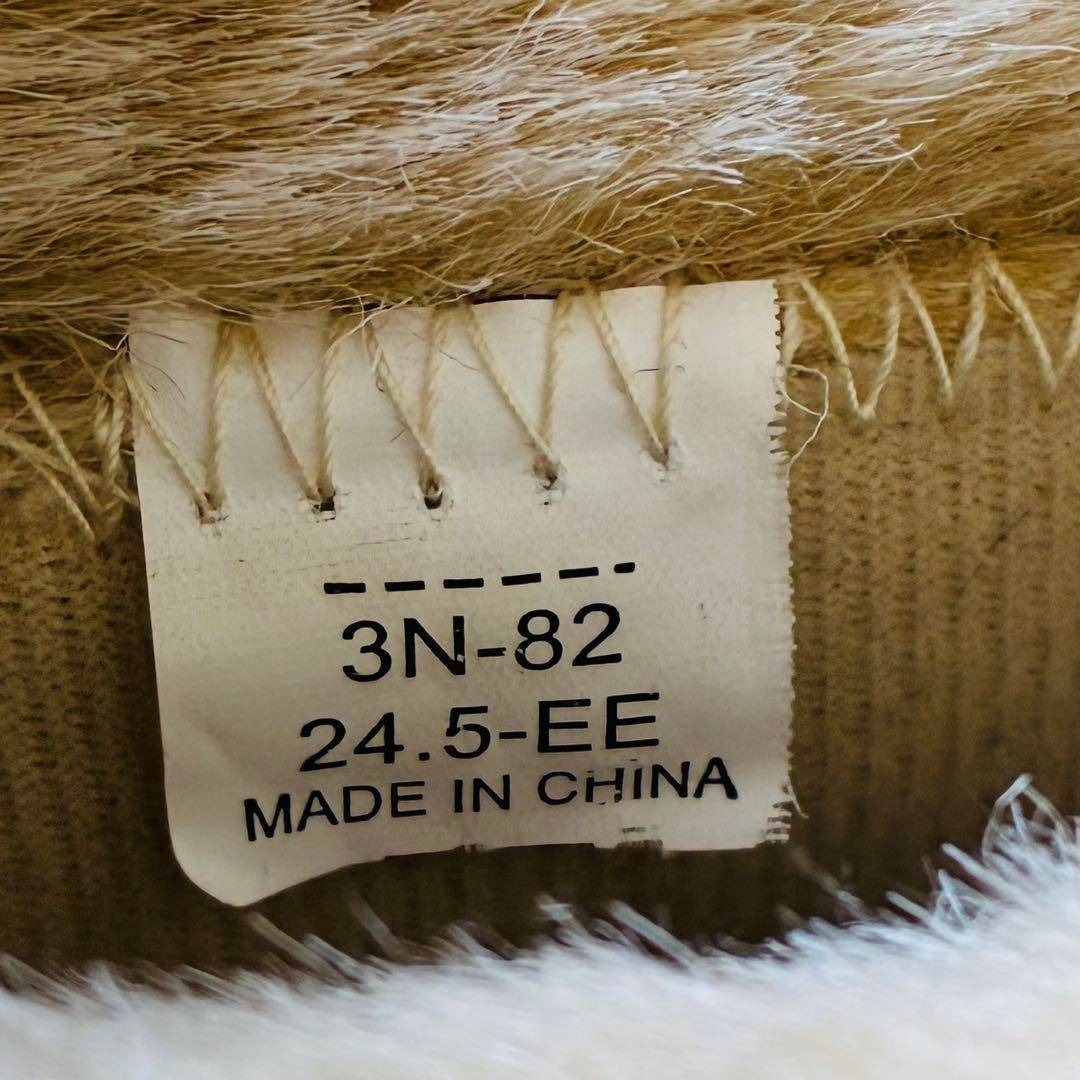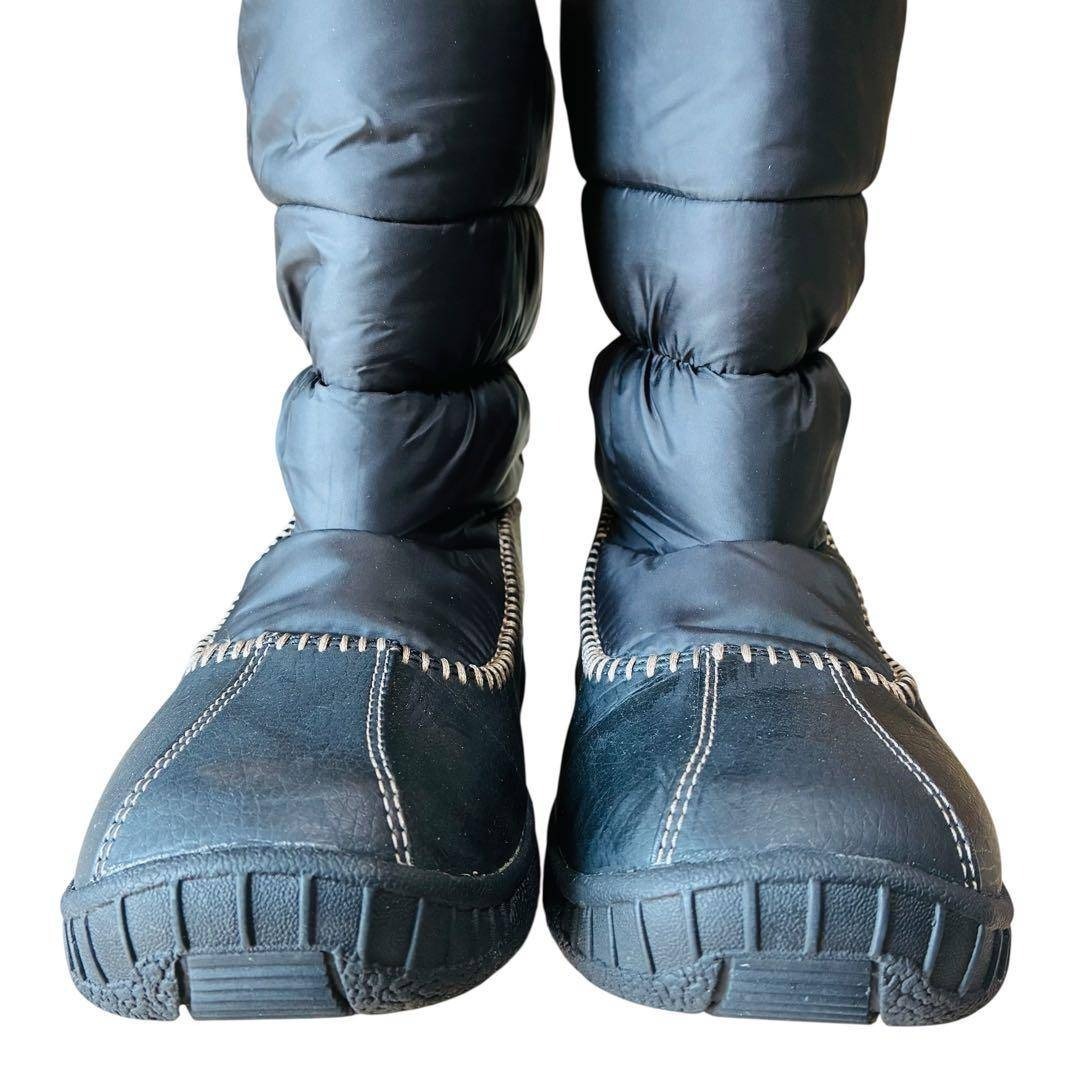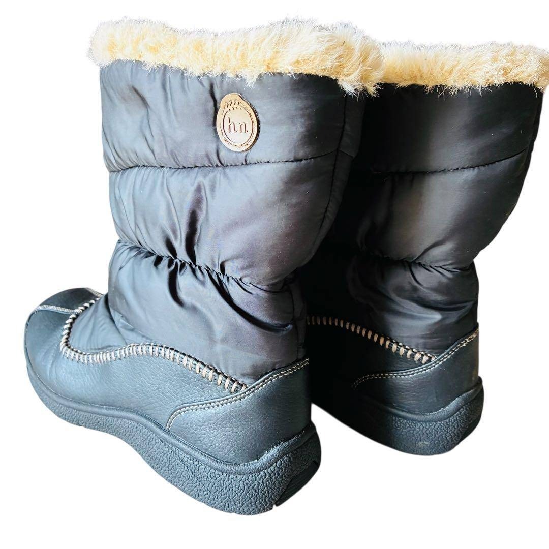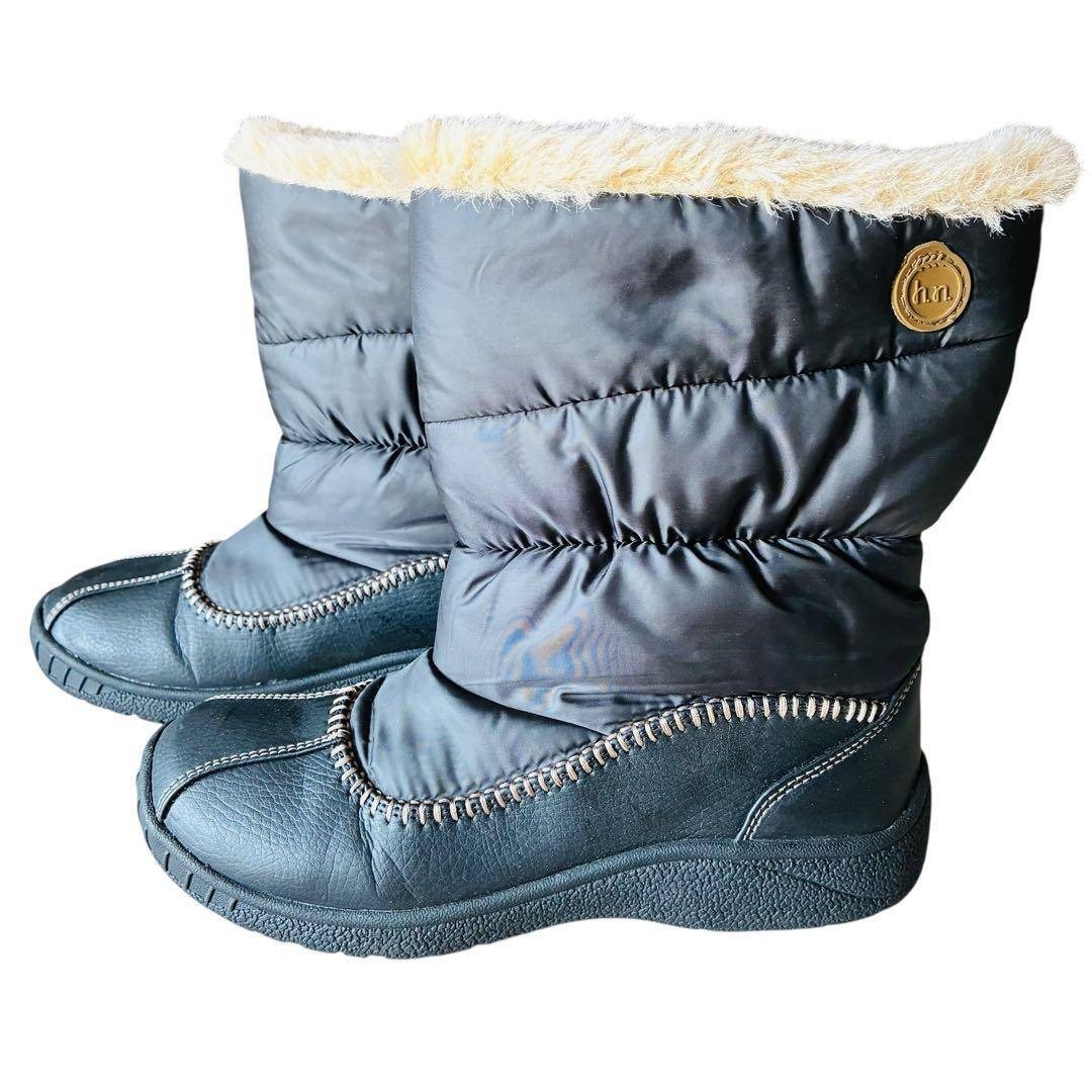 ファー付きの黒いスノーブーツで、合成皮革とナイロンの素材を使用。ラバーソールで滑りにくい設計。