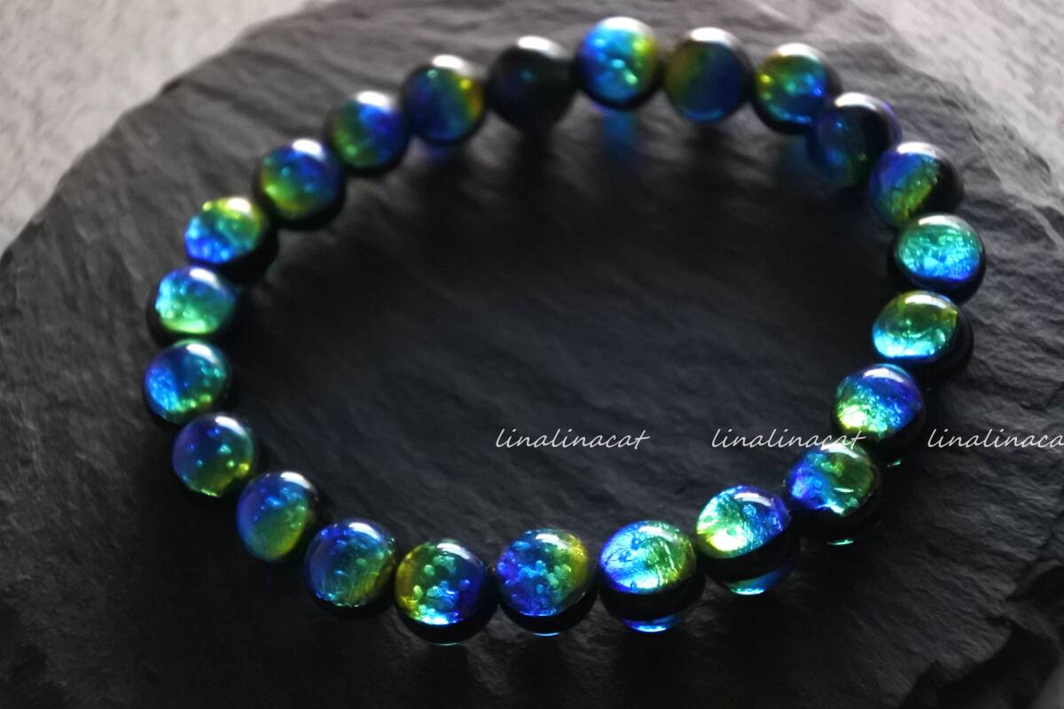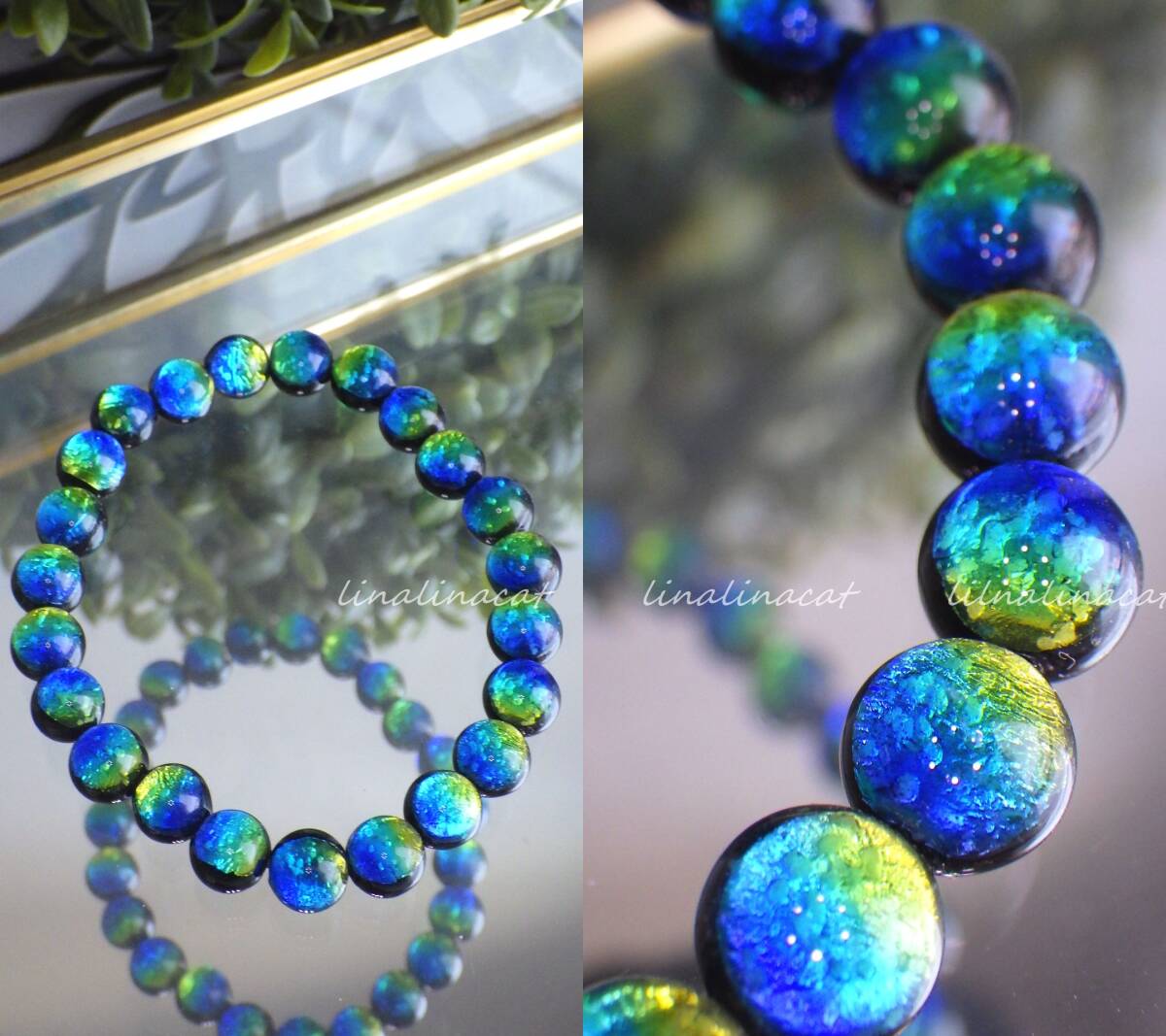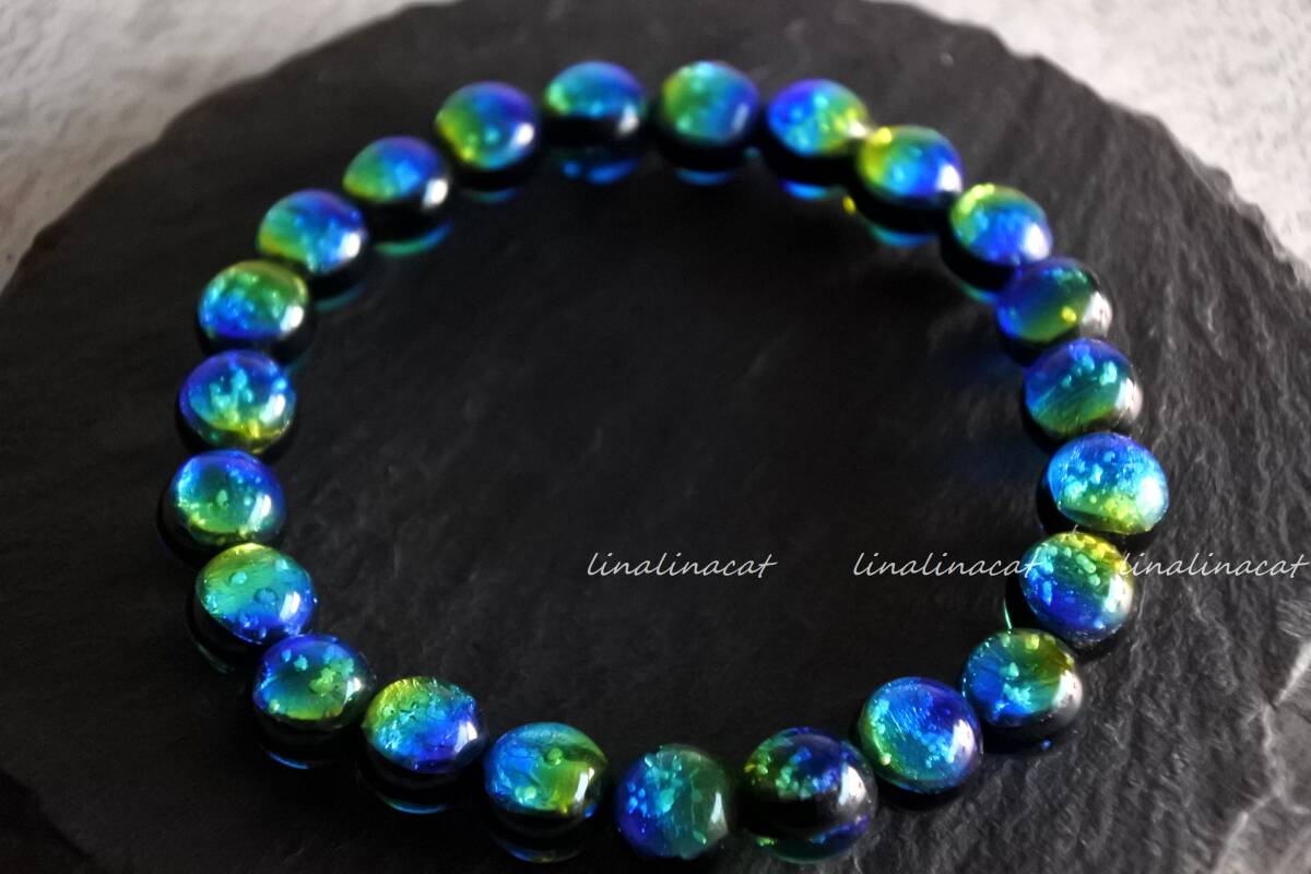 新品 ホタルガラス ブレスレット① ケラマブルー 蓄光 夜光 腕周りサイズ: 15.5cm 沖縄県慶良間諸島に広がるエメラルドグリーンの美しい海をケラマブルーと称し、その美しい海をモチーフにしたホタルガラスです。 日光を蓄え暗闇でほんのりと光る夜光(蓄光)光るタイプです。 時間とともに表情を変える海を思わせる琉球ガラス。 海の底から見上げた立ち昇る泡をとじこめたような美しいお品です。 他にも別シリーズやブレスレットなども出品中です。 ※ホタルガラスとは 沖縄で育まれた手仕事仕上げの美しいガラスで、その深い青色が沖縄の海を感じさせ、お土産として人気のホタルガラスは、とんぼ玉と同じようにバーナーワークと呼ばれる成形技法を用いて作られた穴のあいたガラス玉です 職人がひとつひとつ色の付いたガラスを溶かして鉄心に丸め、水飴のように溶けた状態のガラスに、銀箔(ぎんぱく)を重ね、特殊な技法で美しい色を表現しています 沖縄発祥ではないとんぼ玉の一種であるホタルガラスが、いつ頃から沖縄のお土産として親しまれてきたか明確な記録はありませんが、希少な珊瑚の製品に替わるものということで80年代後半から注目され、深い海を思わせる色彩がたくさんの人の心を掴んだのではないかと云われています ナチュラルなスタイルがお好きな方、天然石がお好きな方などにもお勧めです。 | ||