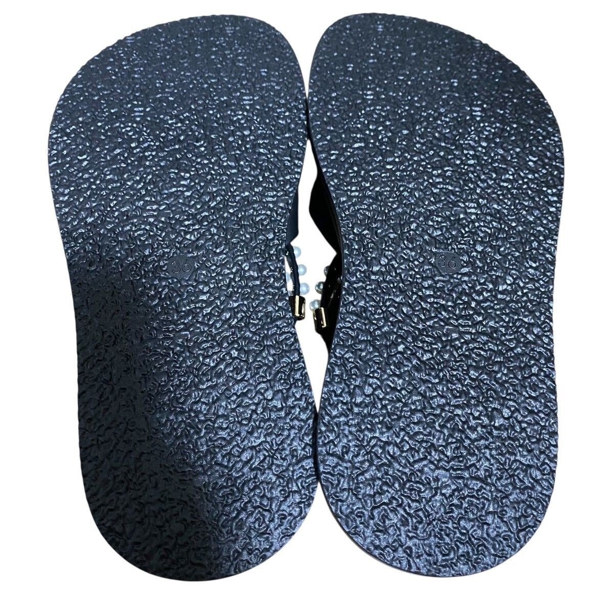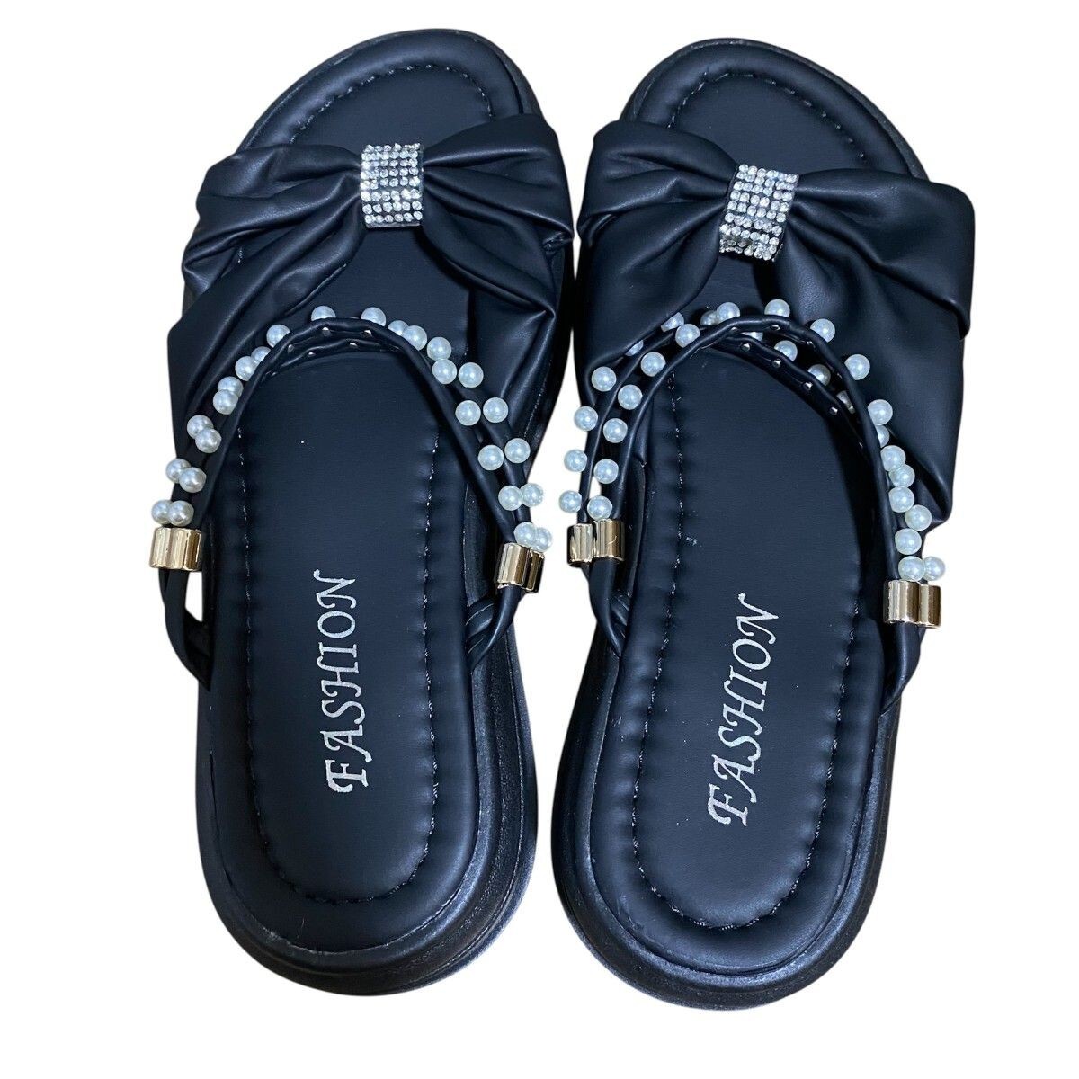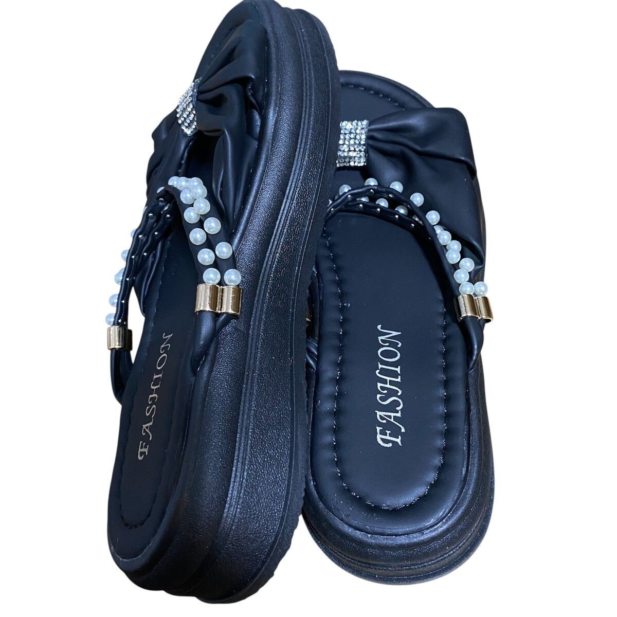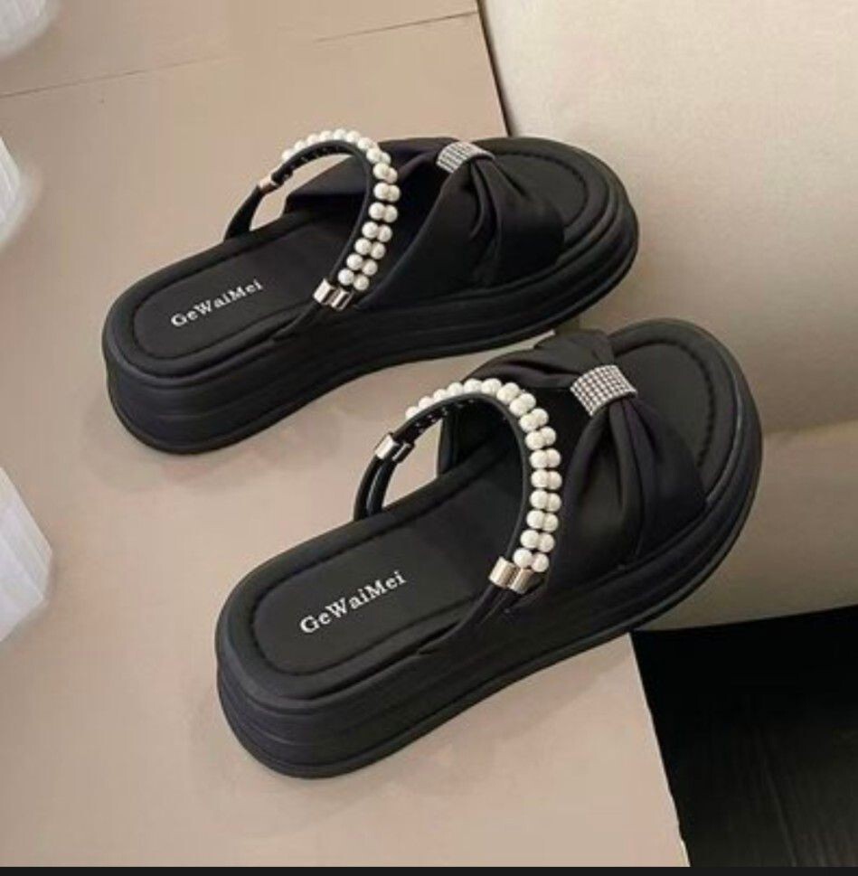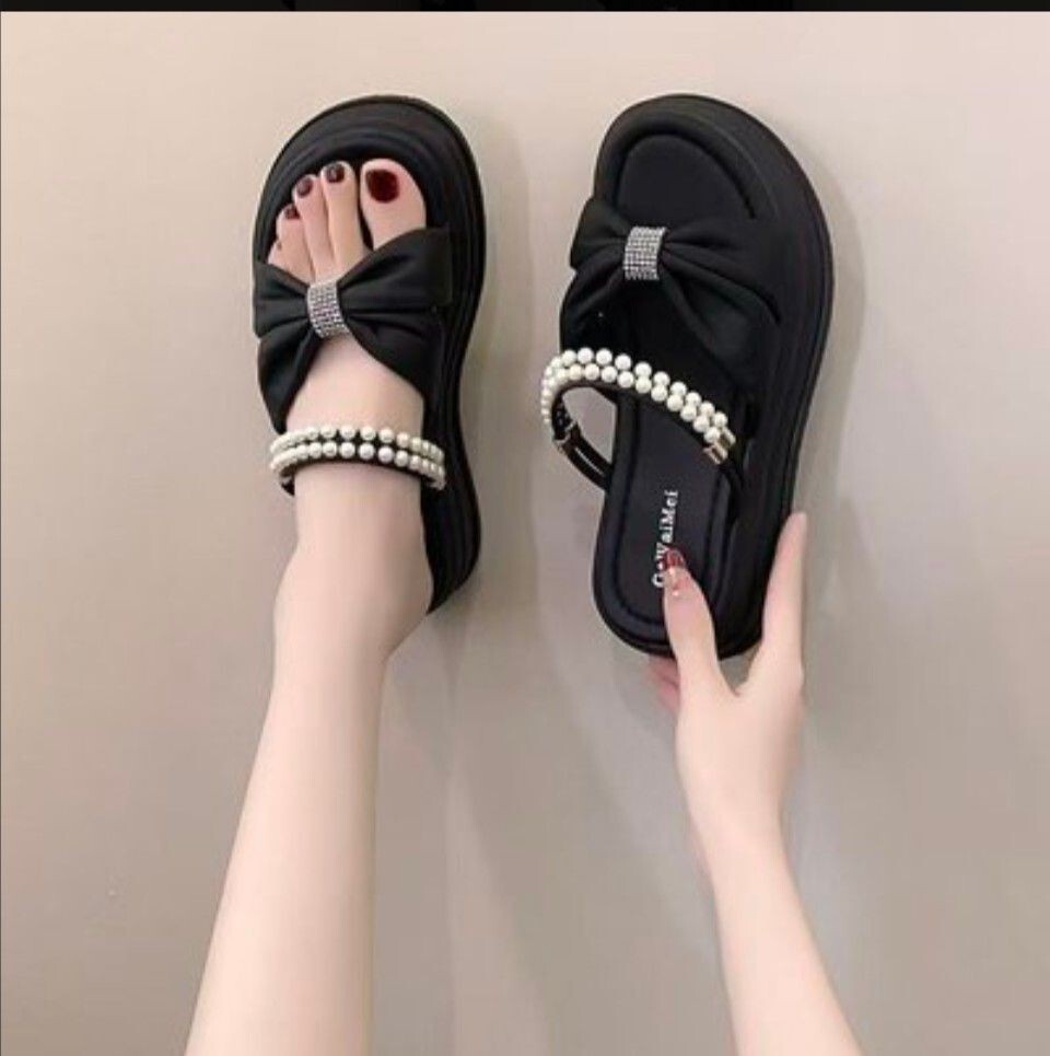 パールのストラップは、甲にかけても、かかとにひっかけても使える2way仕様!