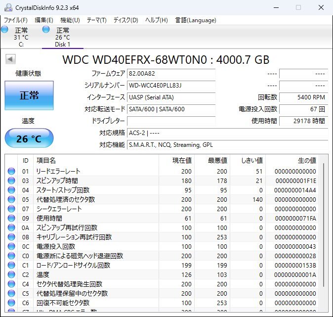 商品説明 | WDC WD40EFRX-68WT0N0 : 4000.7 GB 電源投入回数 67回 使用時間 29178時間 健康状態 正常 ★HDD詳細は、CrystalDiskInfo 画像をご覧ください、正常判定品です |